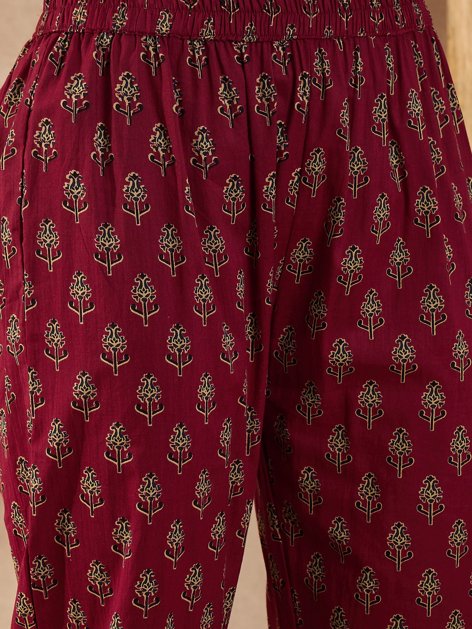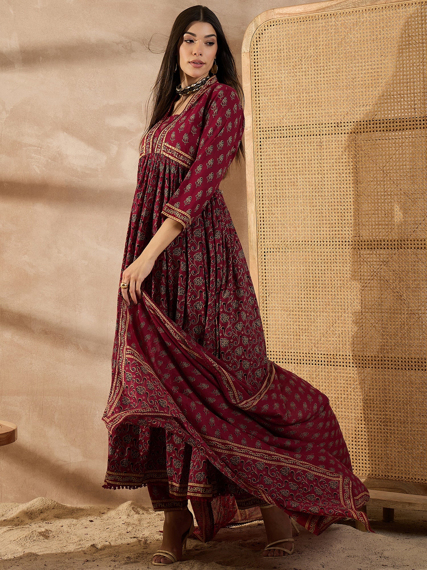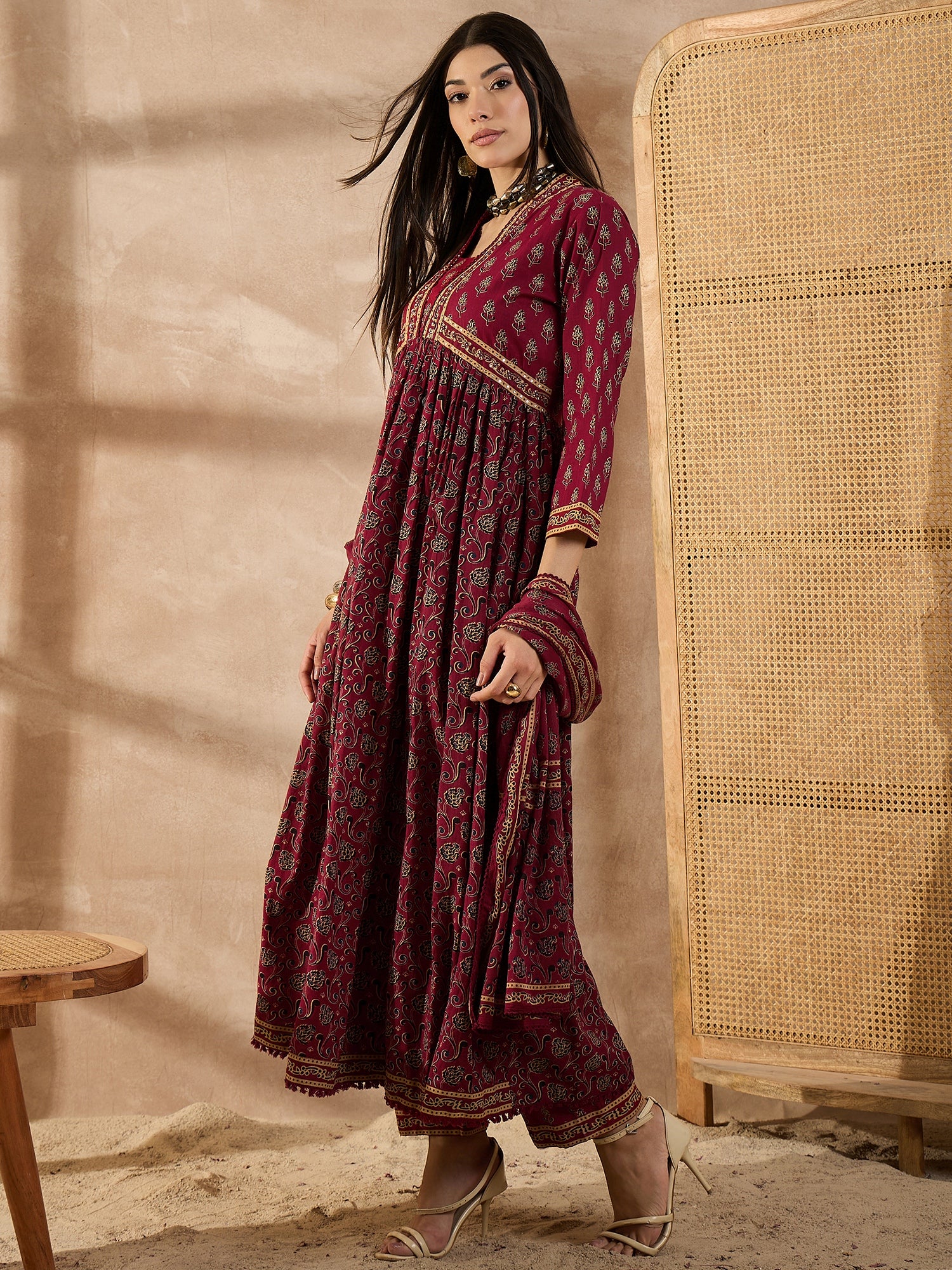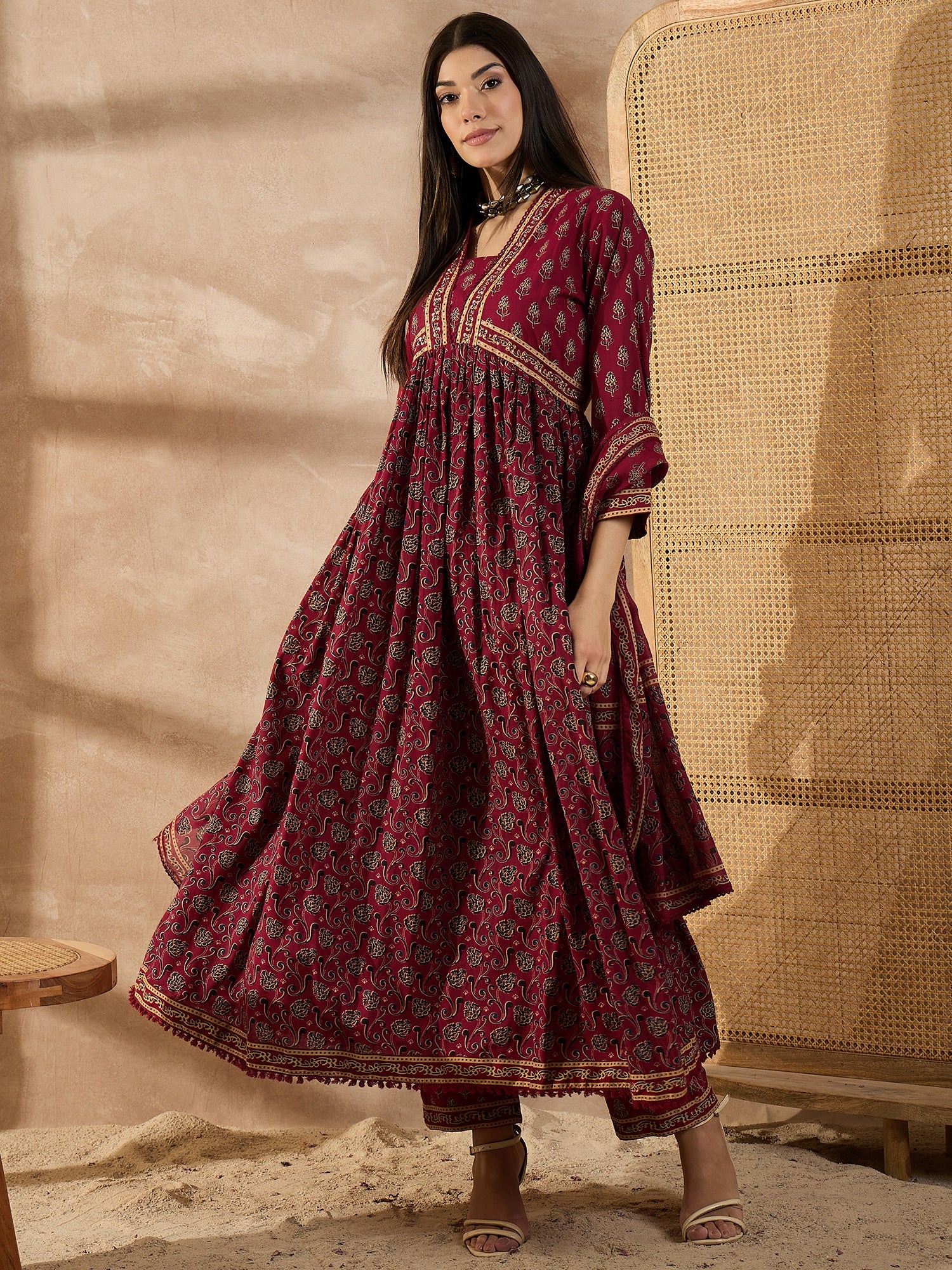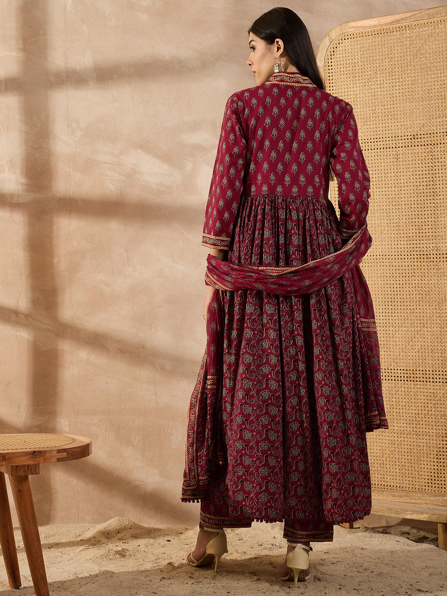Floral Printed Sequinned Pleated Anarkali Pure Cotton Kurta With Trousers & Dupatta