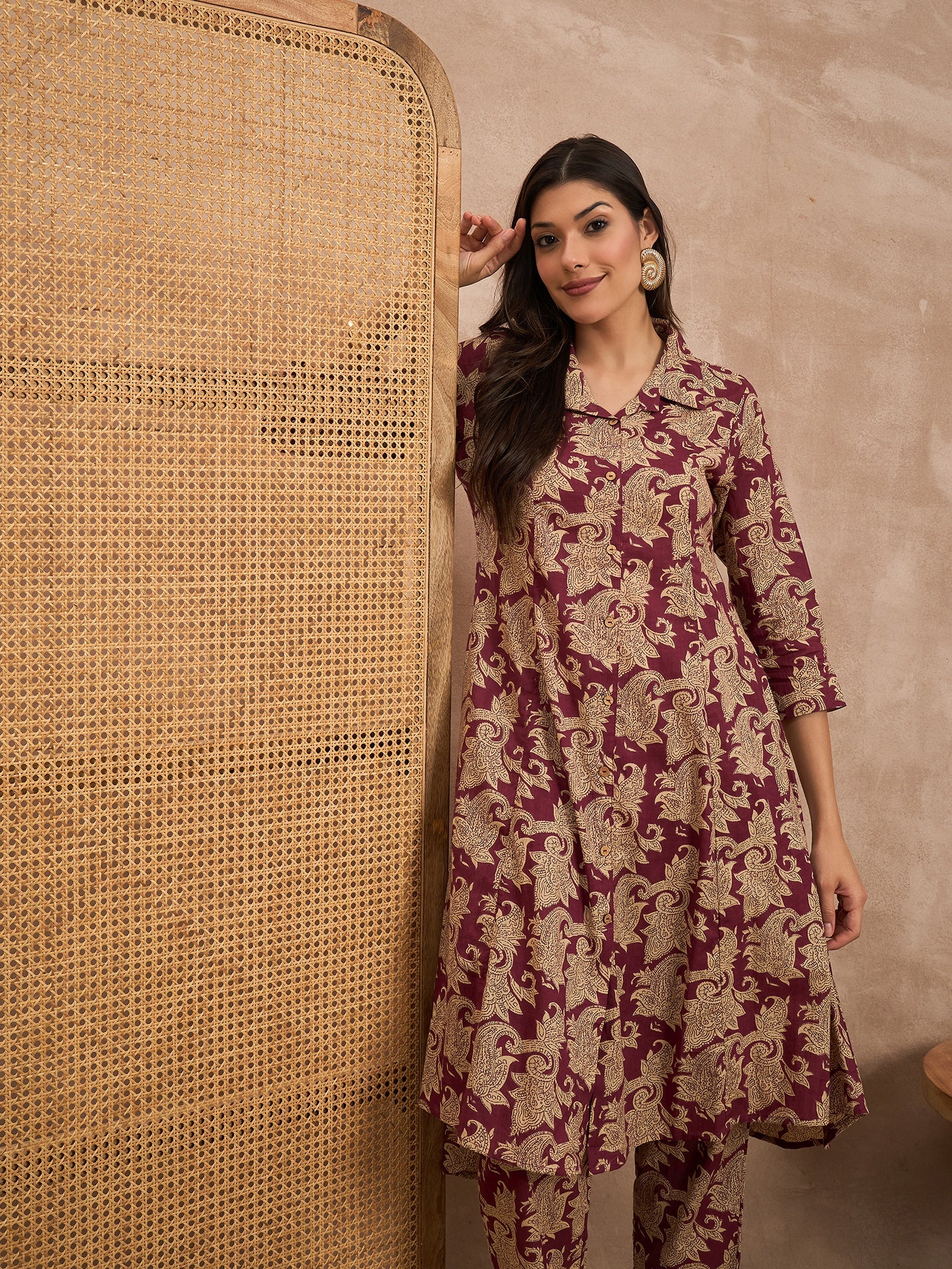Maroon and cream-colored floral printed tunic, has shirt collar neck and three quarter sleeves and 1 pocket