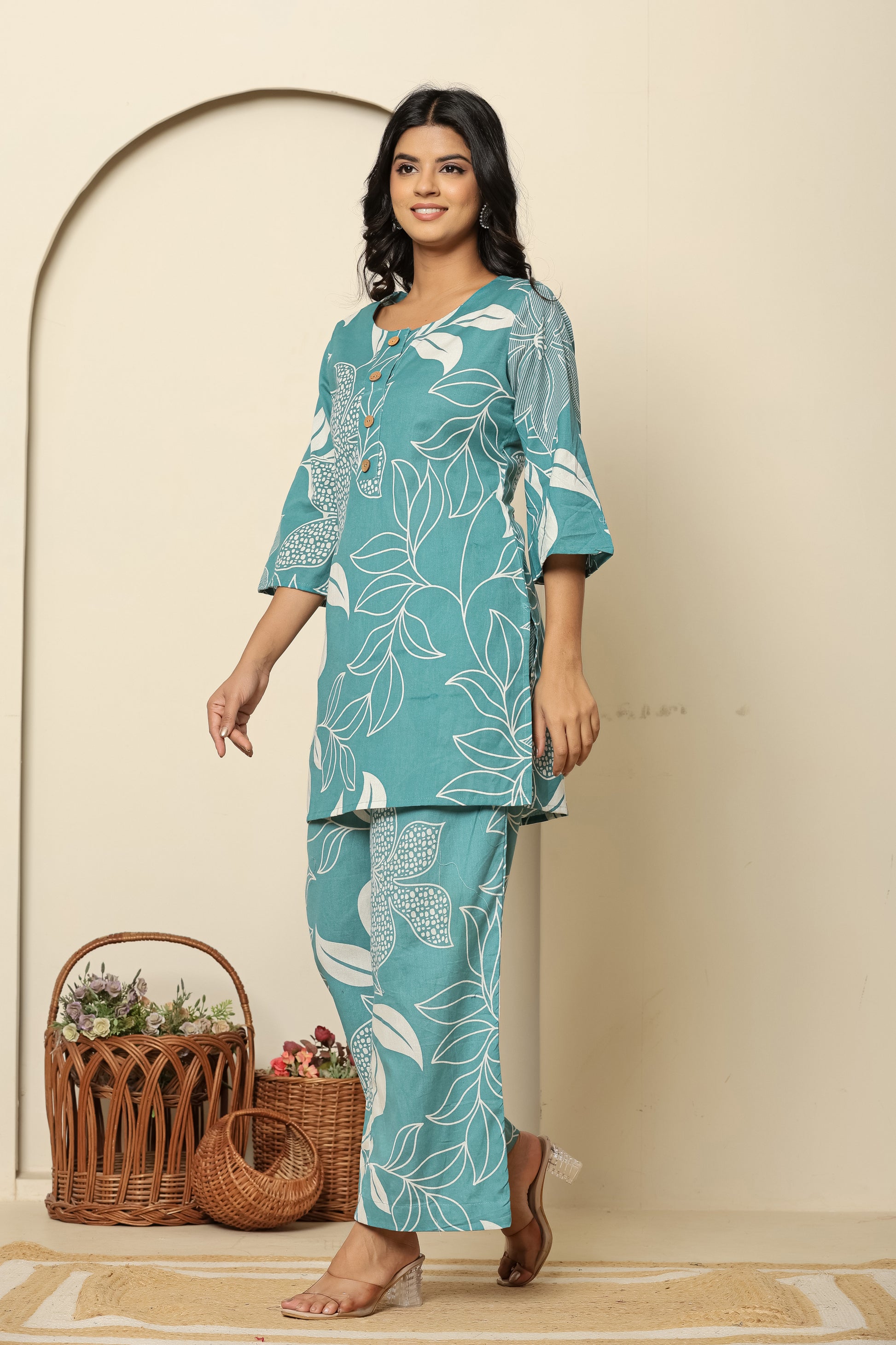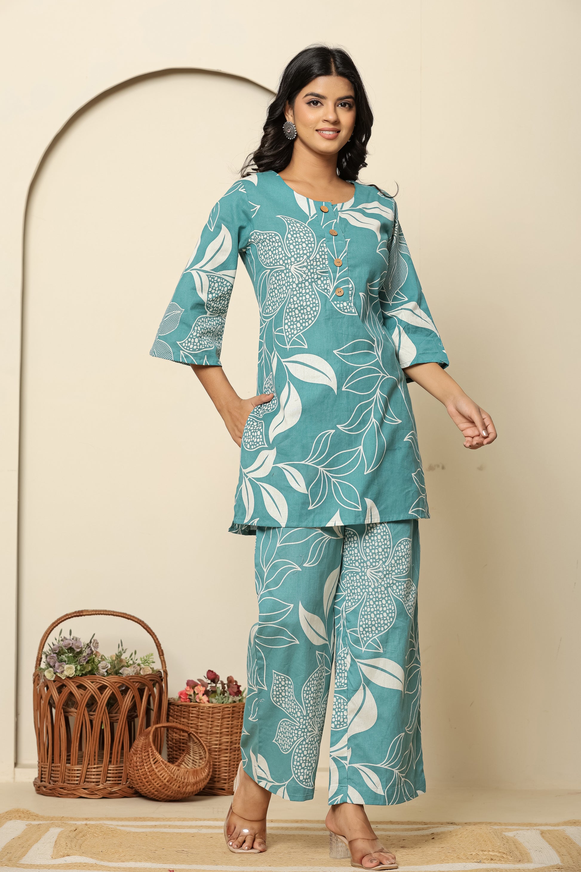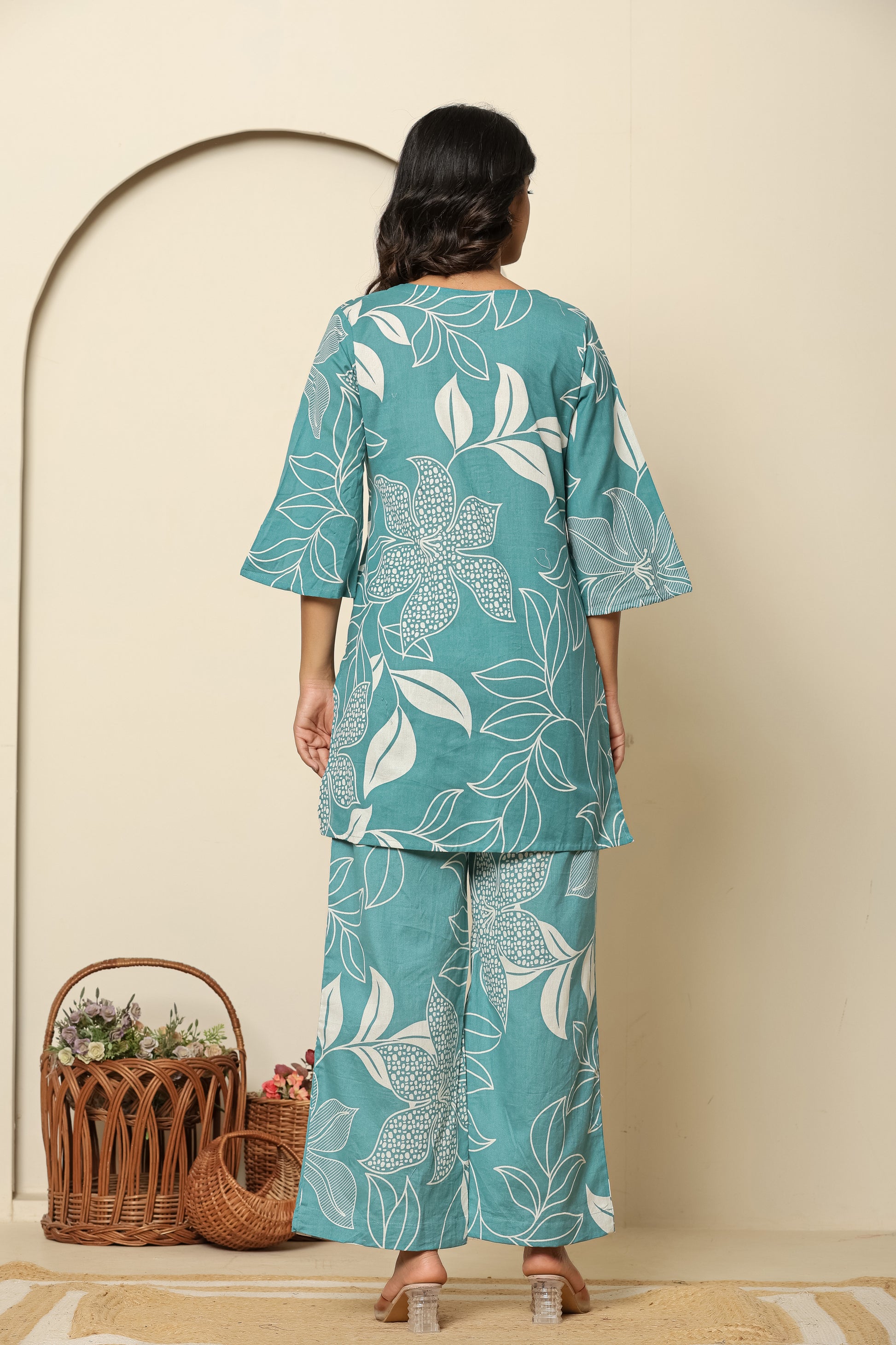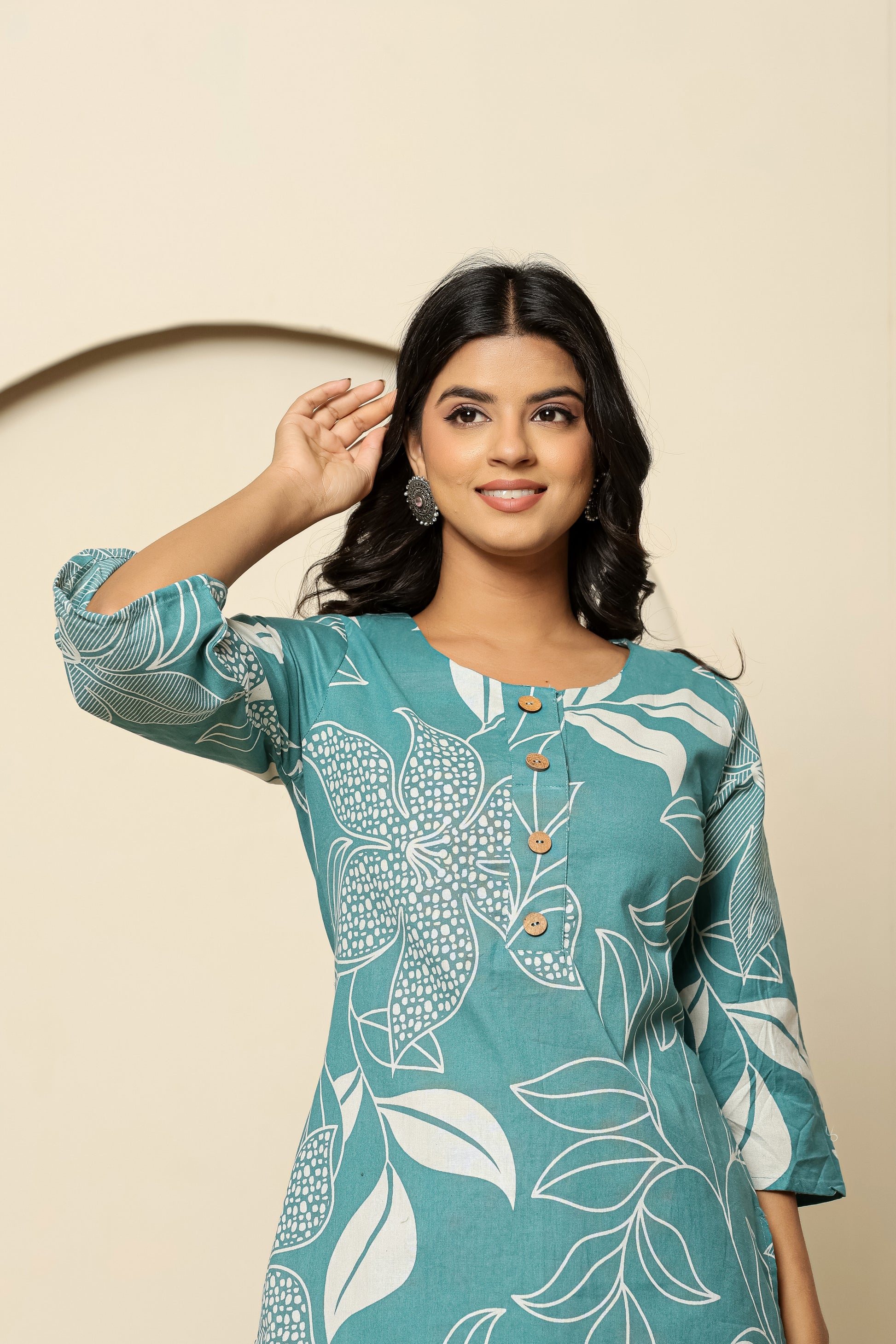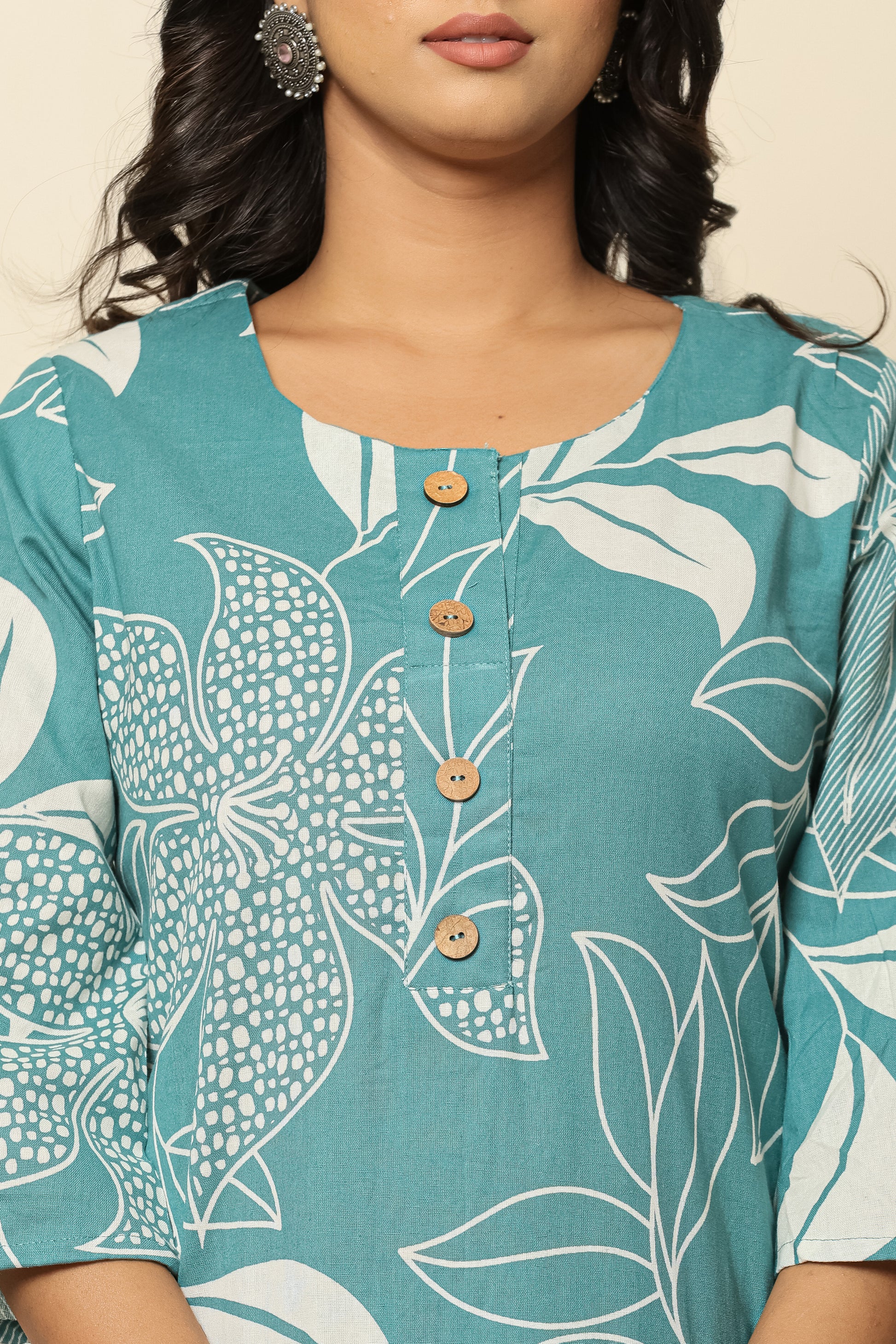 Blue and white printed tunic, as round neck,, three quarter sleeves