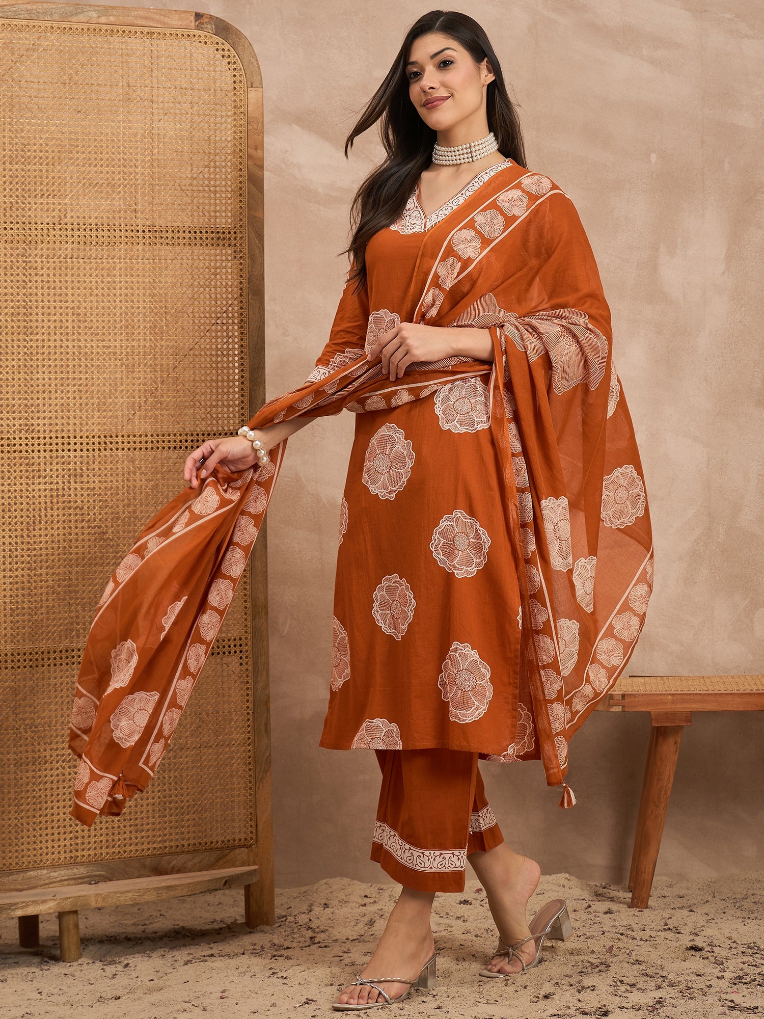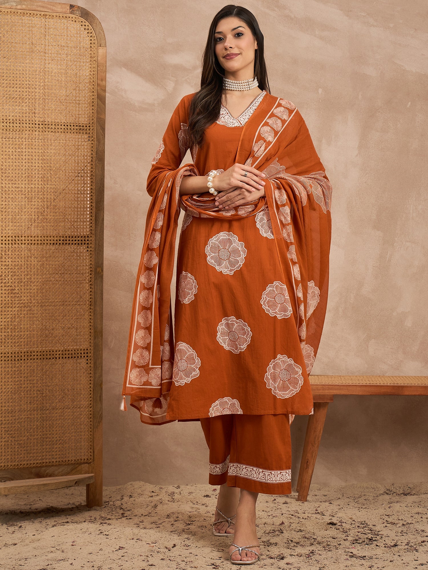 Floral Printed V-Neck Sequinned Pure Cotton Kurta With Trousers & Dupatta