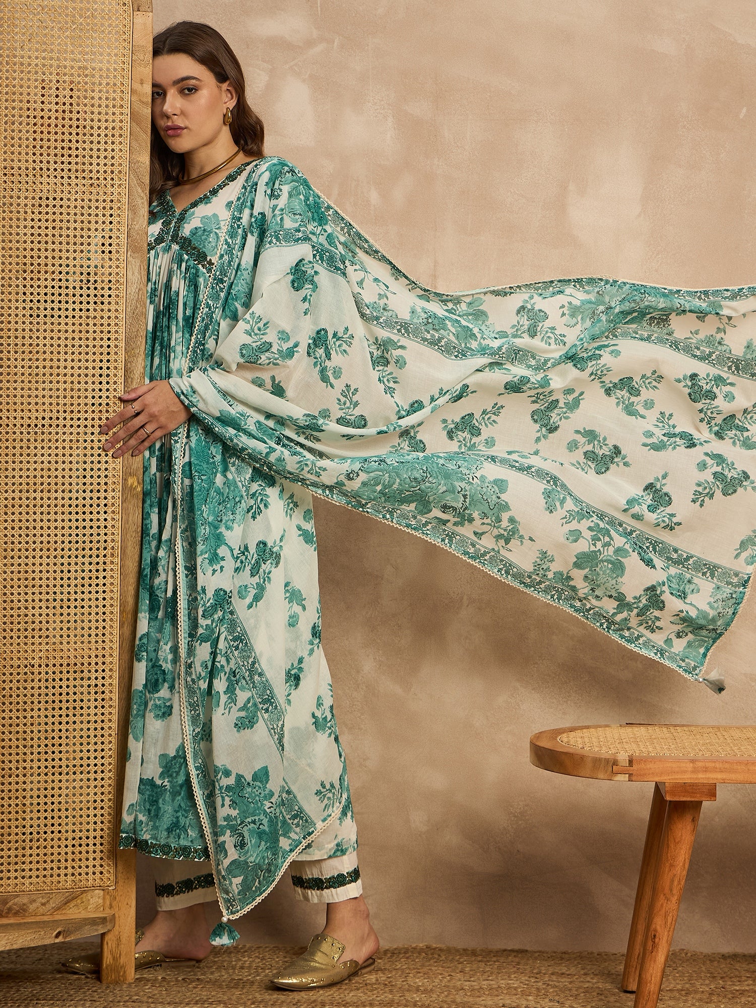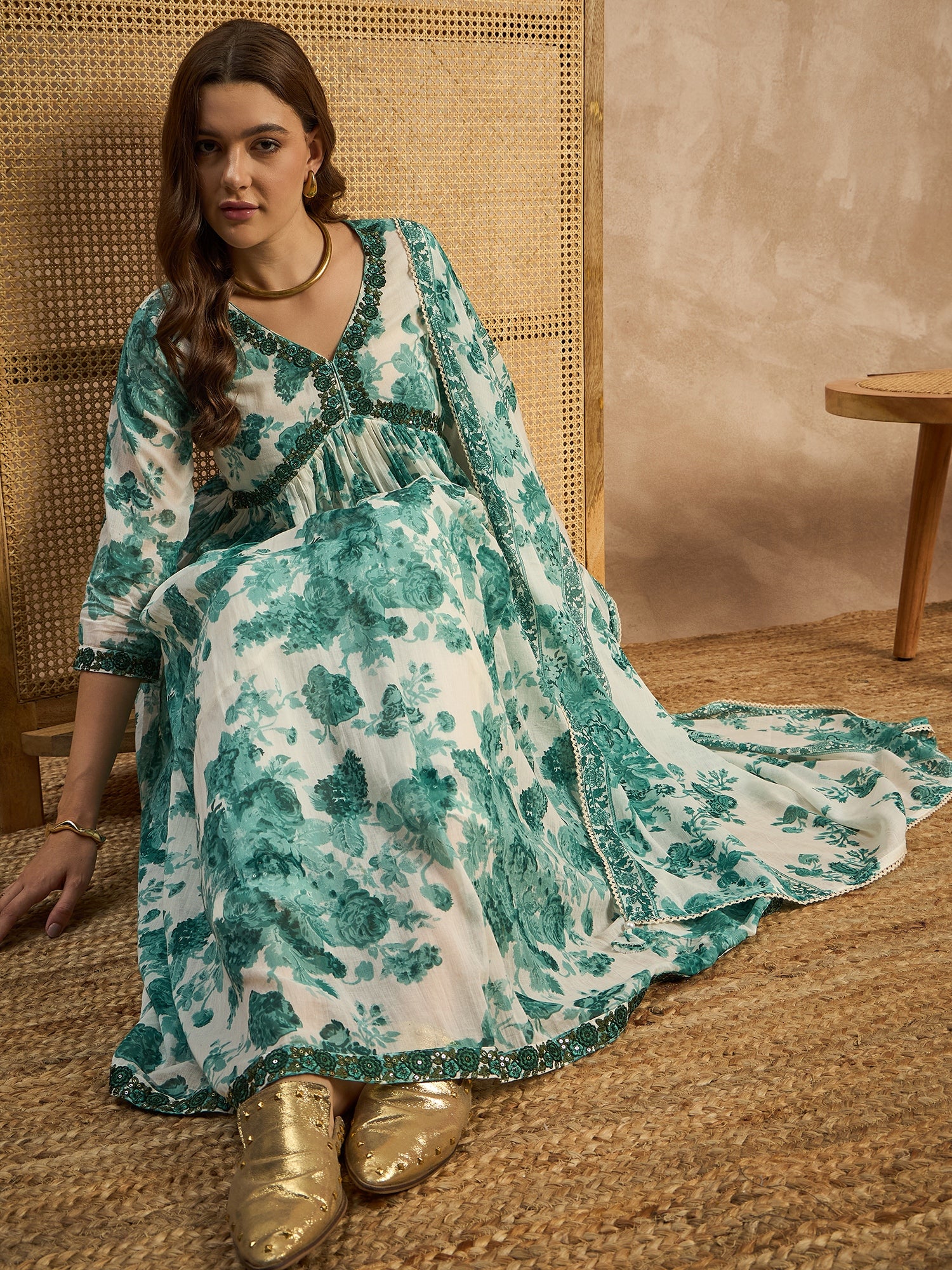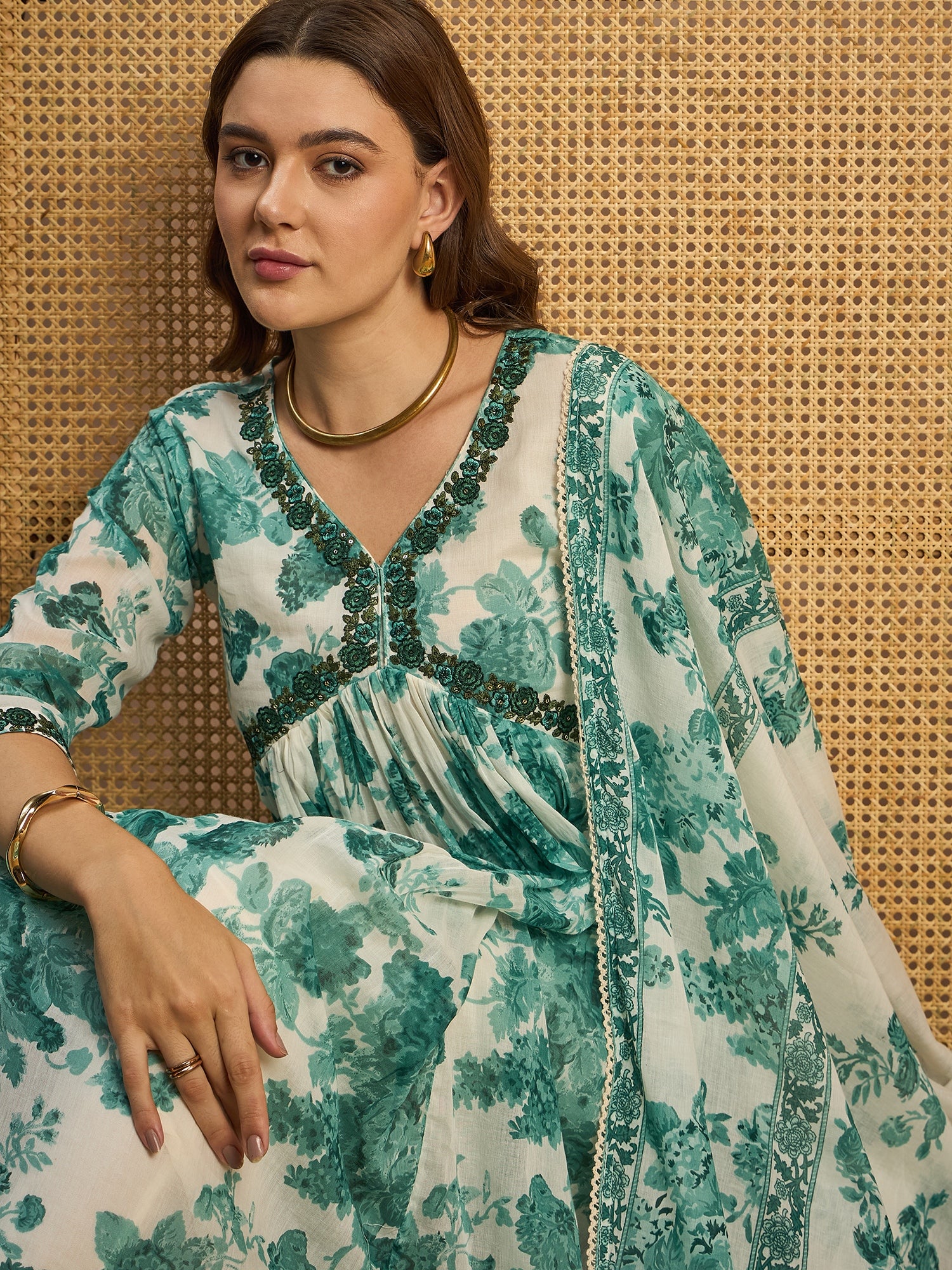 Floral Printed V-Neck Thread Work Empire Anarkali Kurta With Trousers & Dupatta
