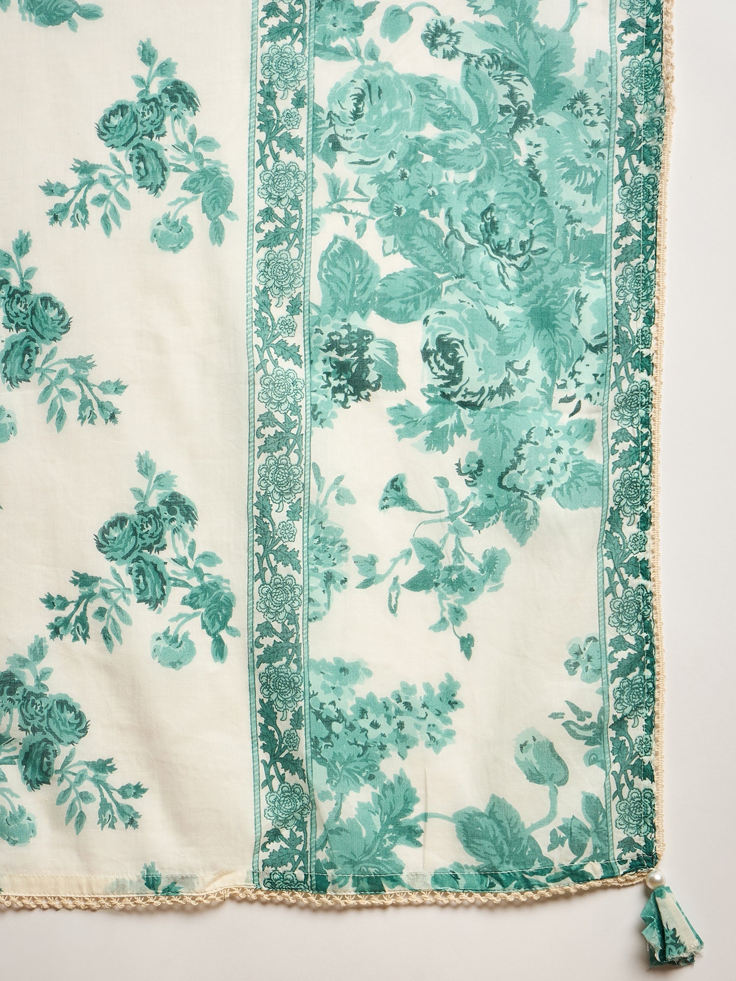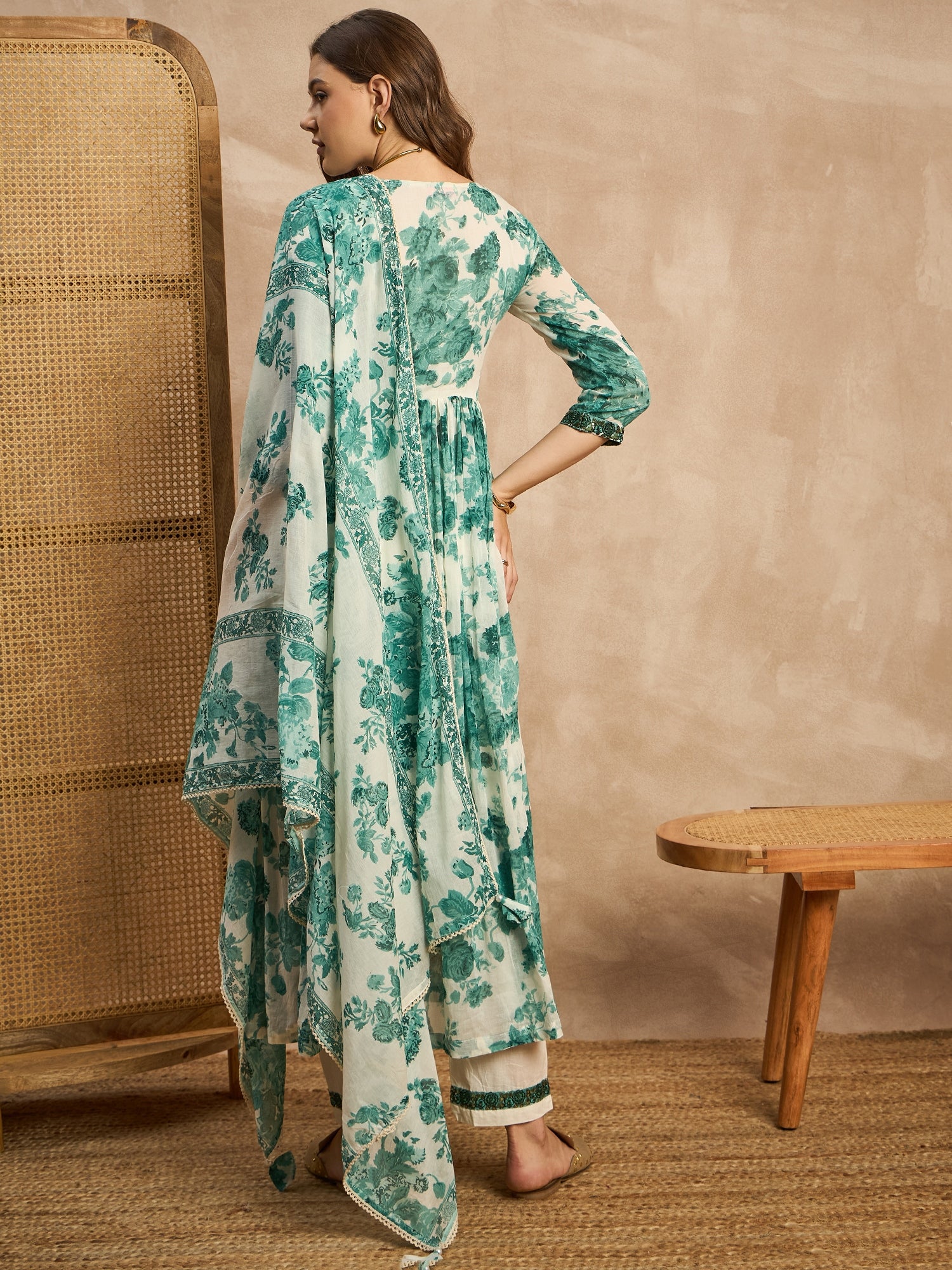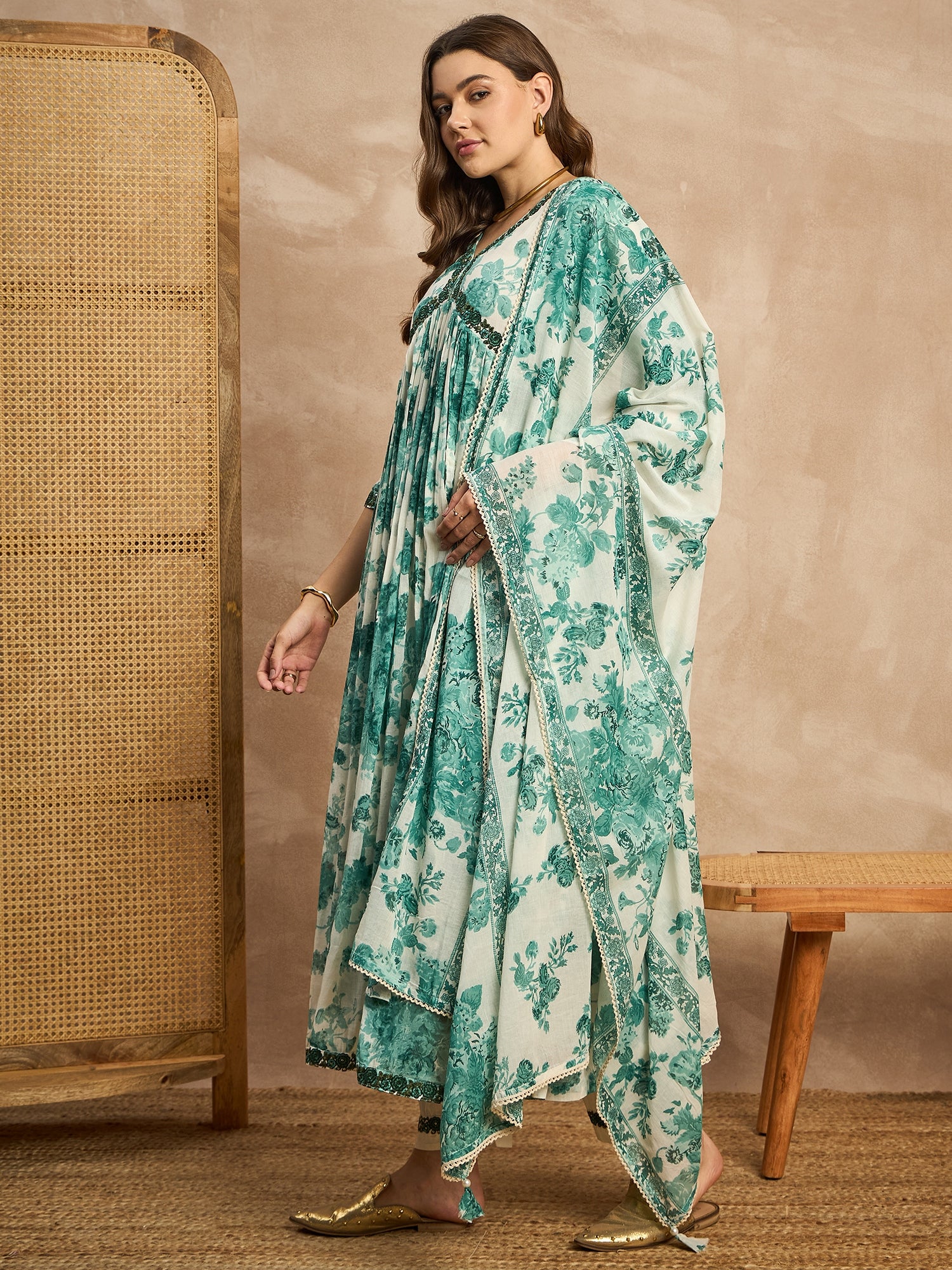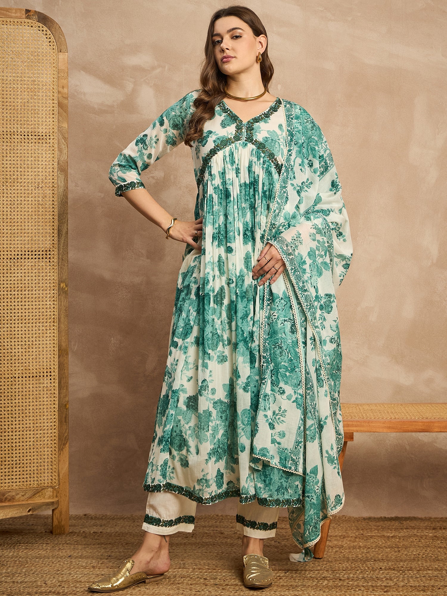 Floral Printed V-Neck Thread Work Empire Anarkali Kurta With Trousers & Dupatta