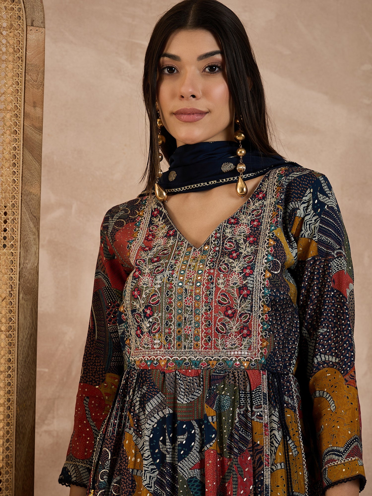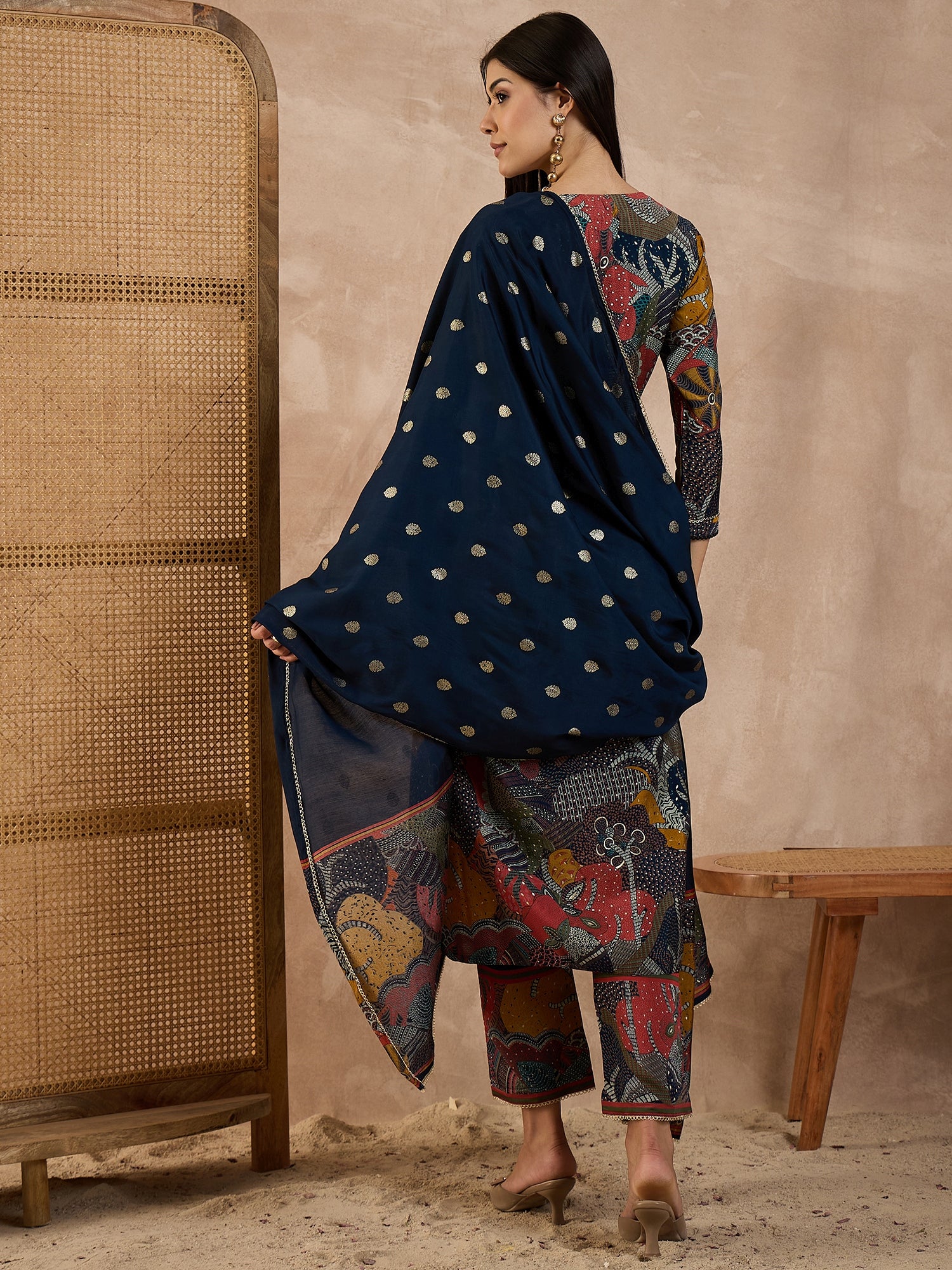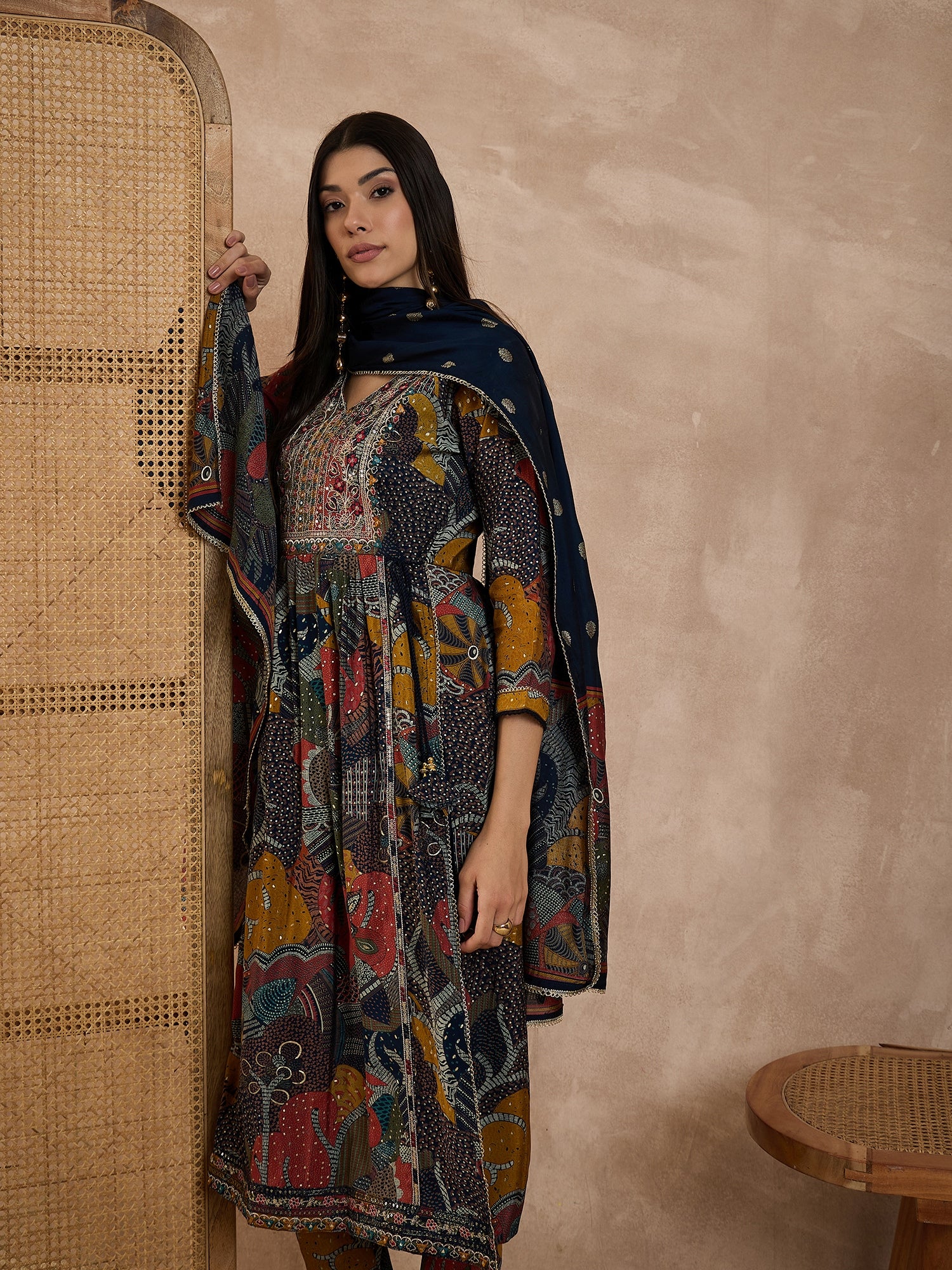 Red, navy blue and yellow printed Kurta with Trousers & dupatta