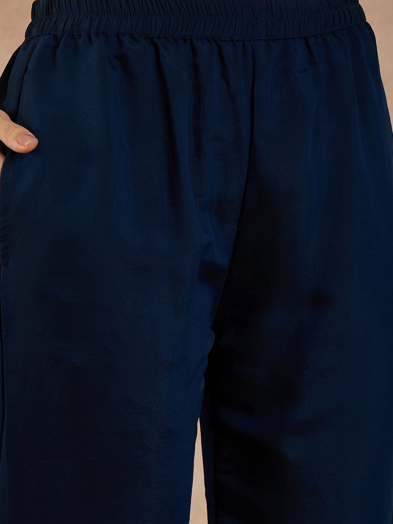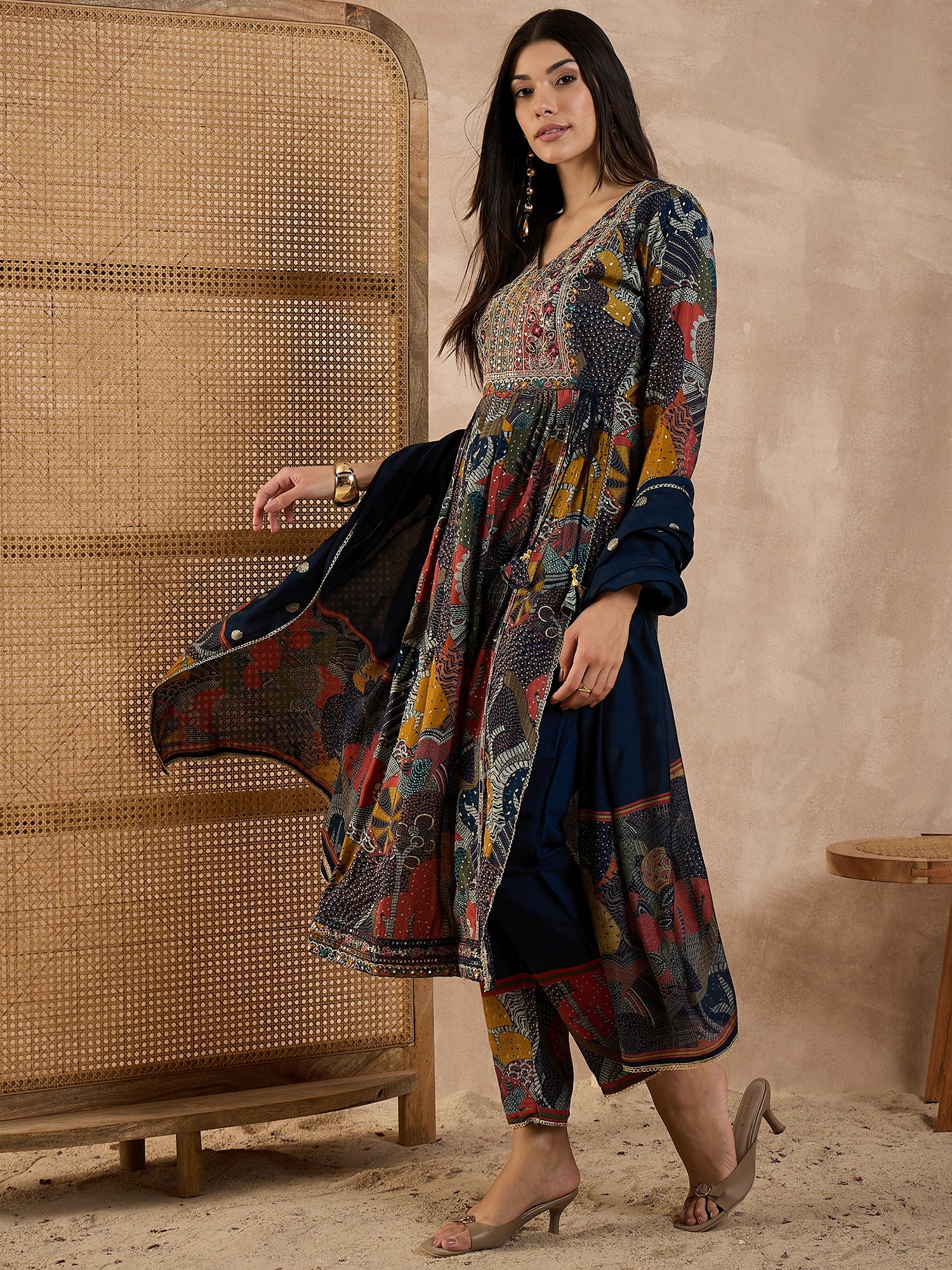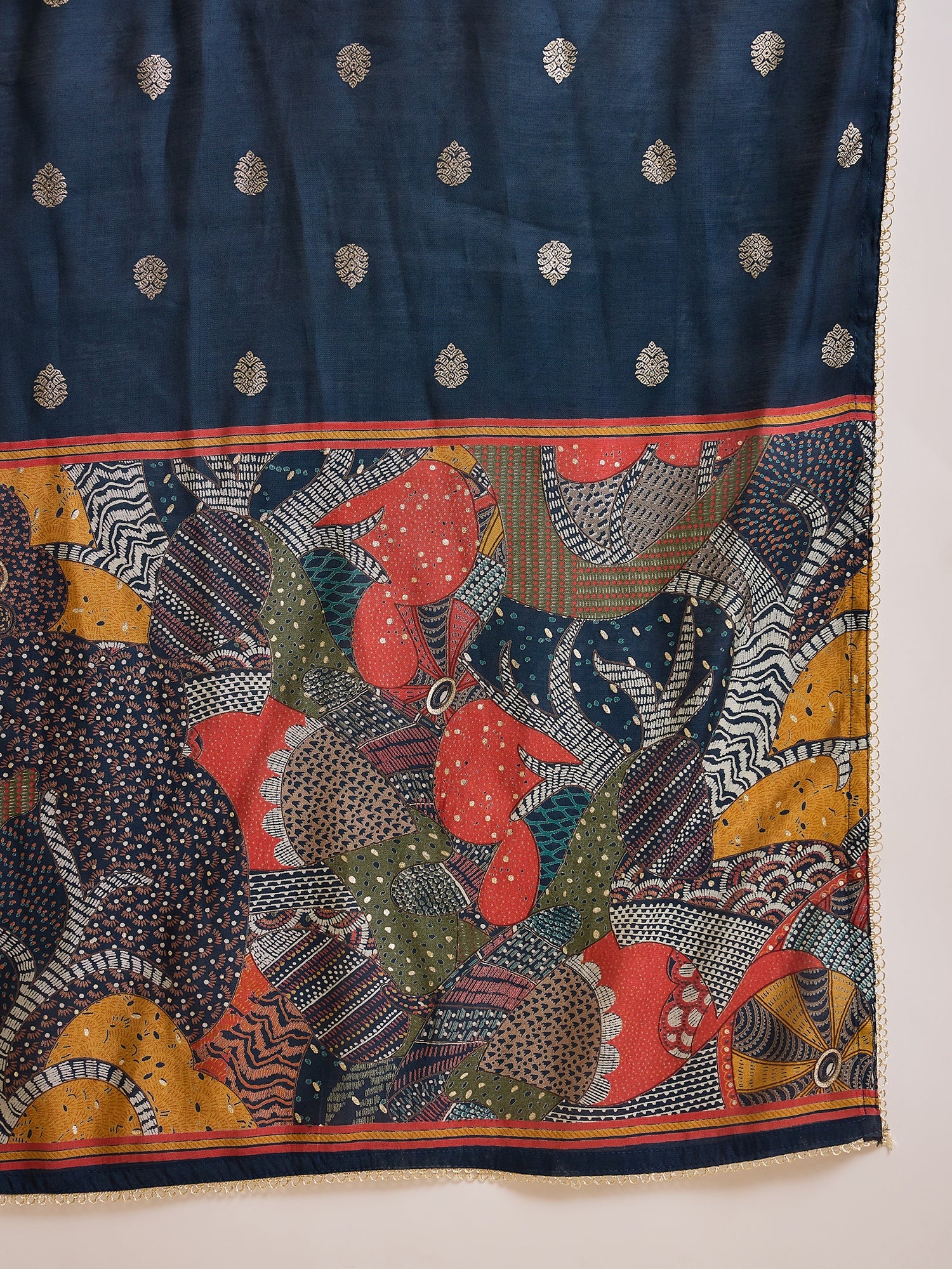 Red, navy blue and yellow printed Kurta with Trousers & dupatta