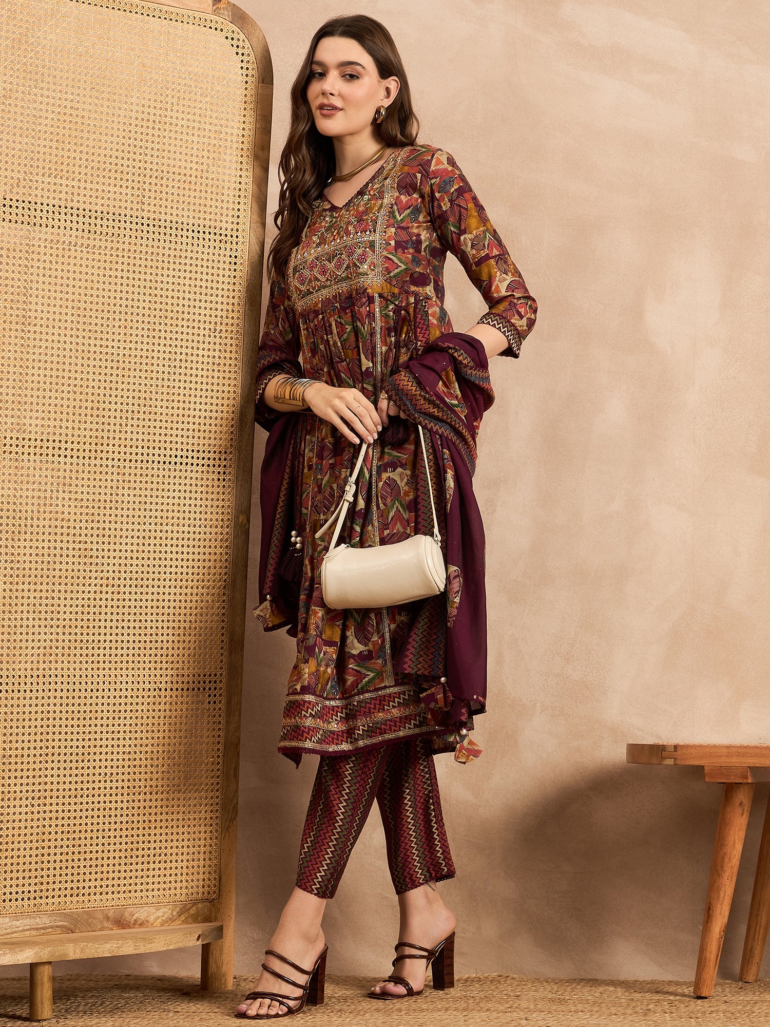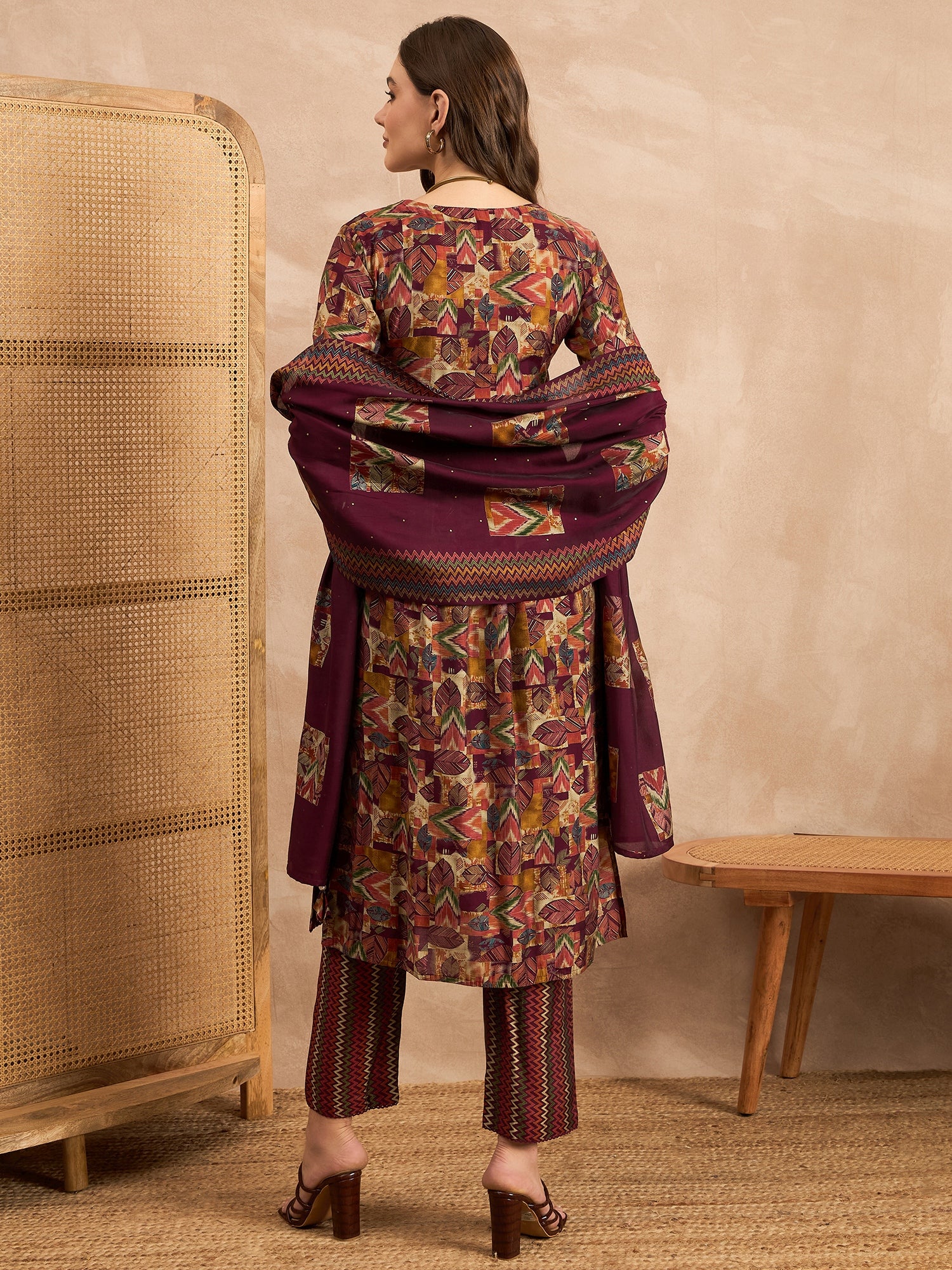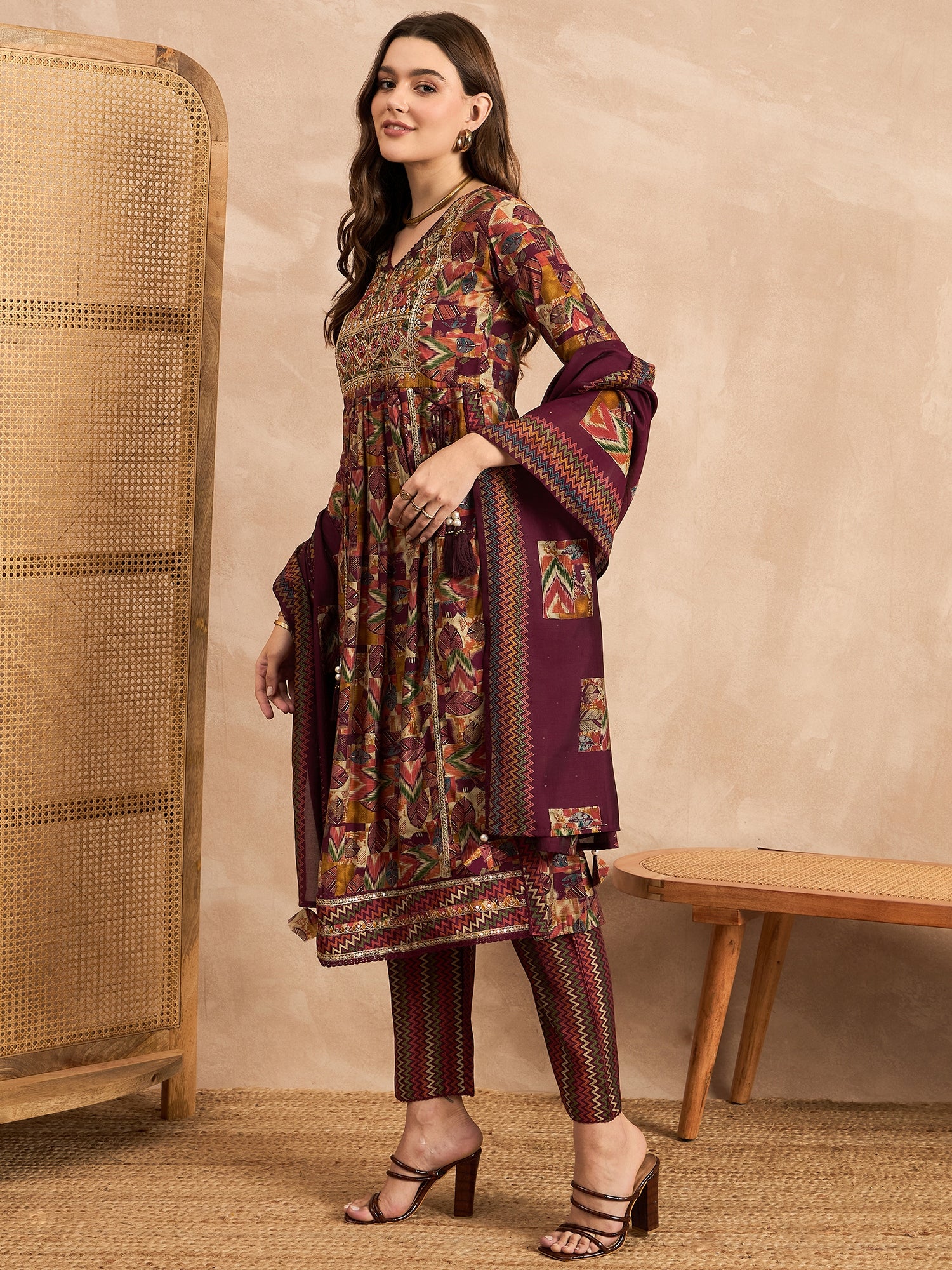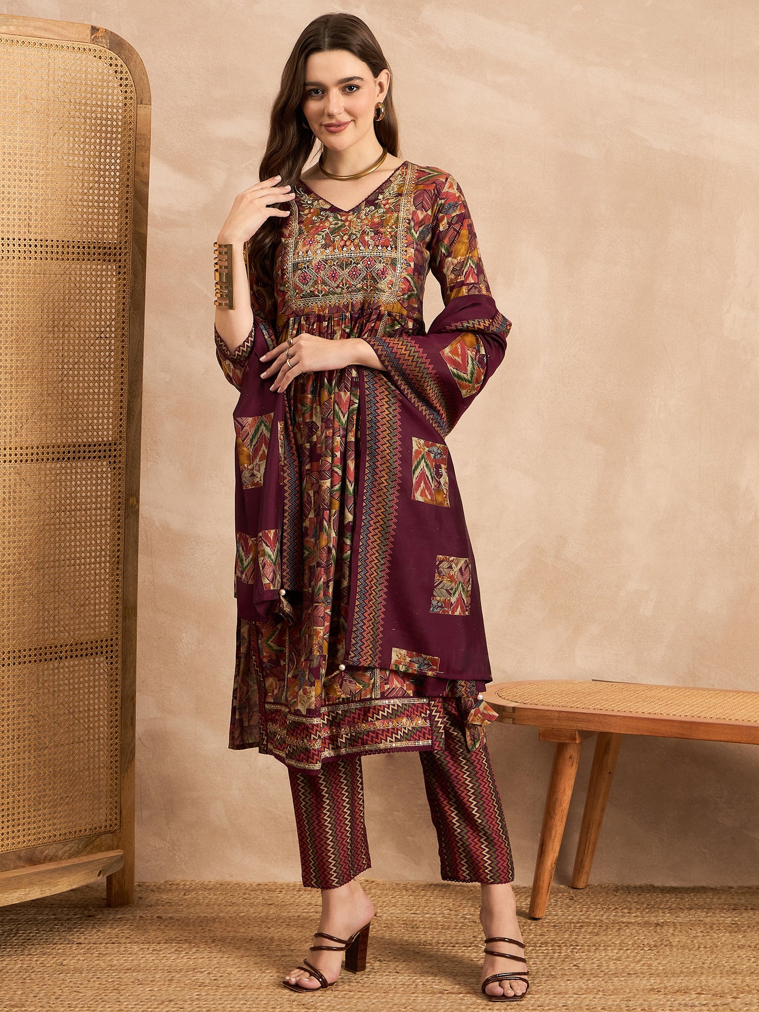 Maroon,Green and Beige Printed Kurta with Trousers & Dupatta