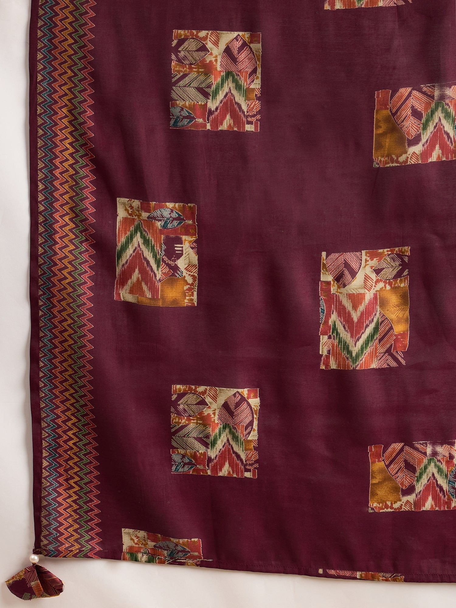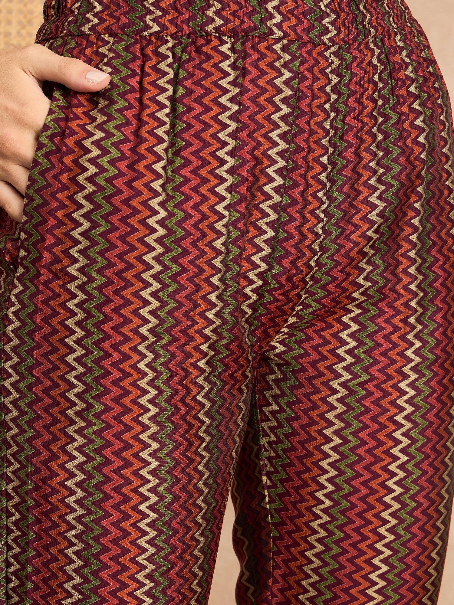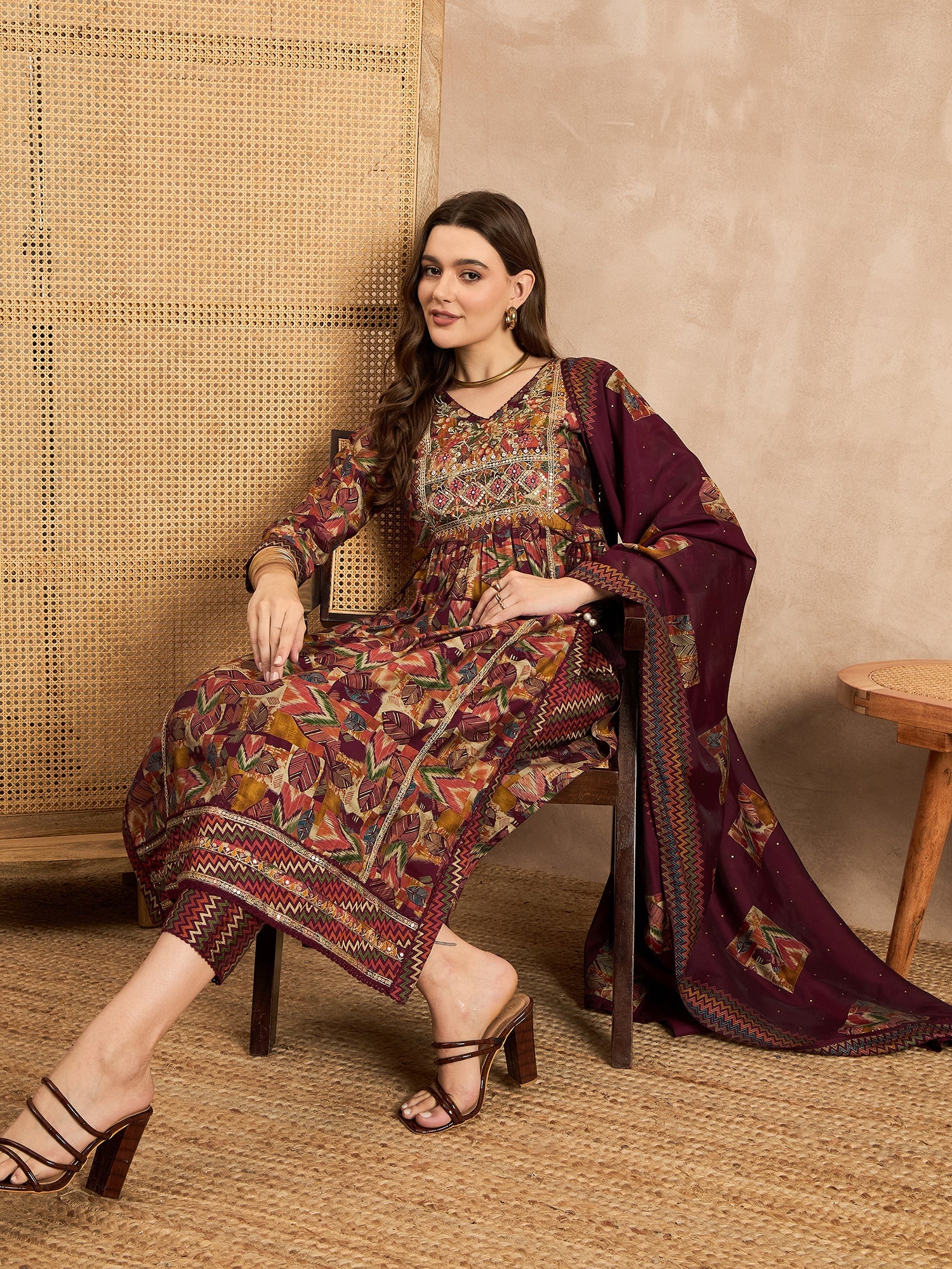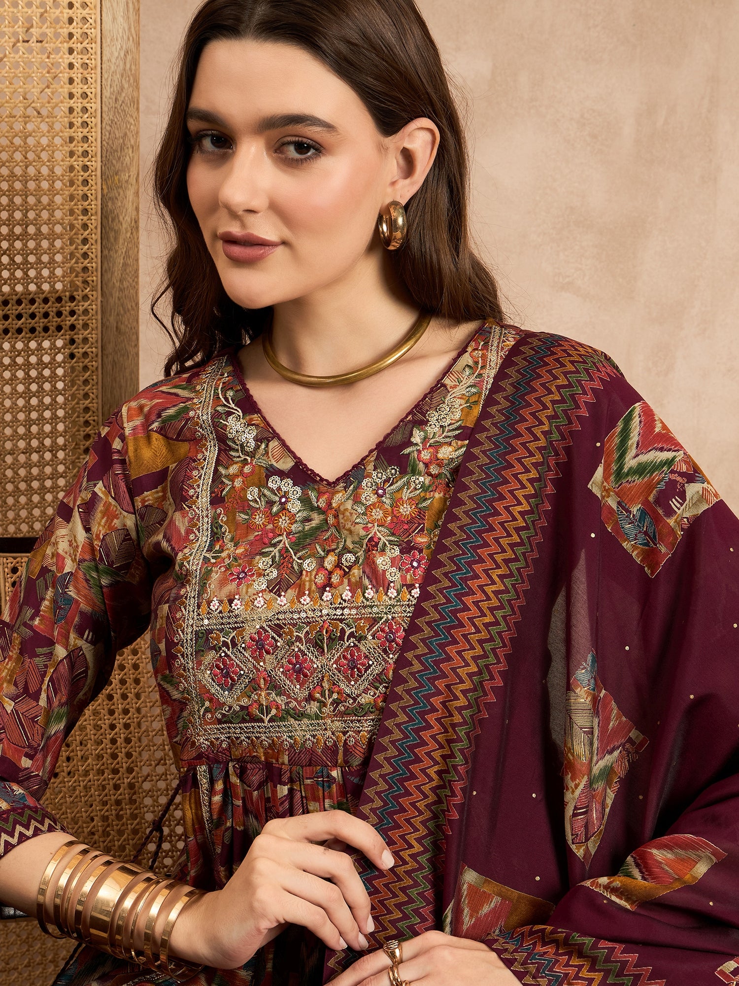 Maroon,Green and Beige Printed Kurta with Trousers & Dupatta