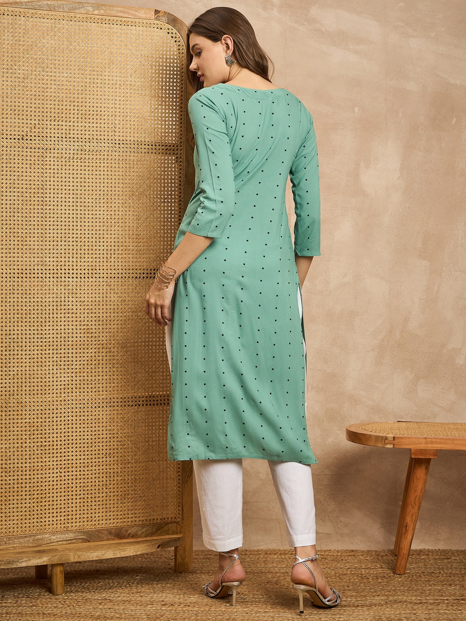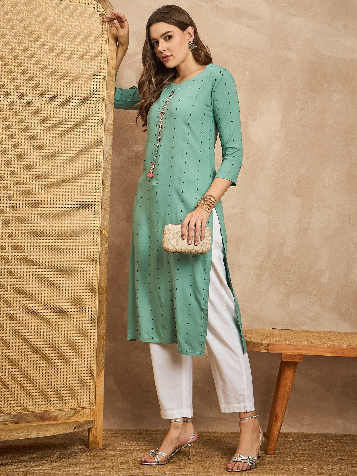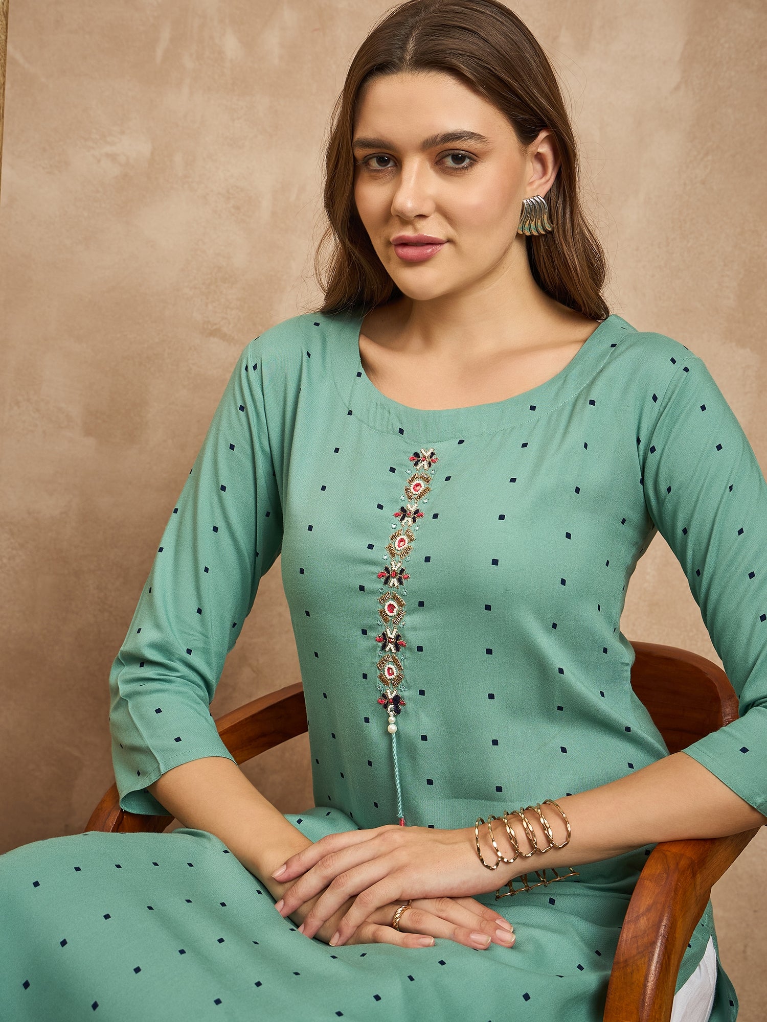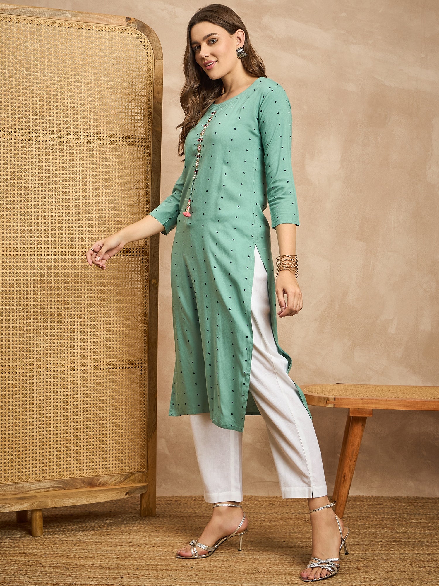Polka Dots Printed Beads and Stones Straight Kurta