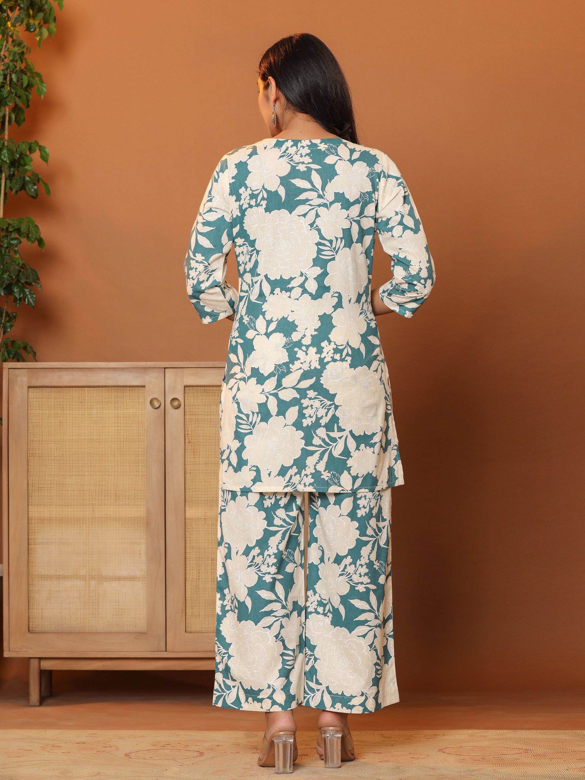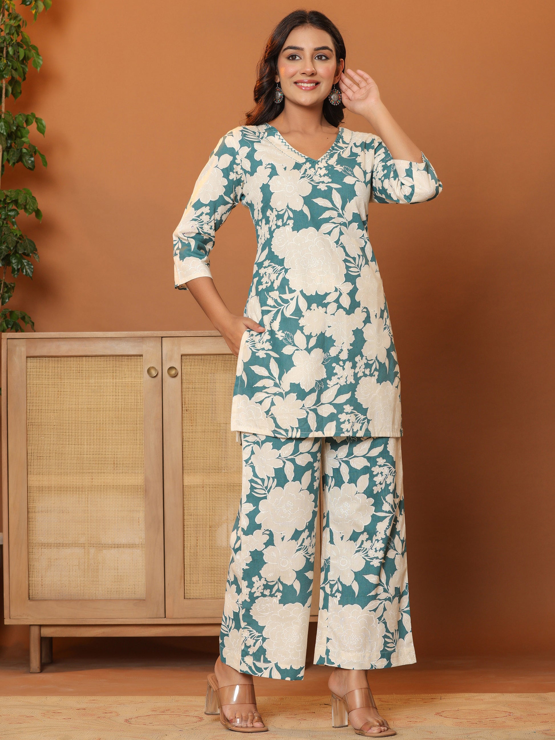 Cream-coloured and blue printed Palazzos ,has a slip-on closure