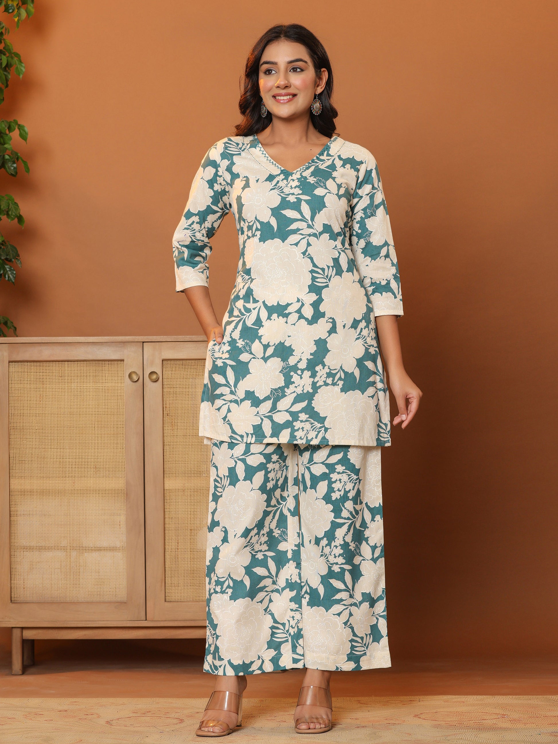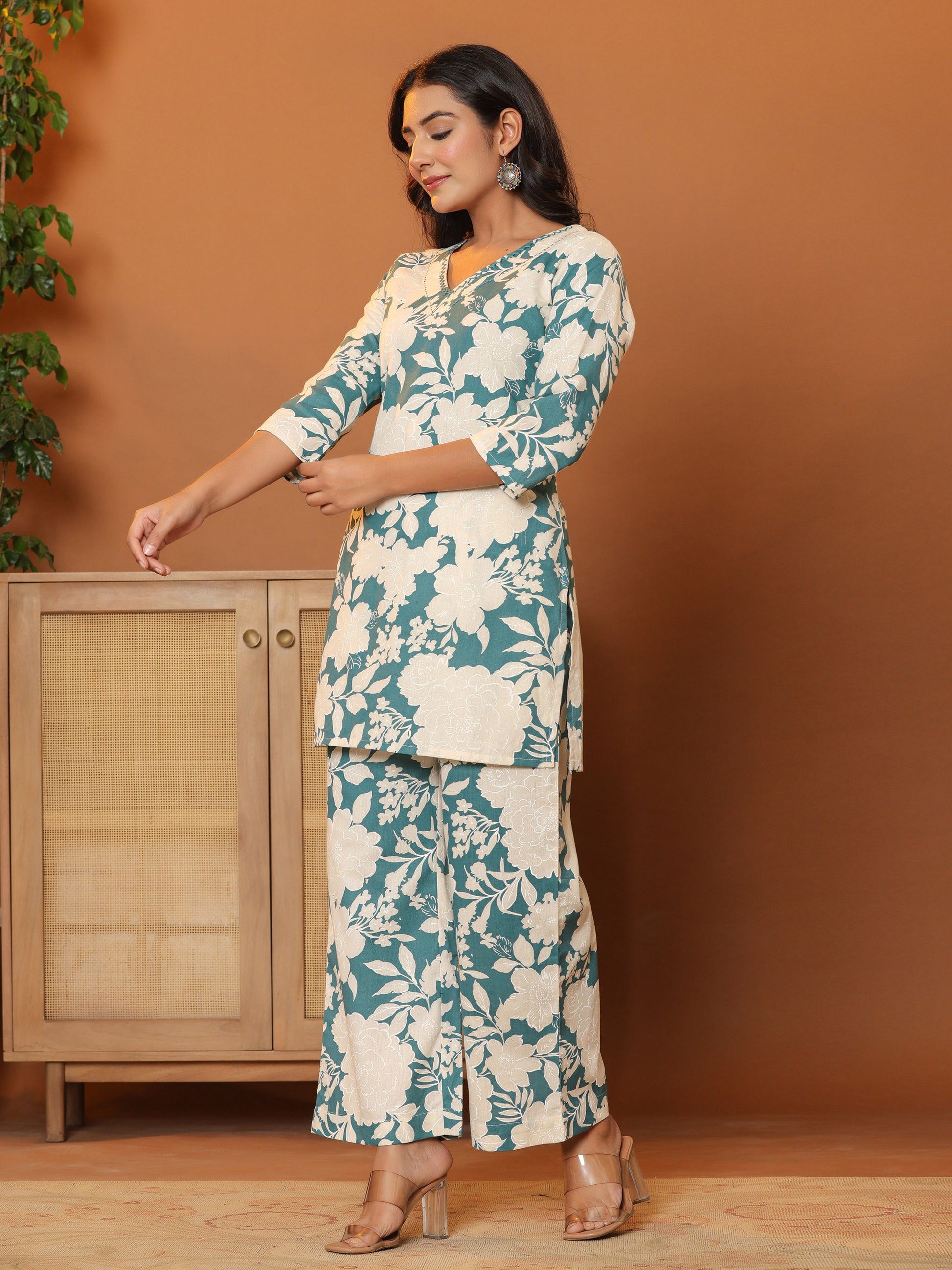 Cream-coloured and Blue printed Tunic ,has a v-neck, three-quarter sleeves