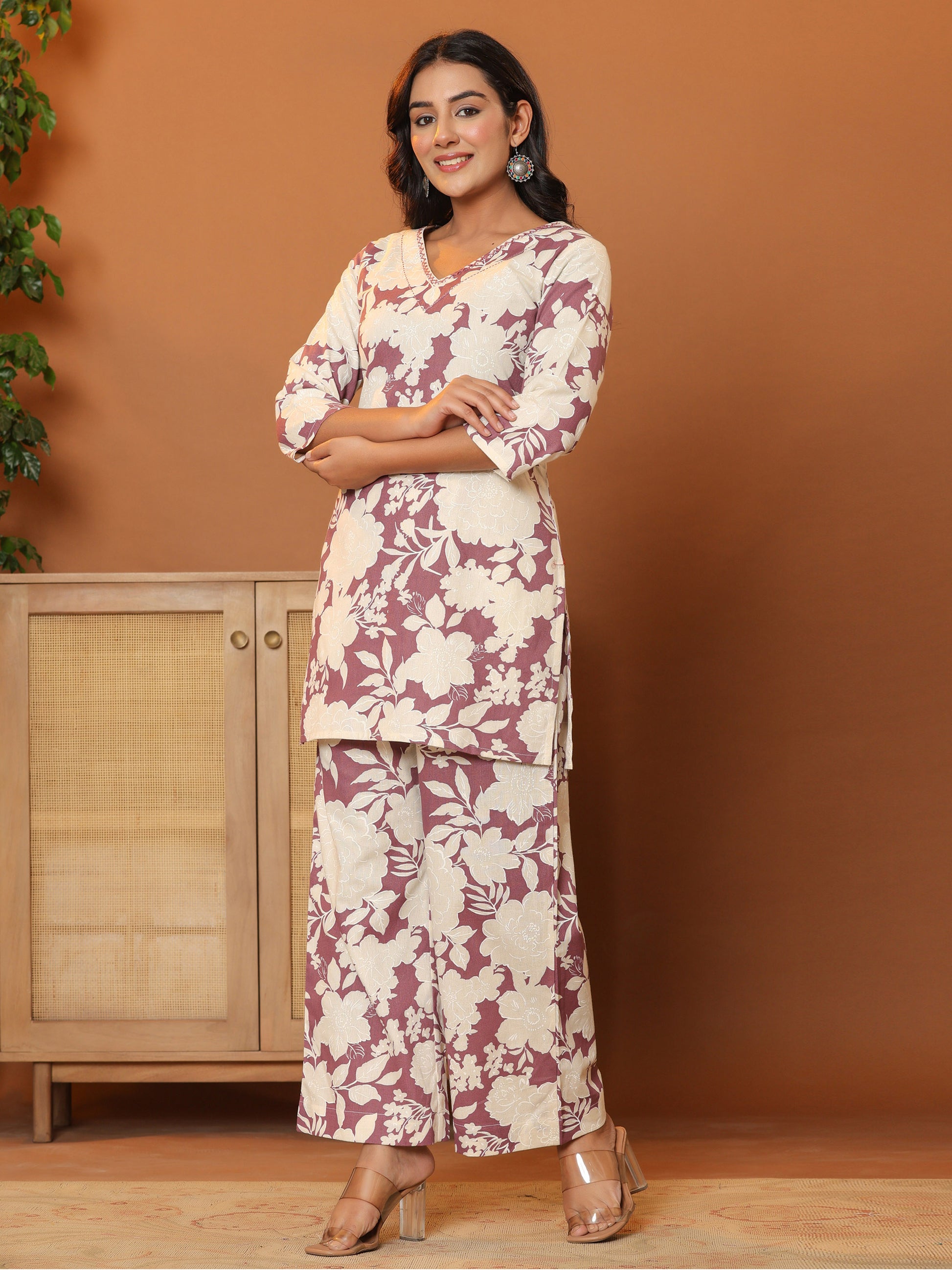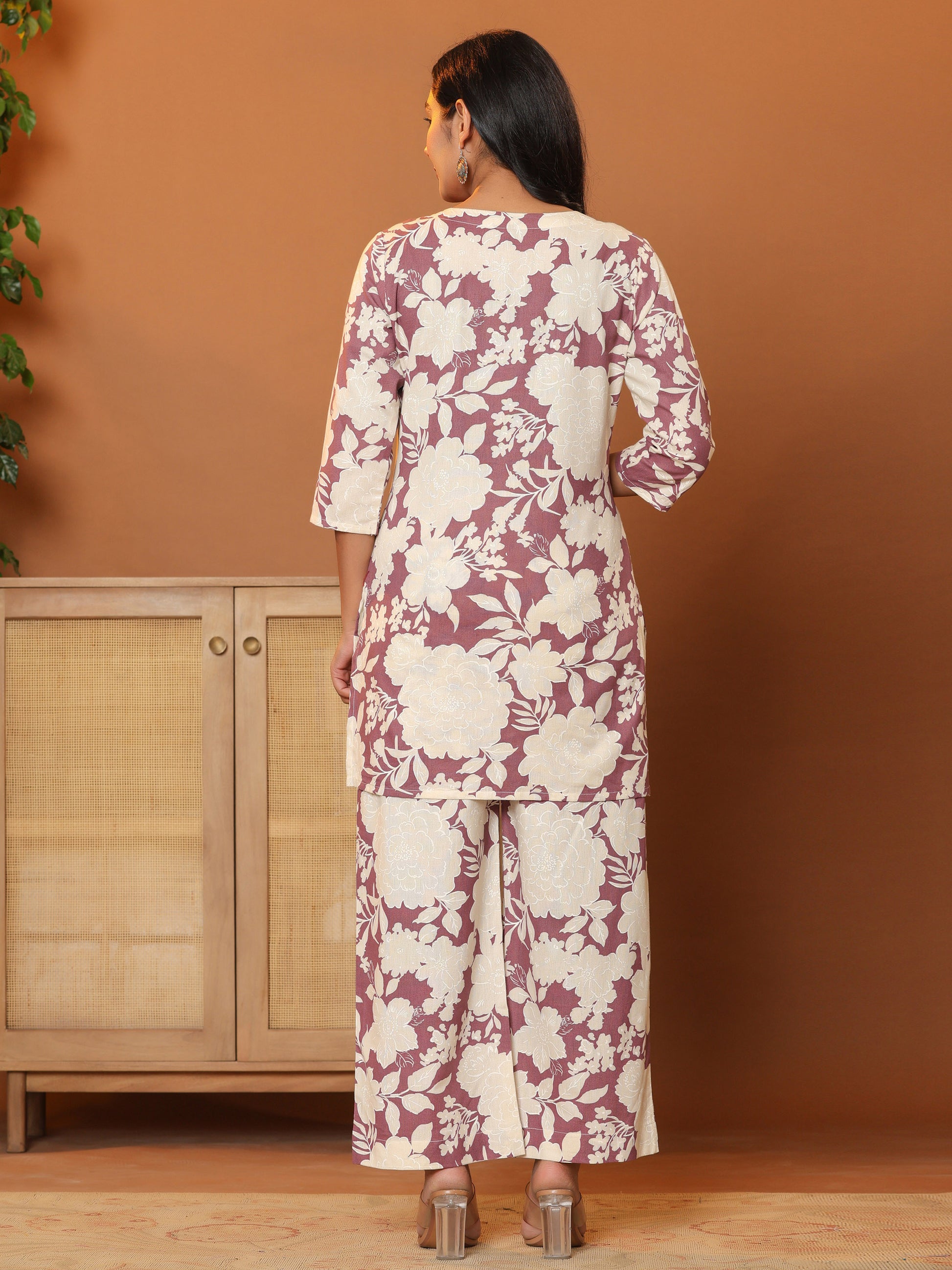 Cream-coloured and pink printed Palazzos ,has a slip-on closure