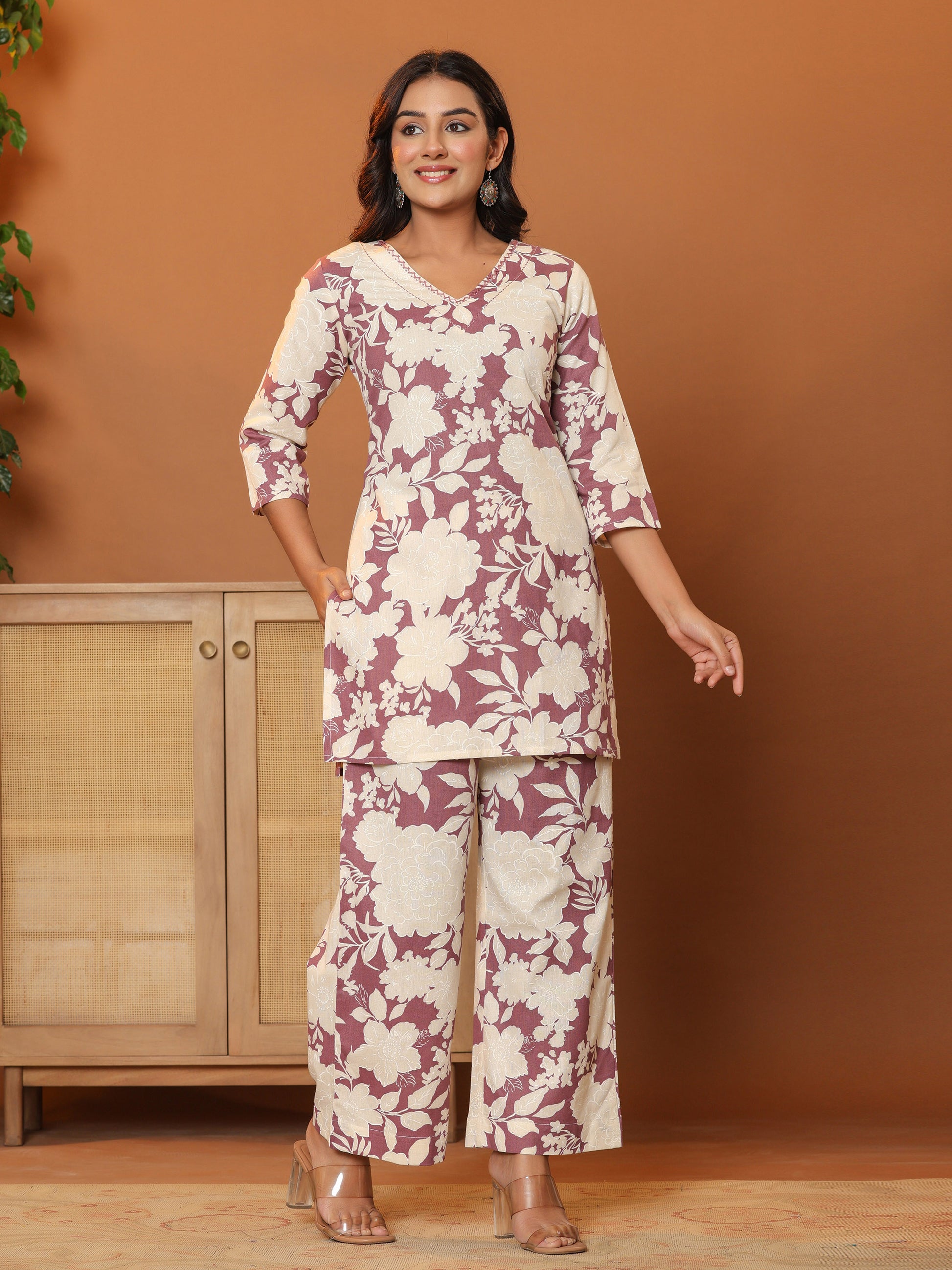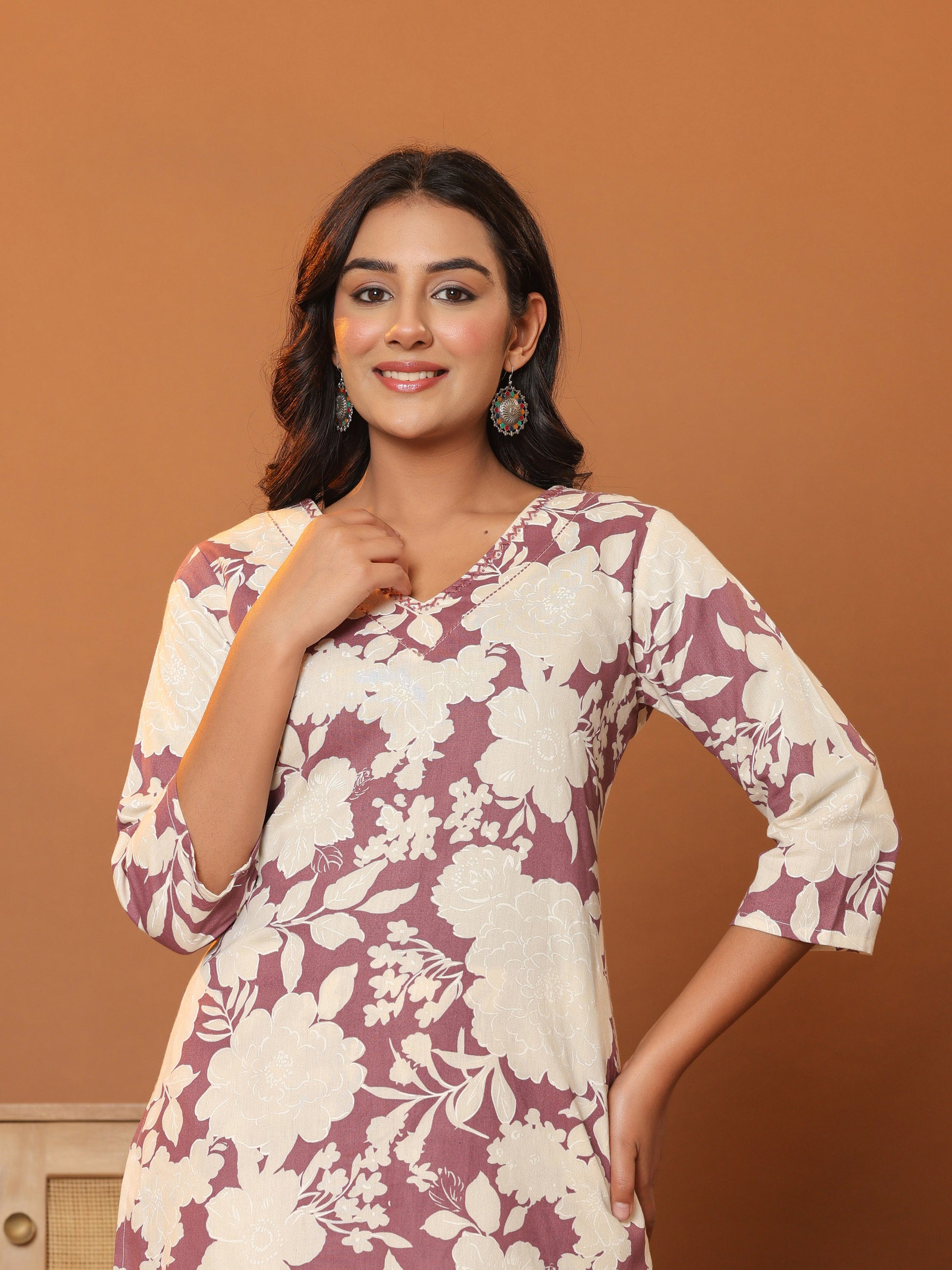 Cream-coloured and pink printed Tunic ,has a v-neck, three-quarter sleeves