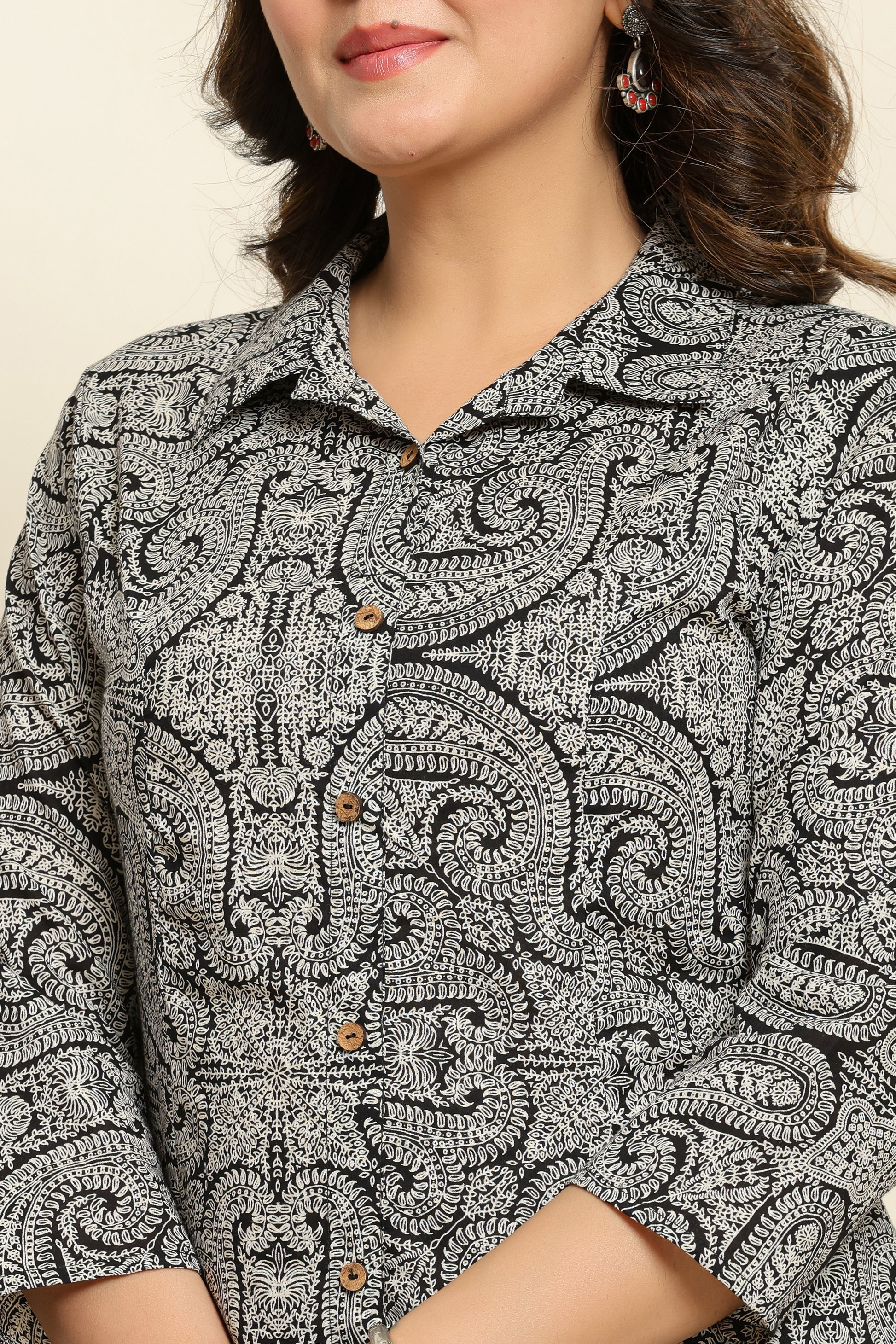 Black and white printed tunic, as shirt collar neck,, three quarter sleeves