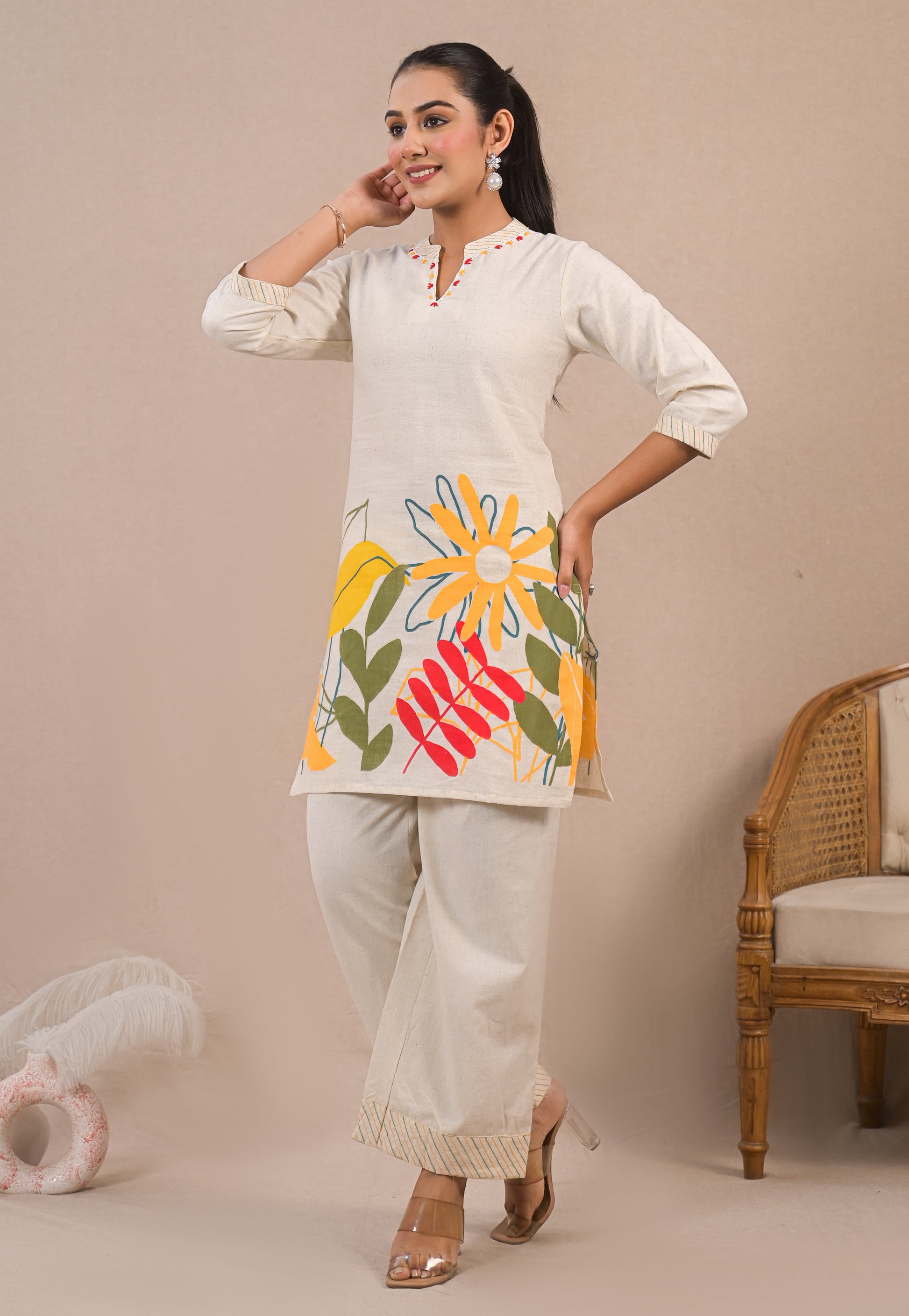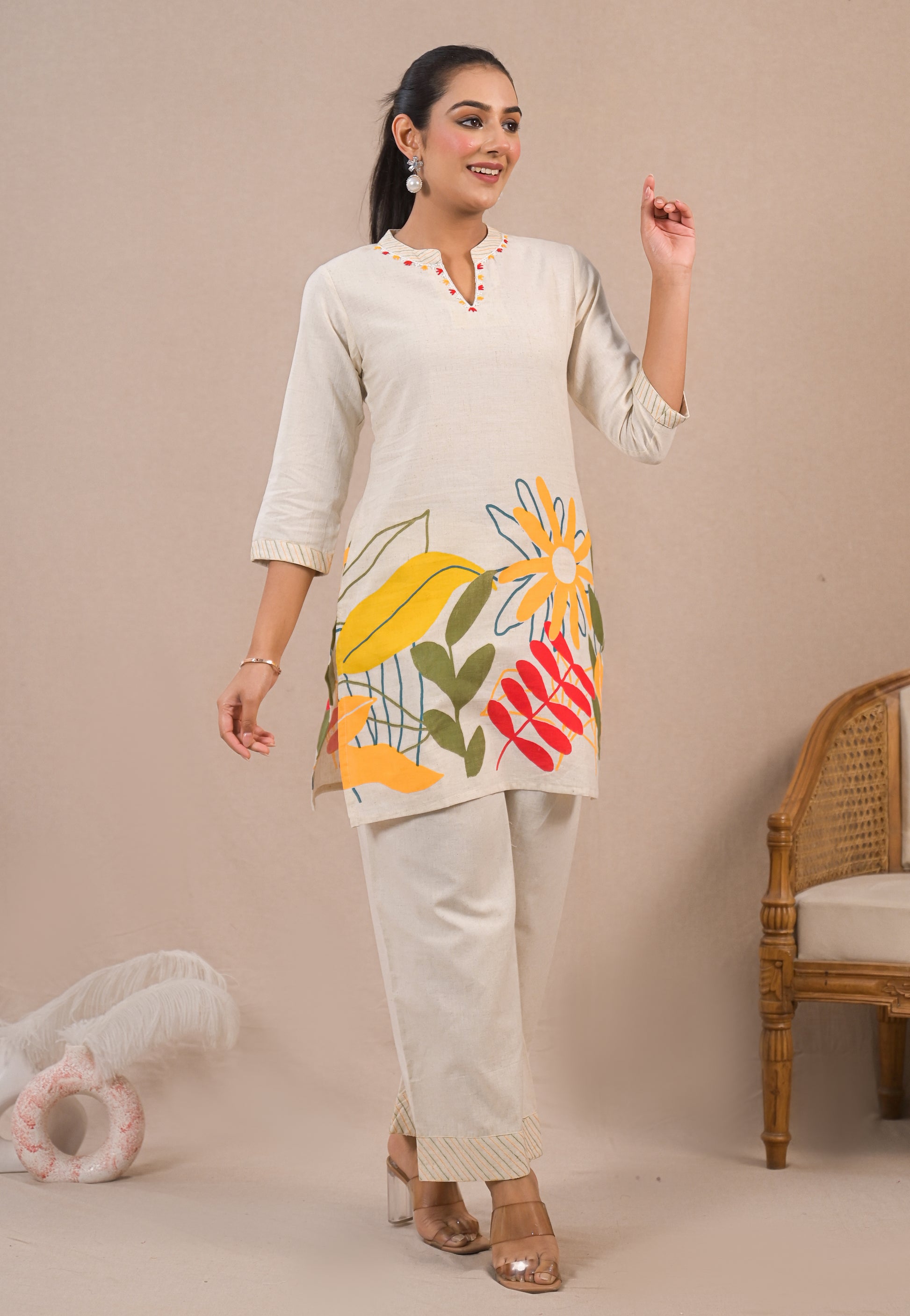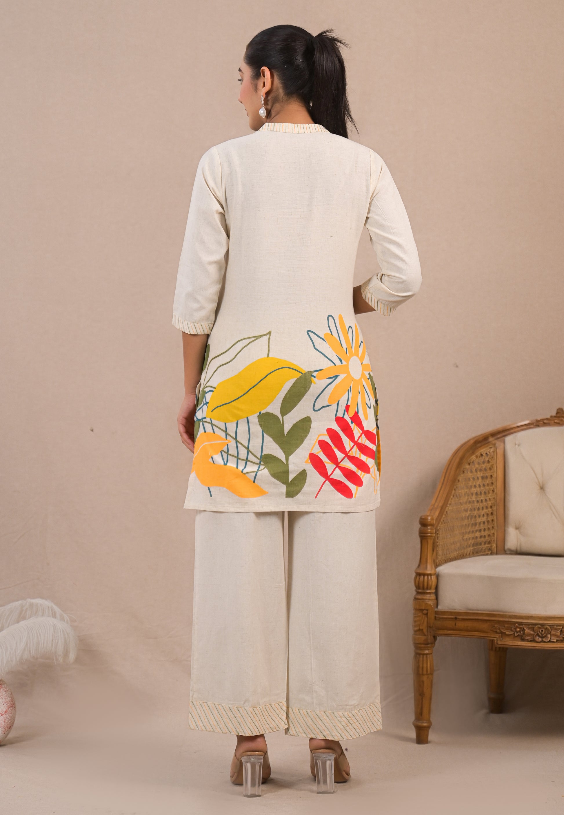 Cream & green printed top, has a mandarin collar and three-quarter sleeves, secured with slip-on closure