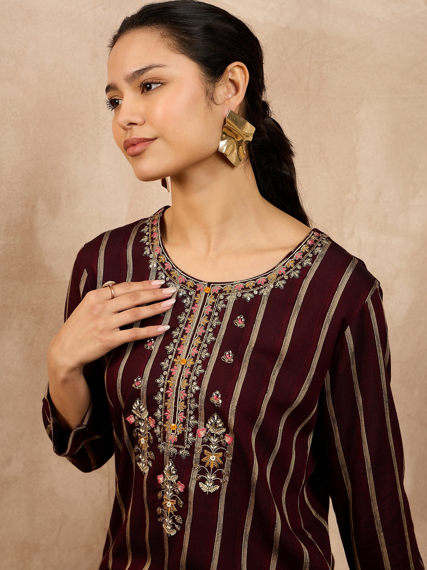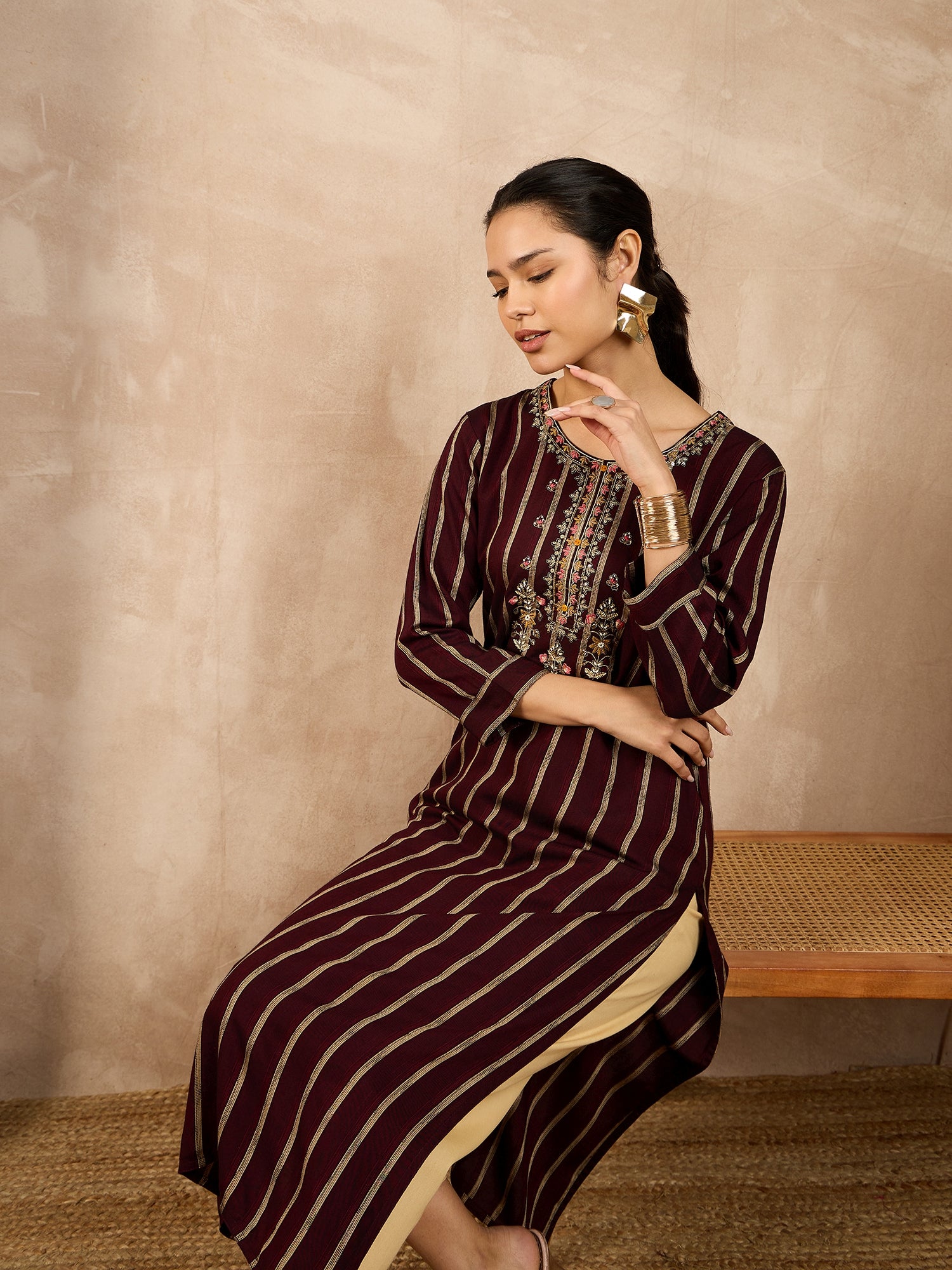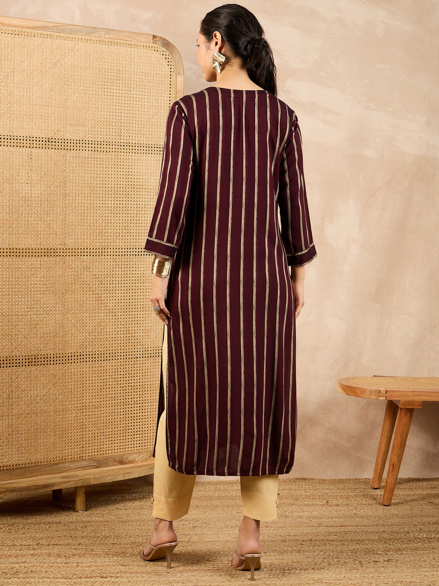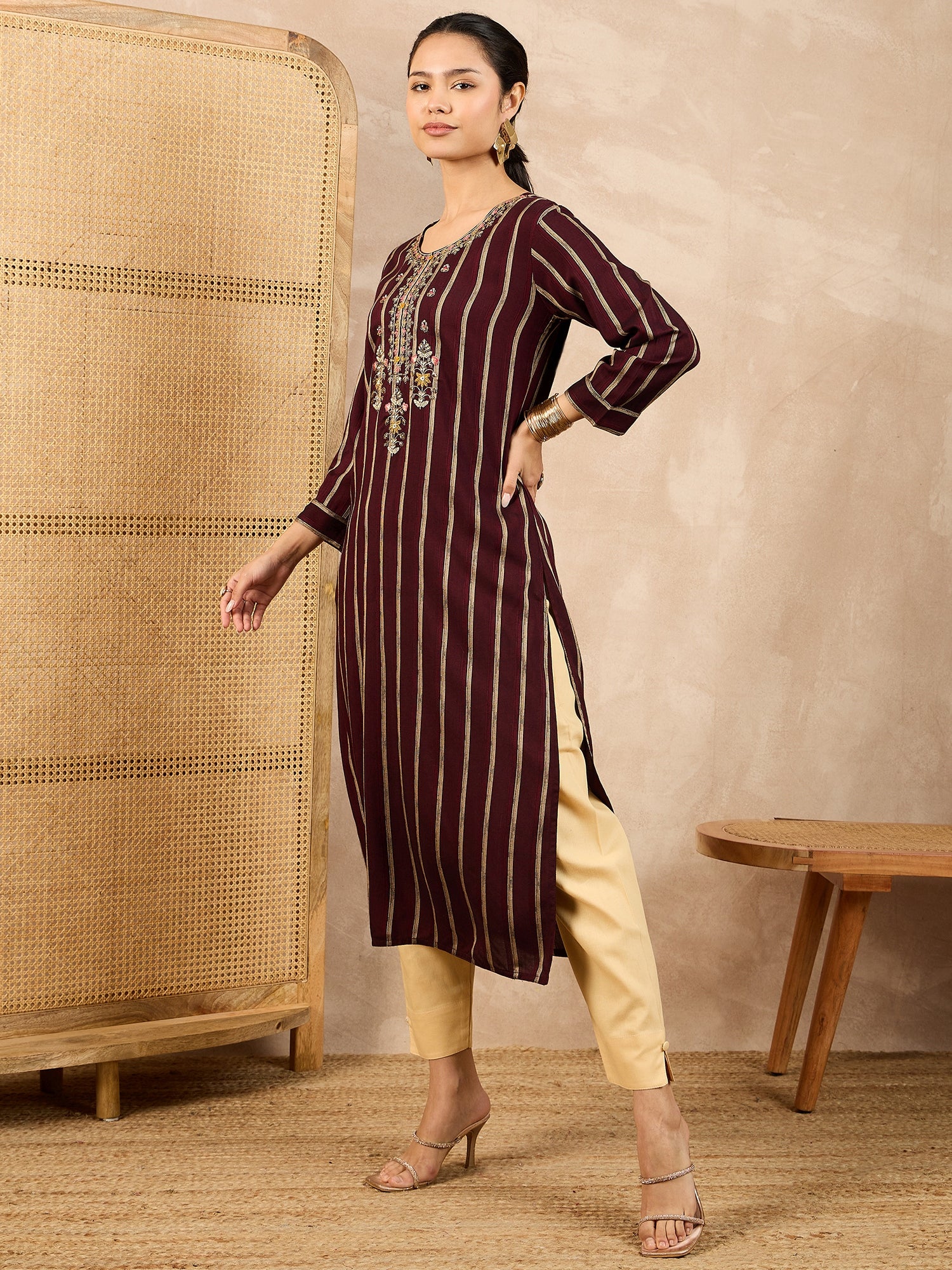 Striped V-Neck Thread Work Straight Kurta