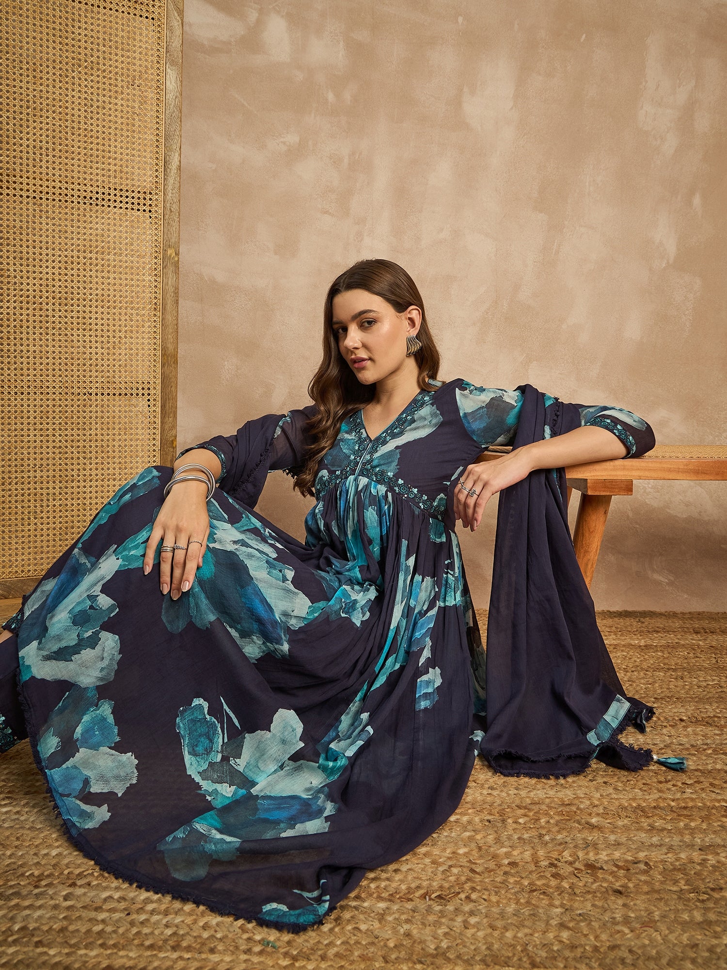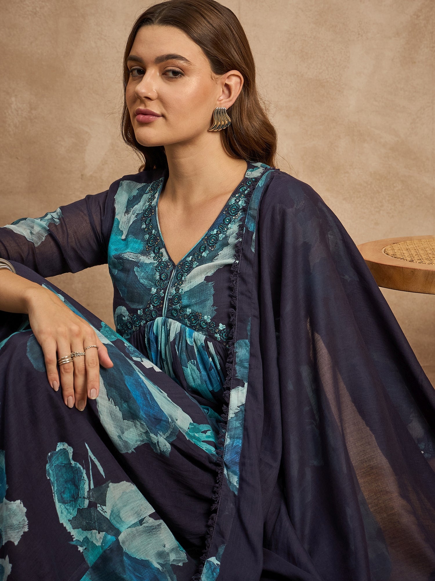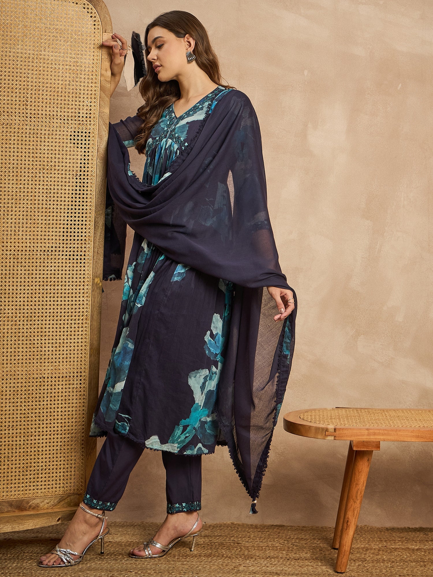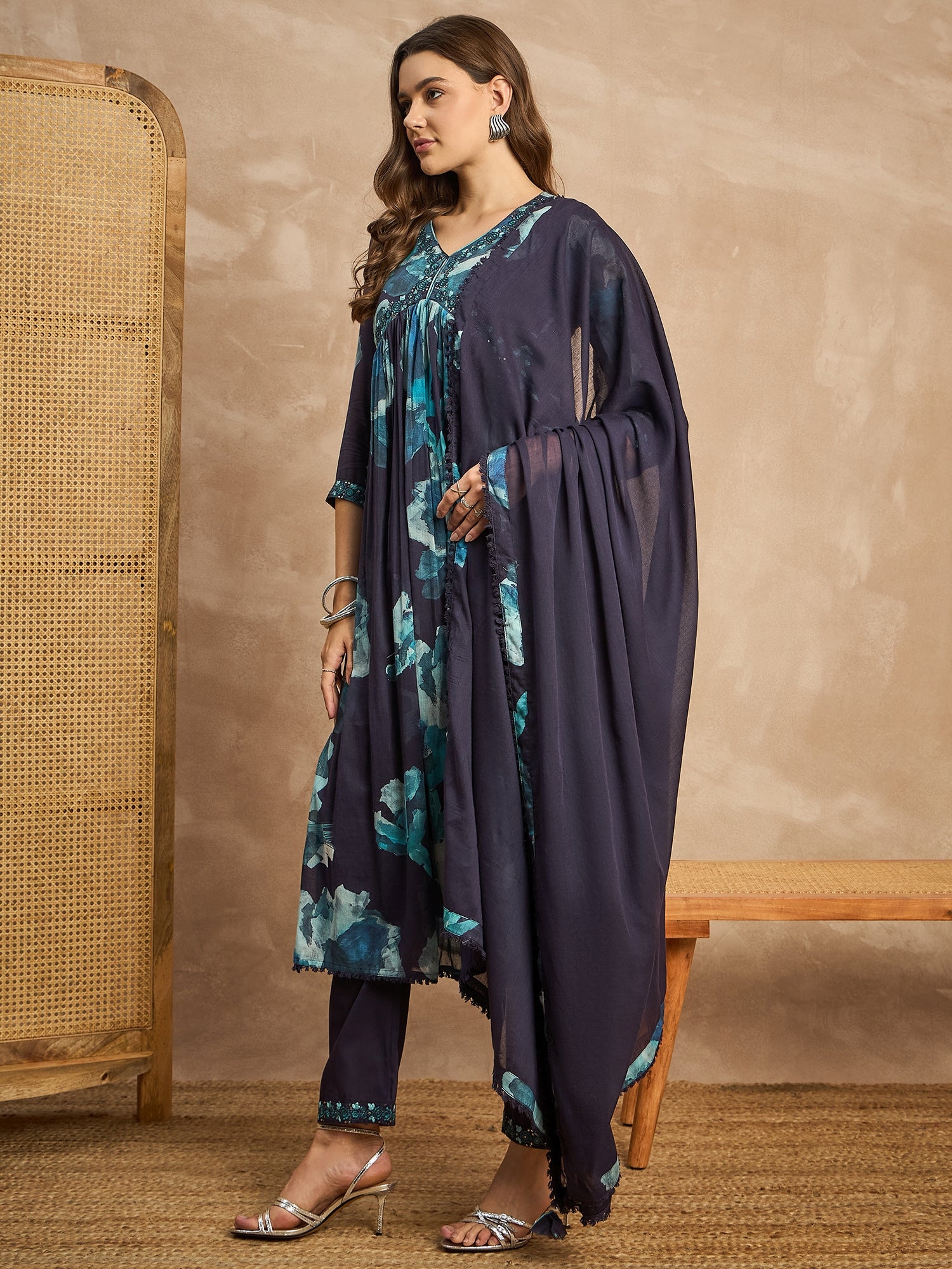 Women Abstract Printed Beads and Stones Anarkali Kurta with Trousers & Dupatta