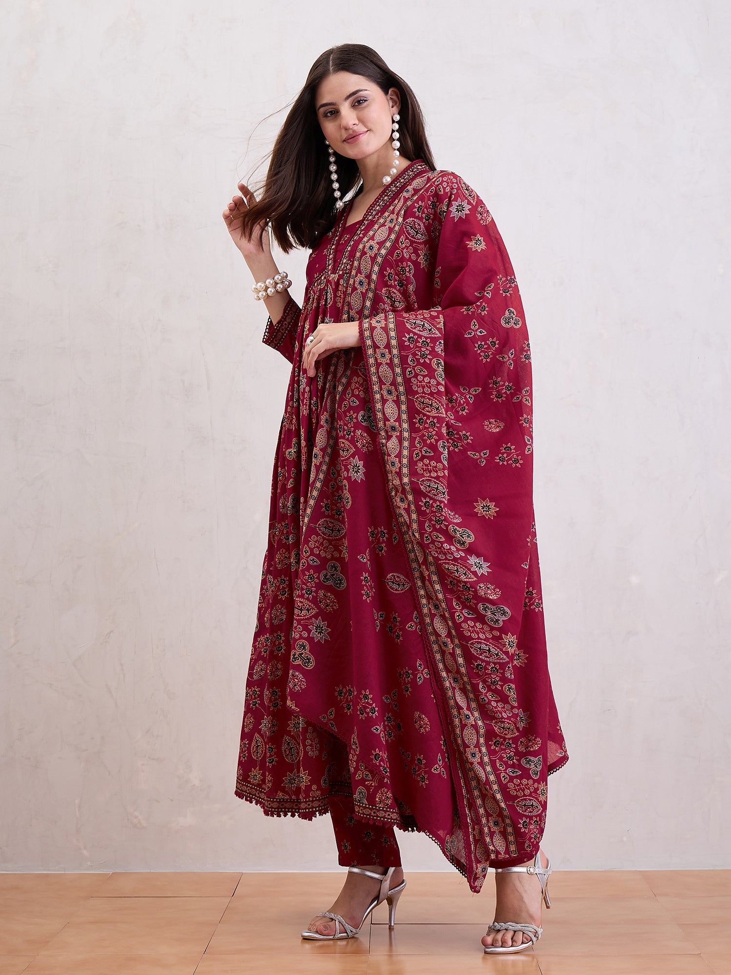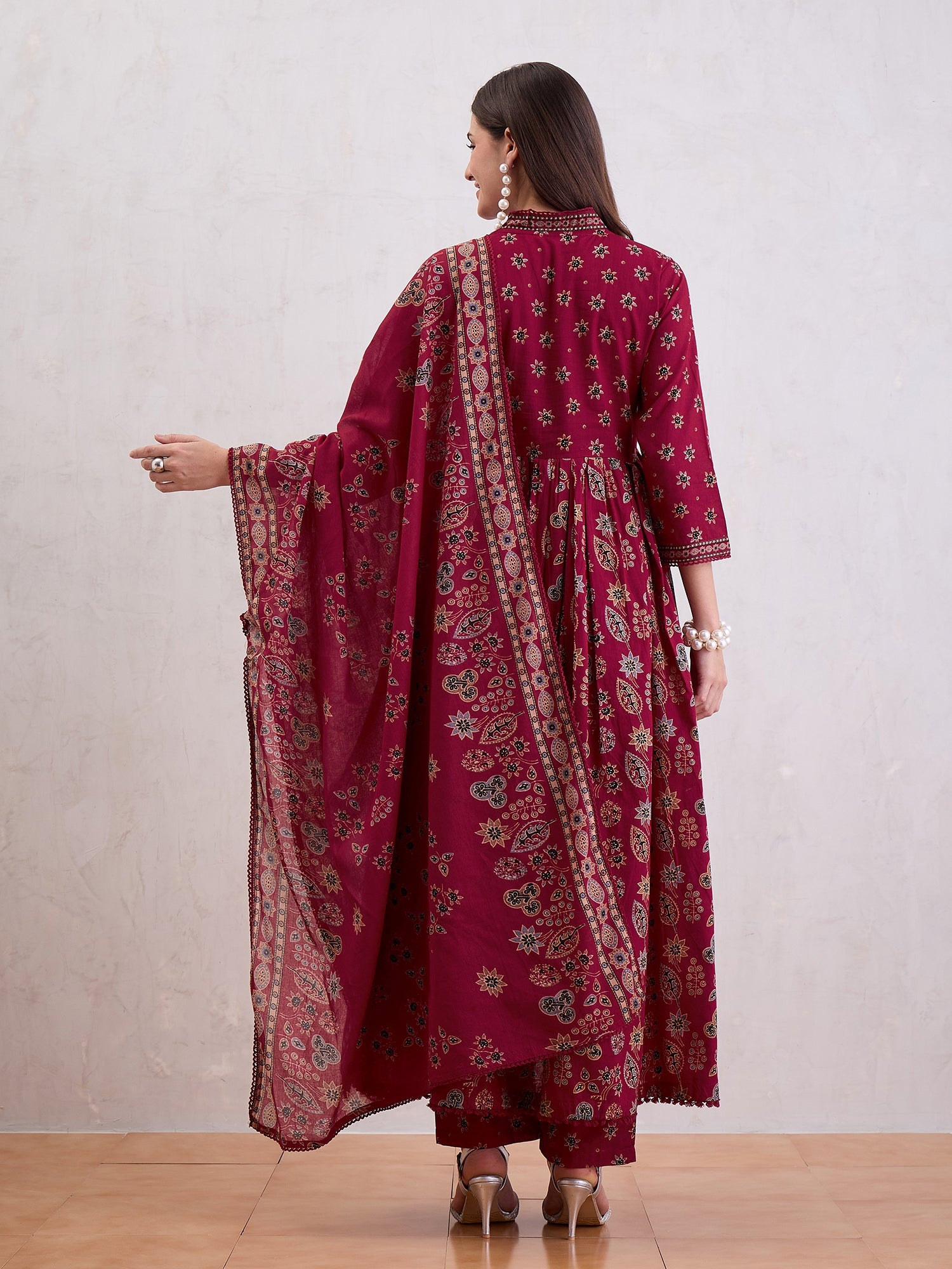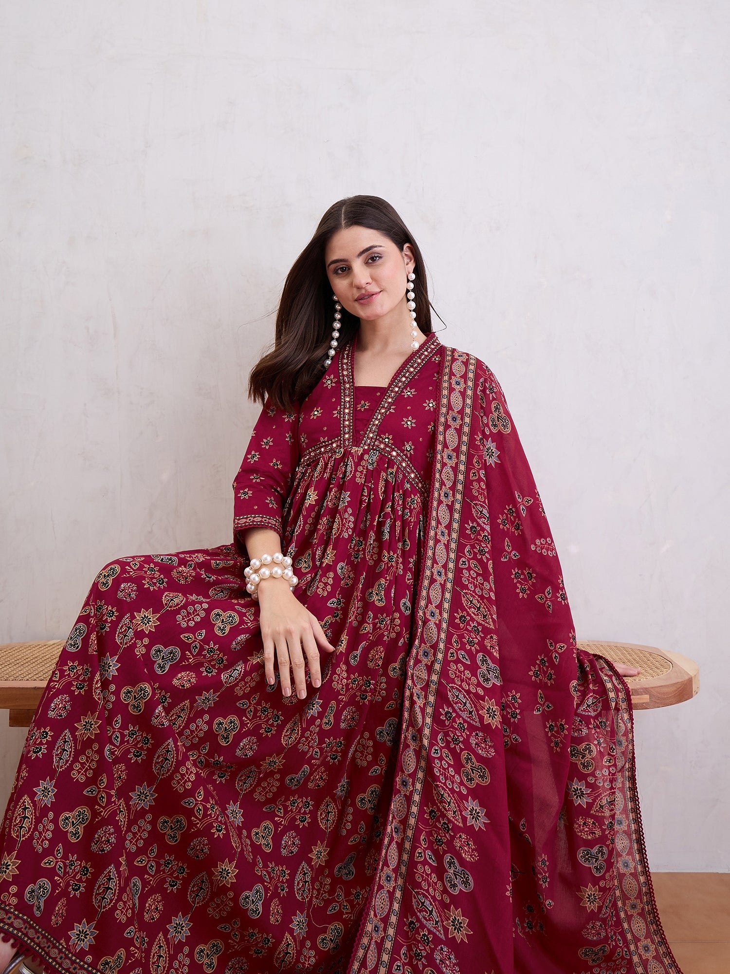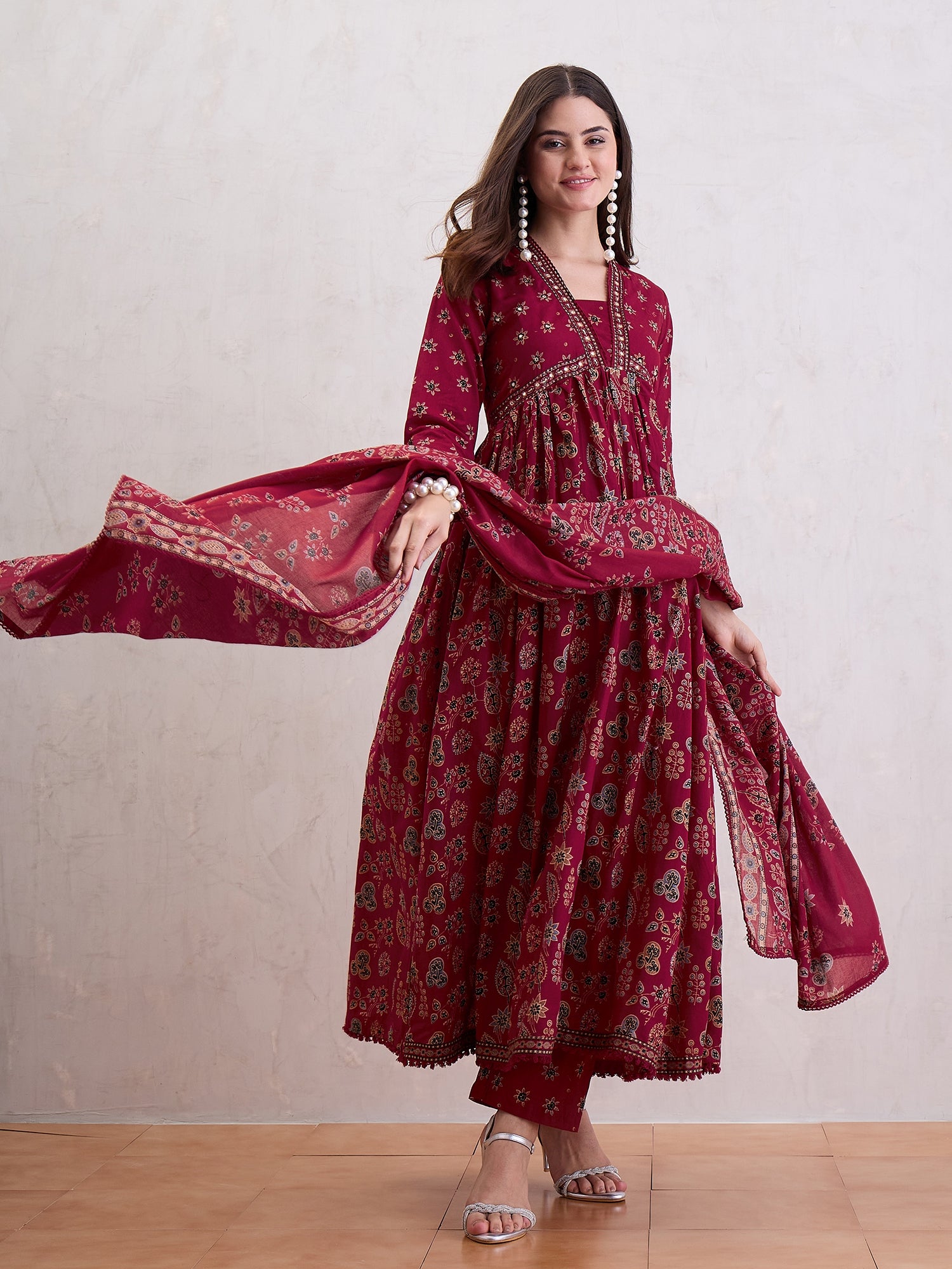 WOMEN VOILE ETHINIC ANARKALI KURTA EMBLISHED WITH HAND WORK ON YOKE ALONG WITH TROUSER AND DUPATTA