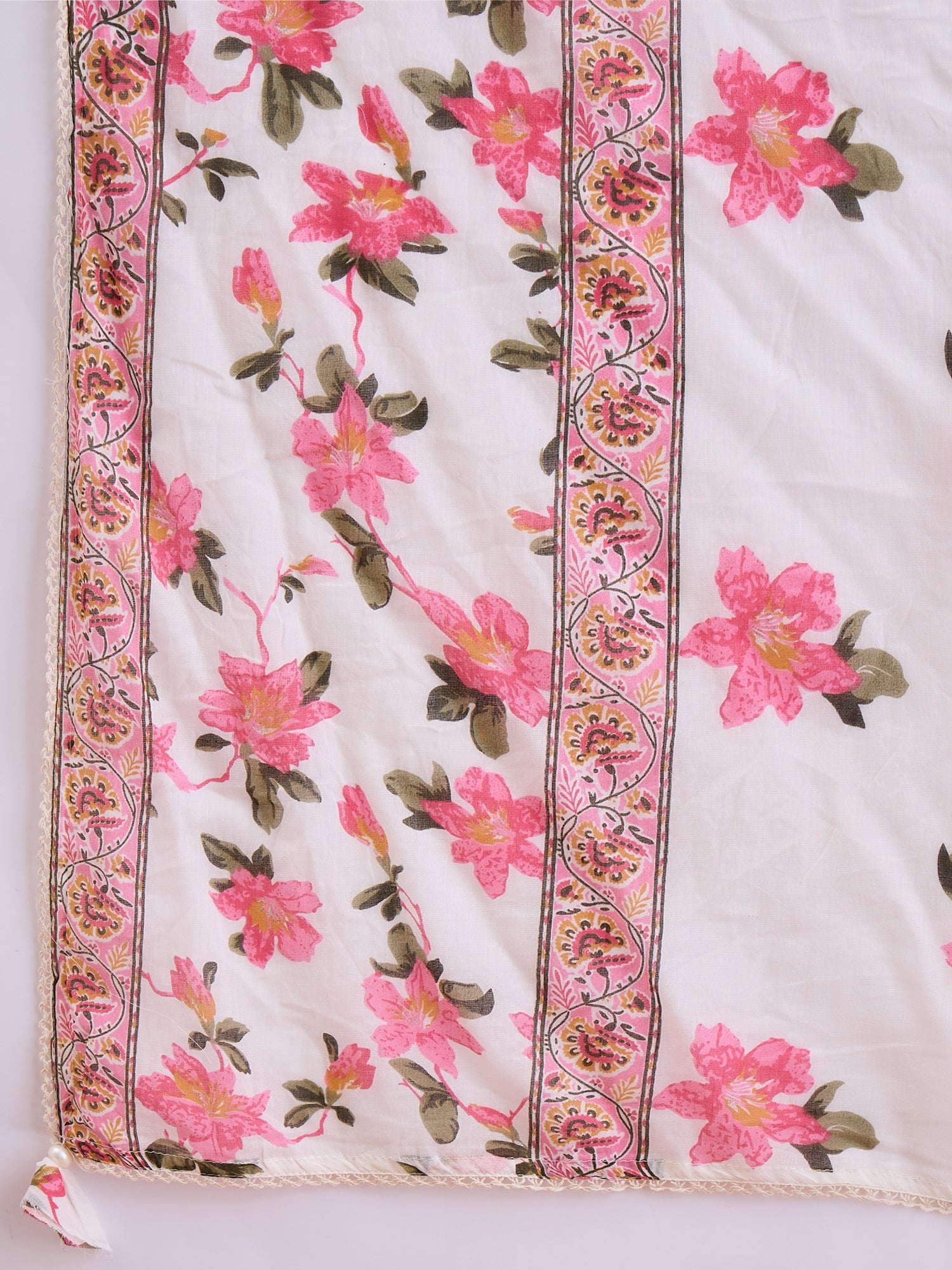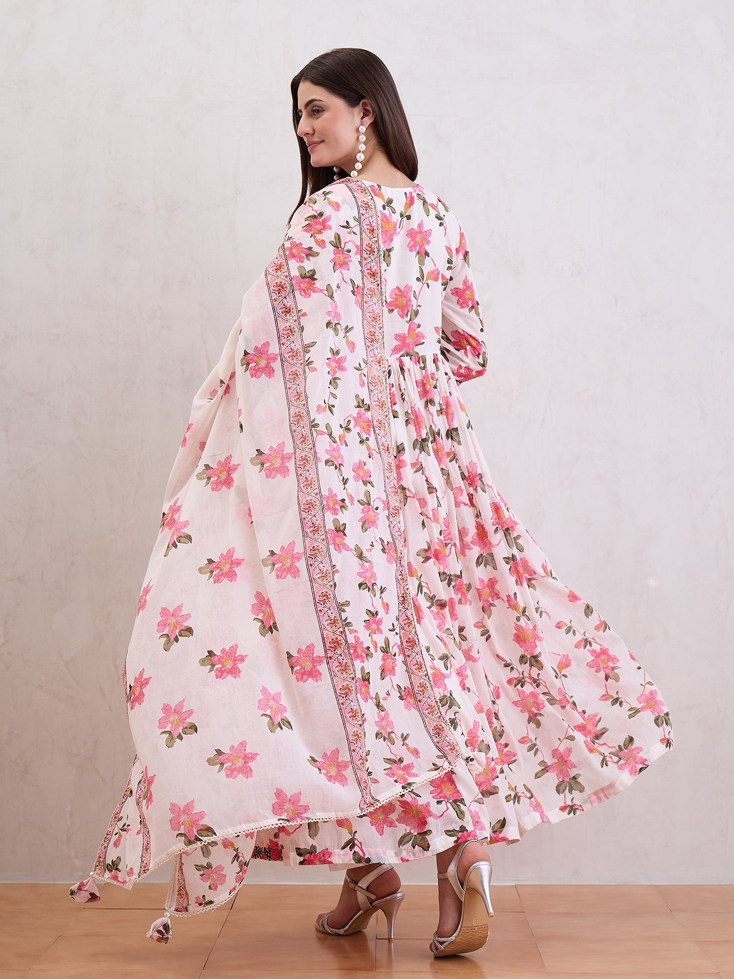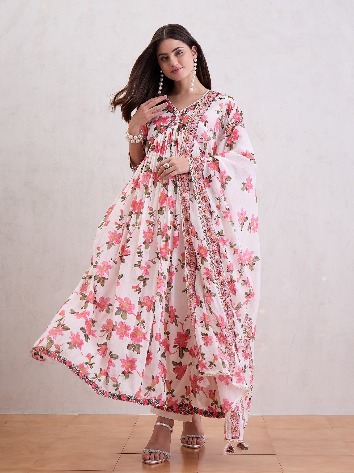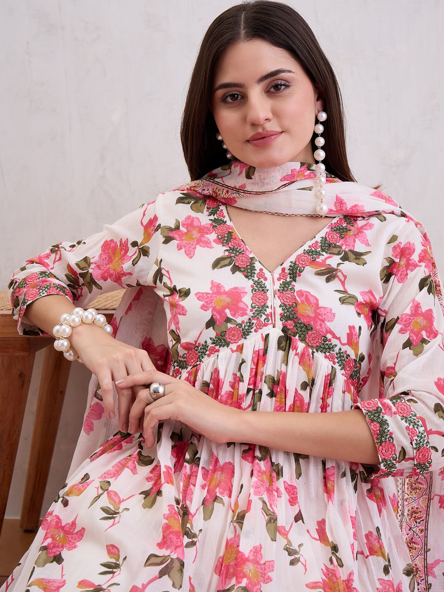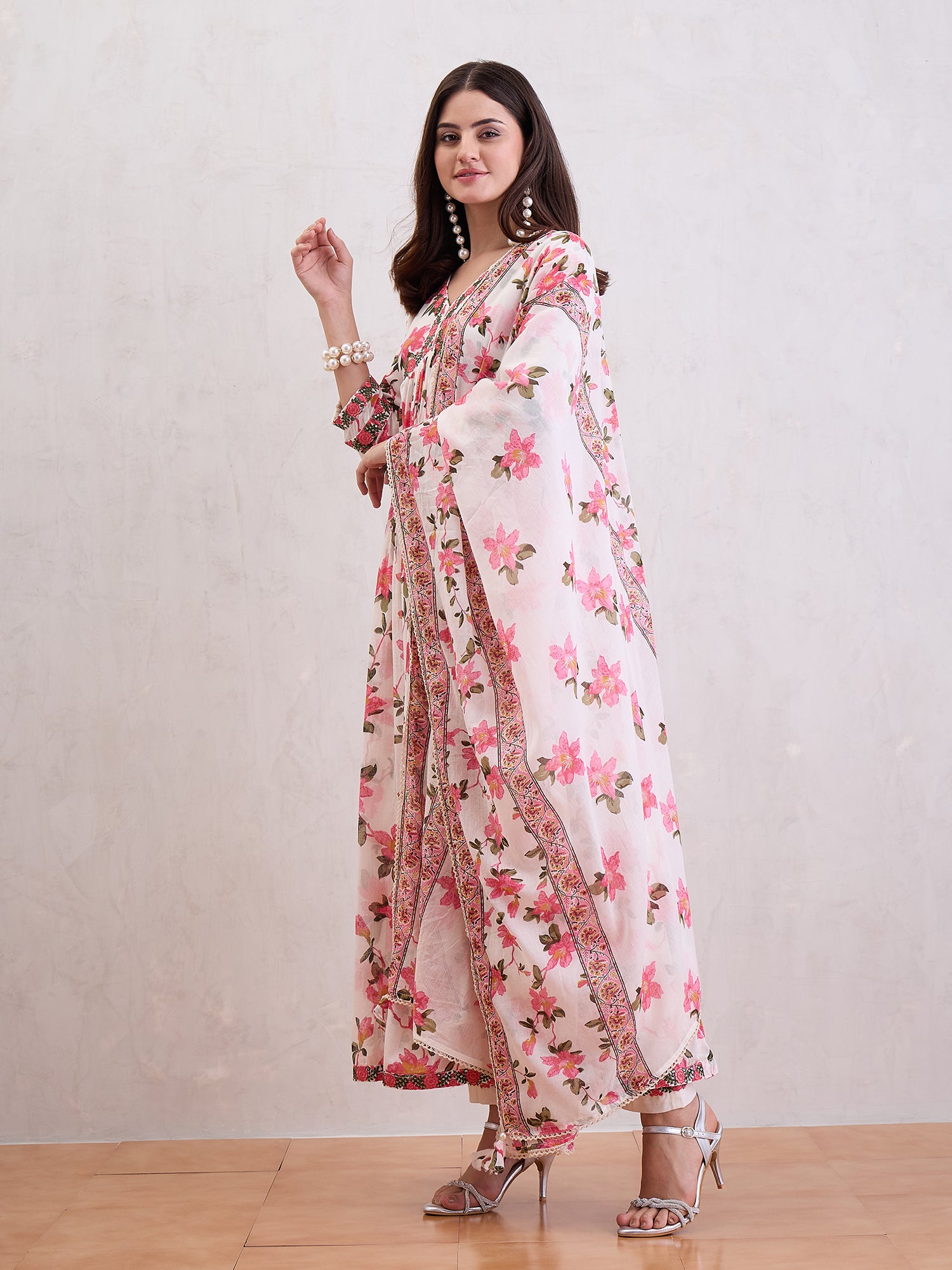 Women Voile Printed Anarkali Kurta Emblished With Embroidery And Hand Work Along With Trouser And Dupatta