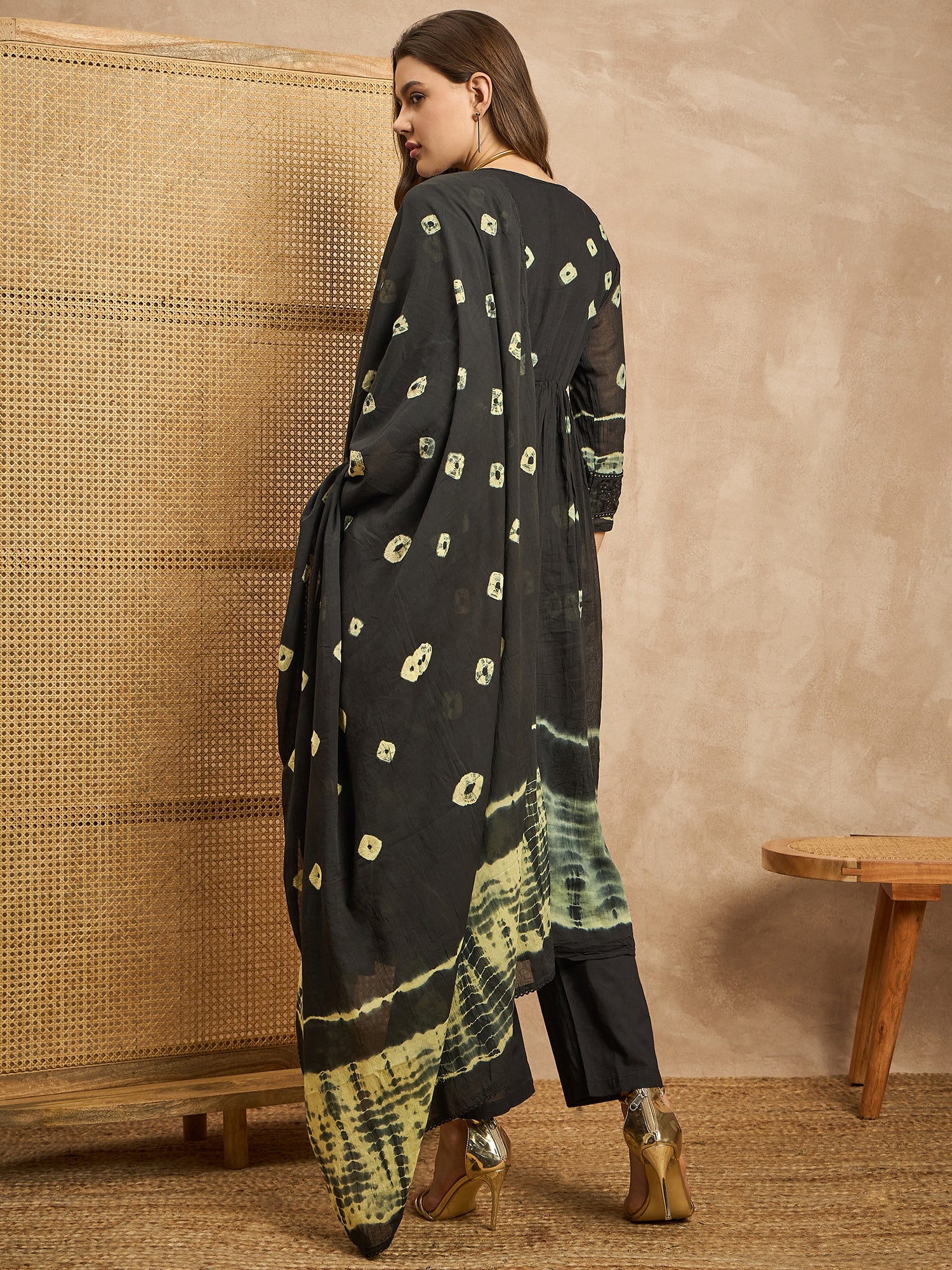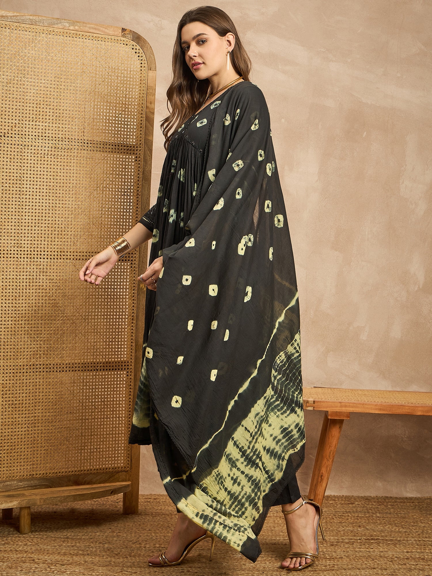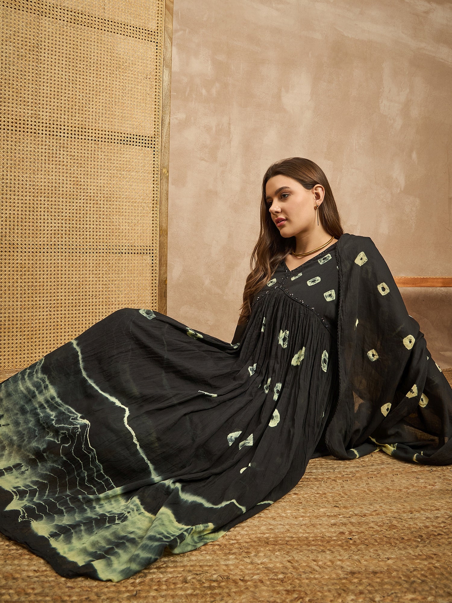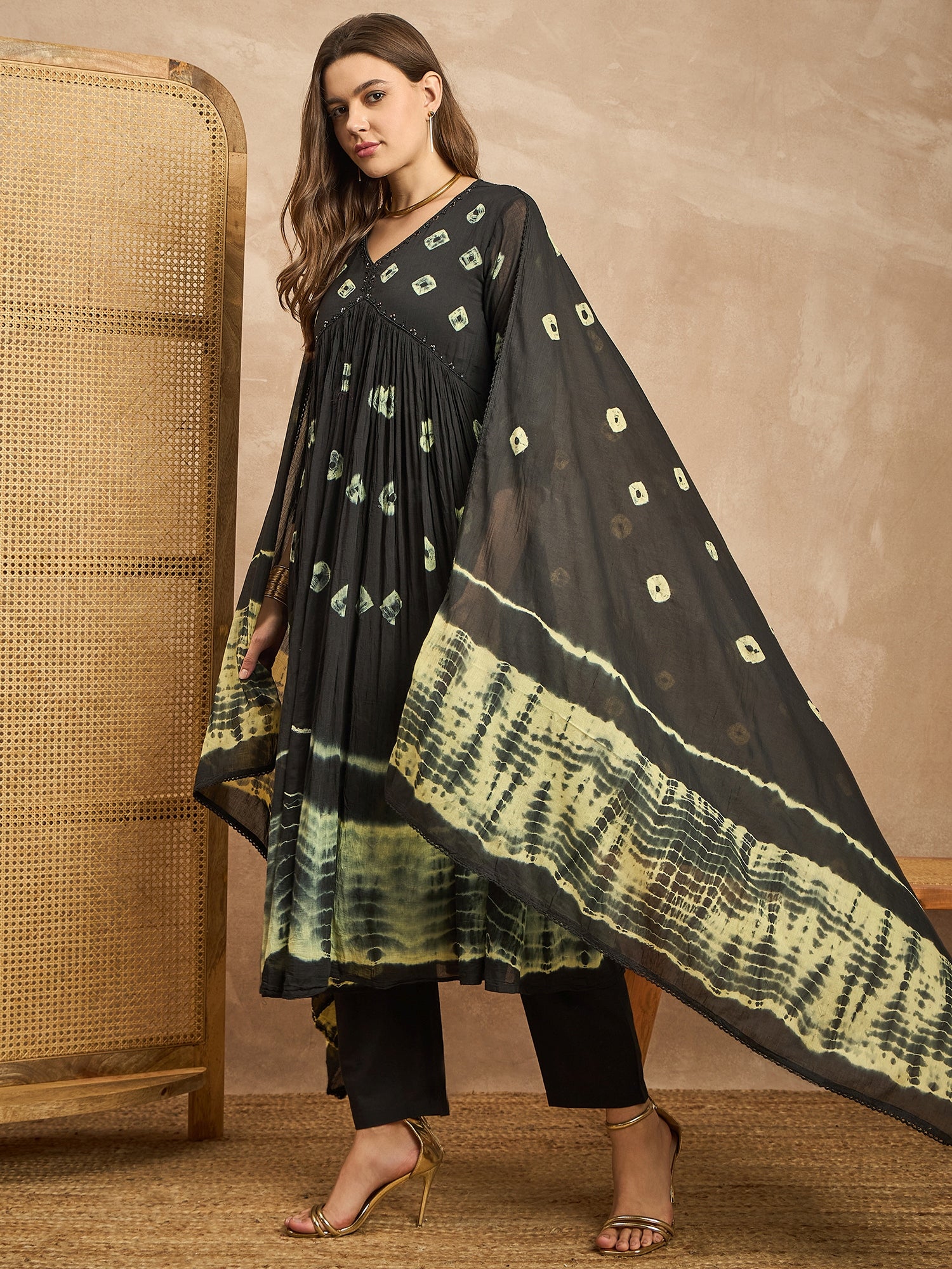 Women Bandhani Printed Beads and Stones Anarkali Kurta with Trousers & Dupatta