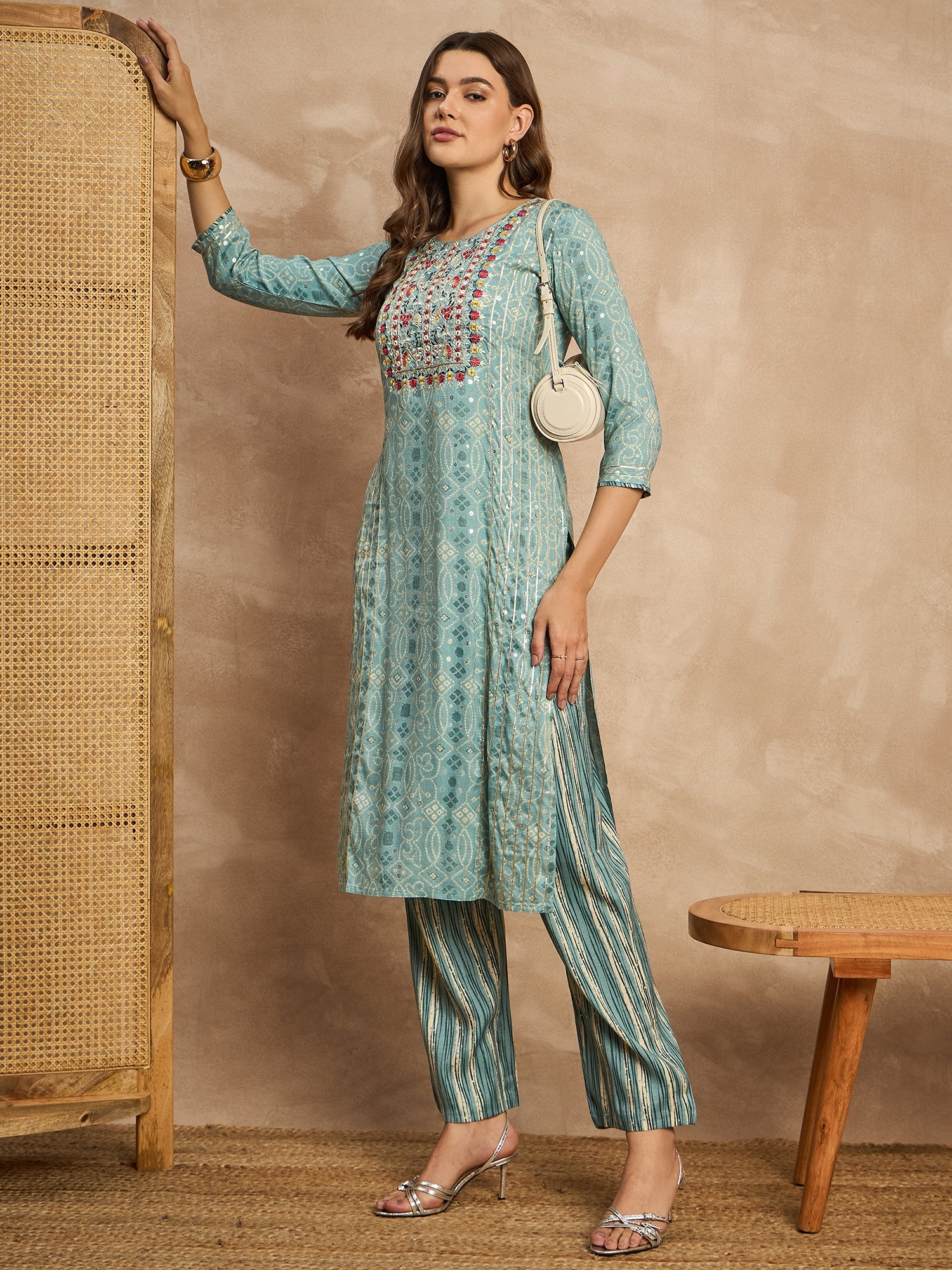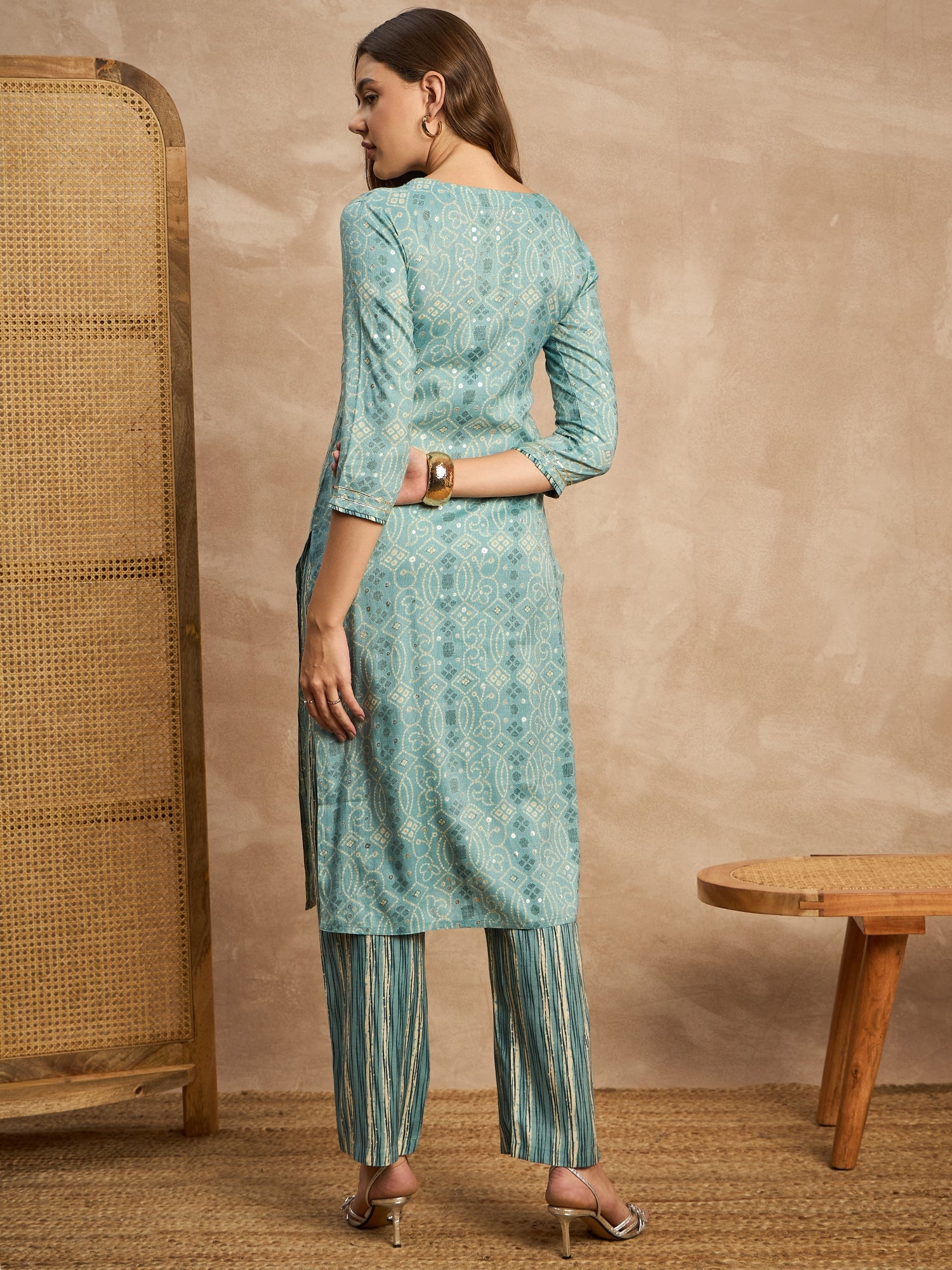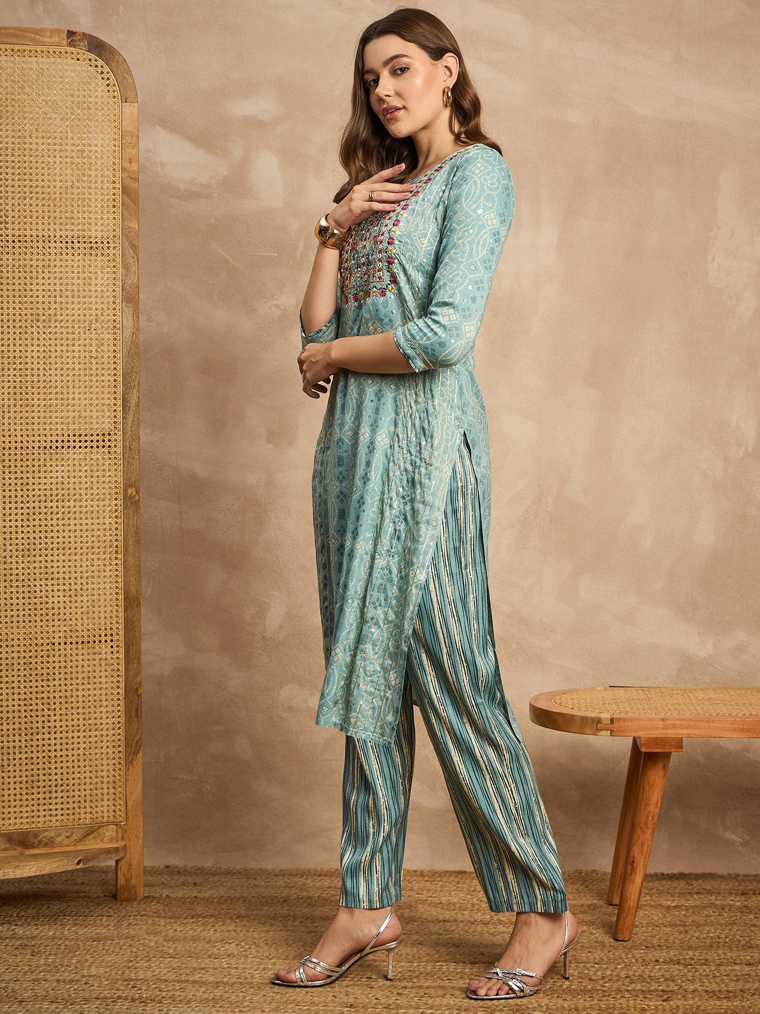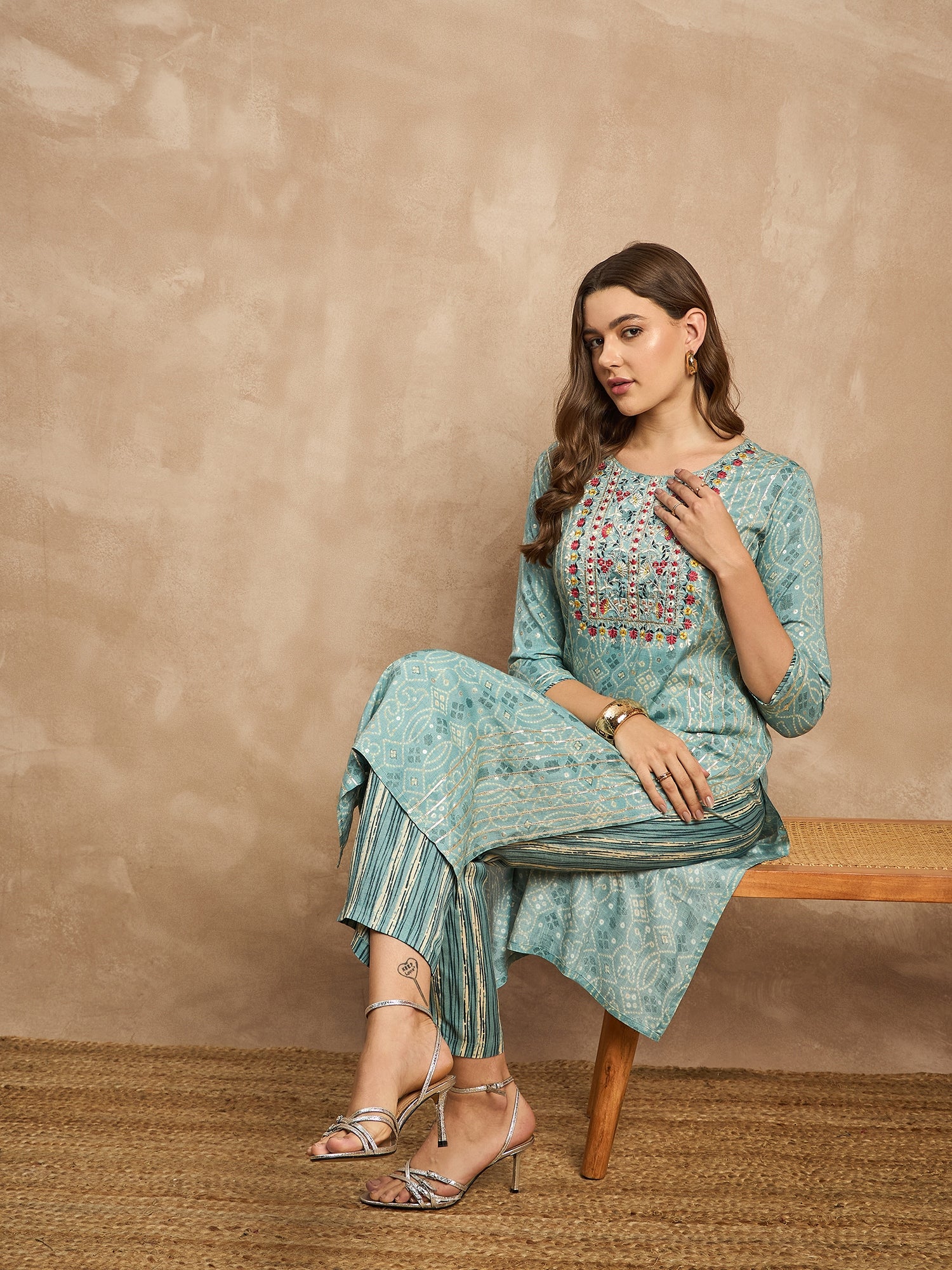 Women Bandhani Printed Regular Thread Work Kurta with Trousers