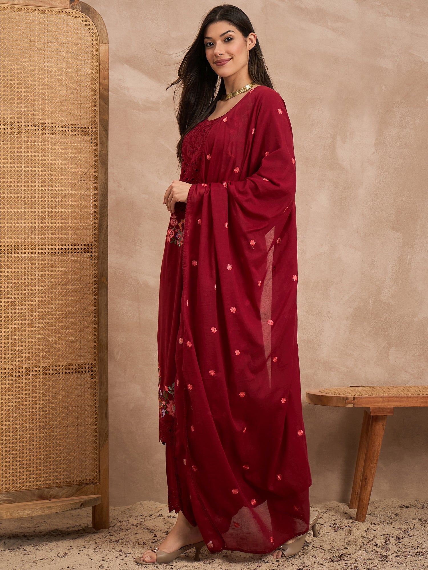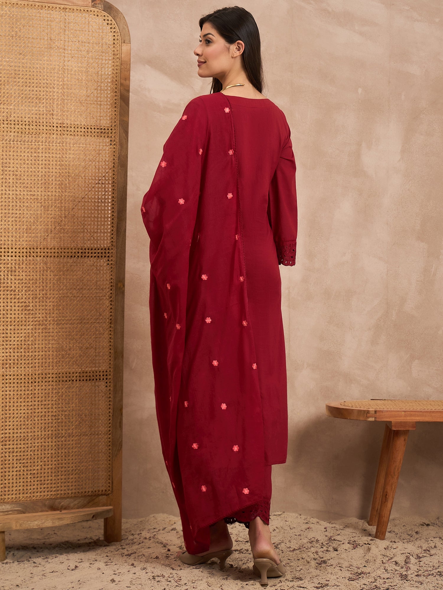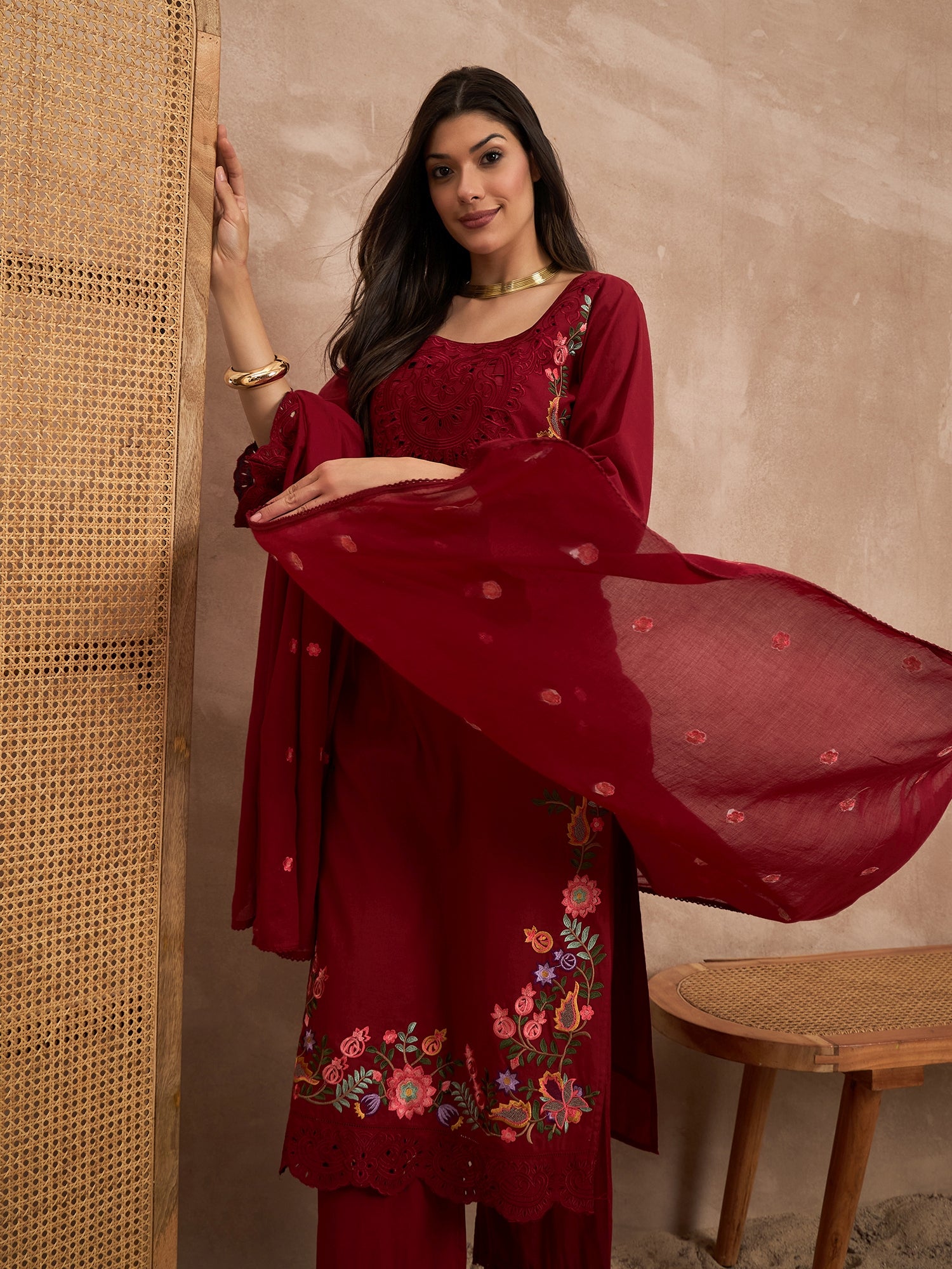 Red embroidered Kurta with Trousers with dupatta
