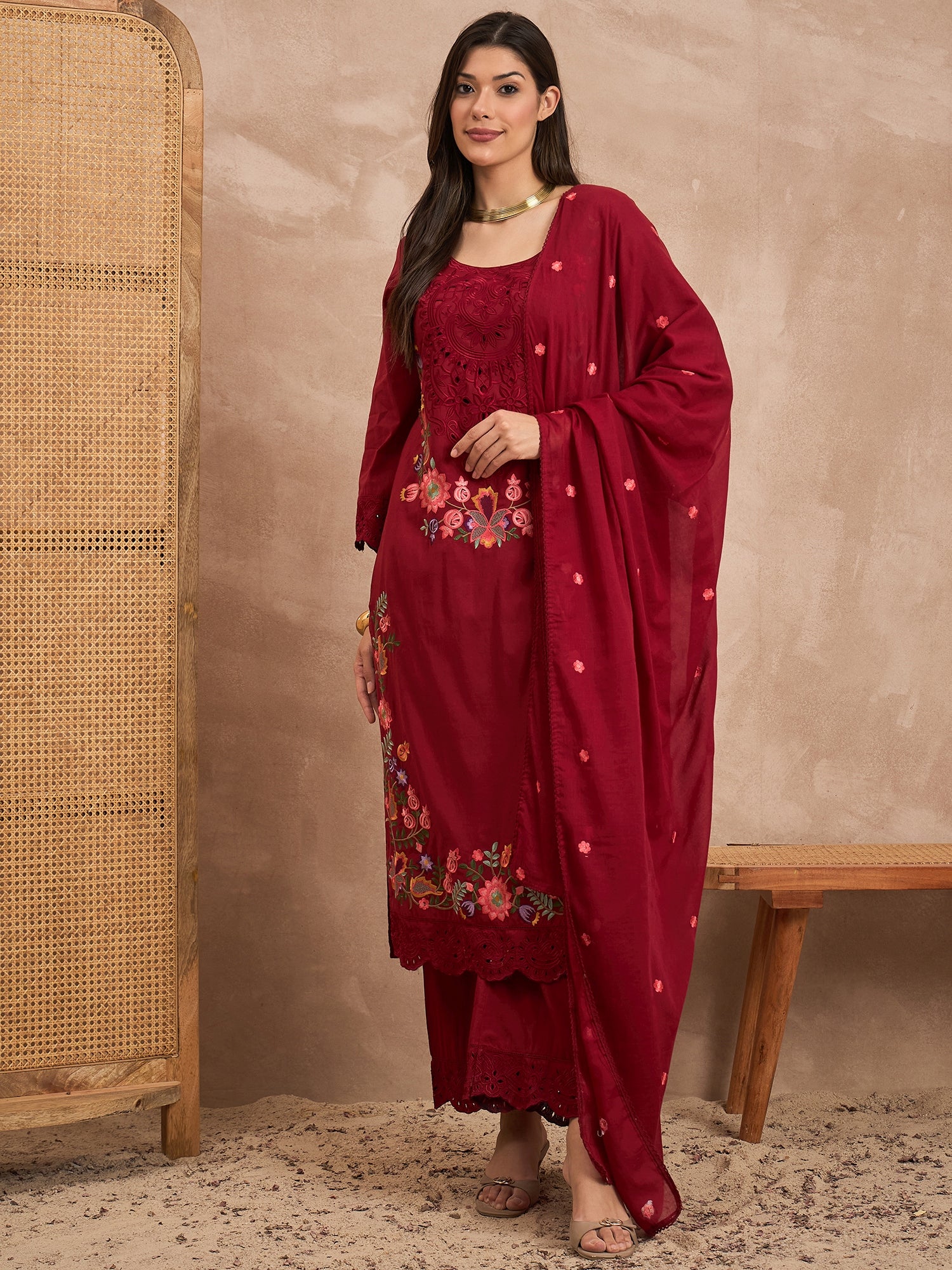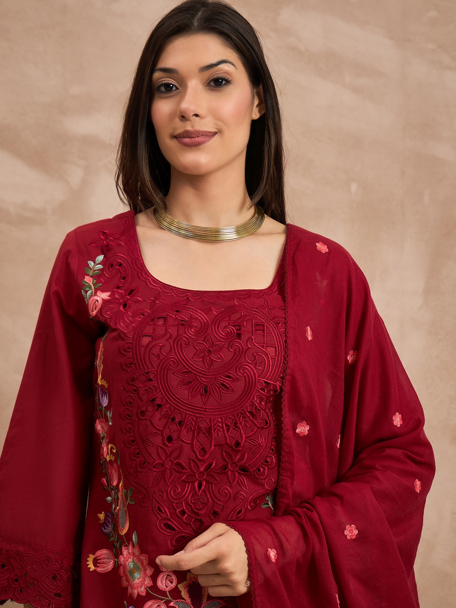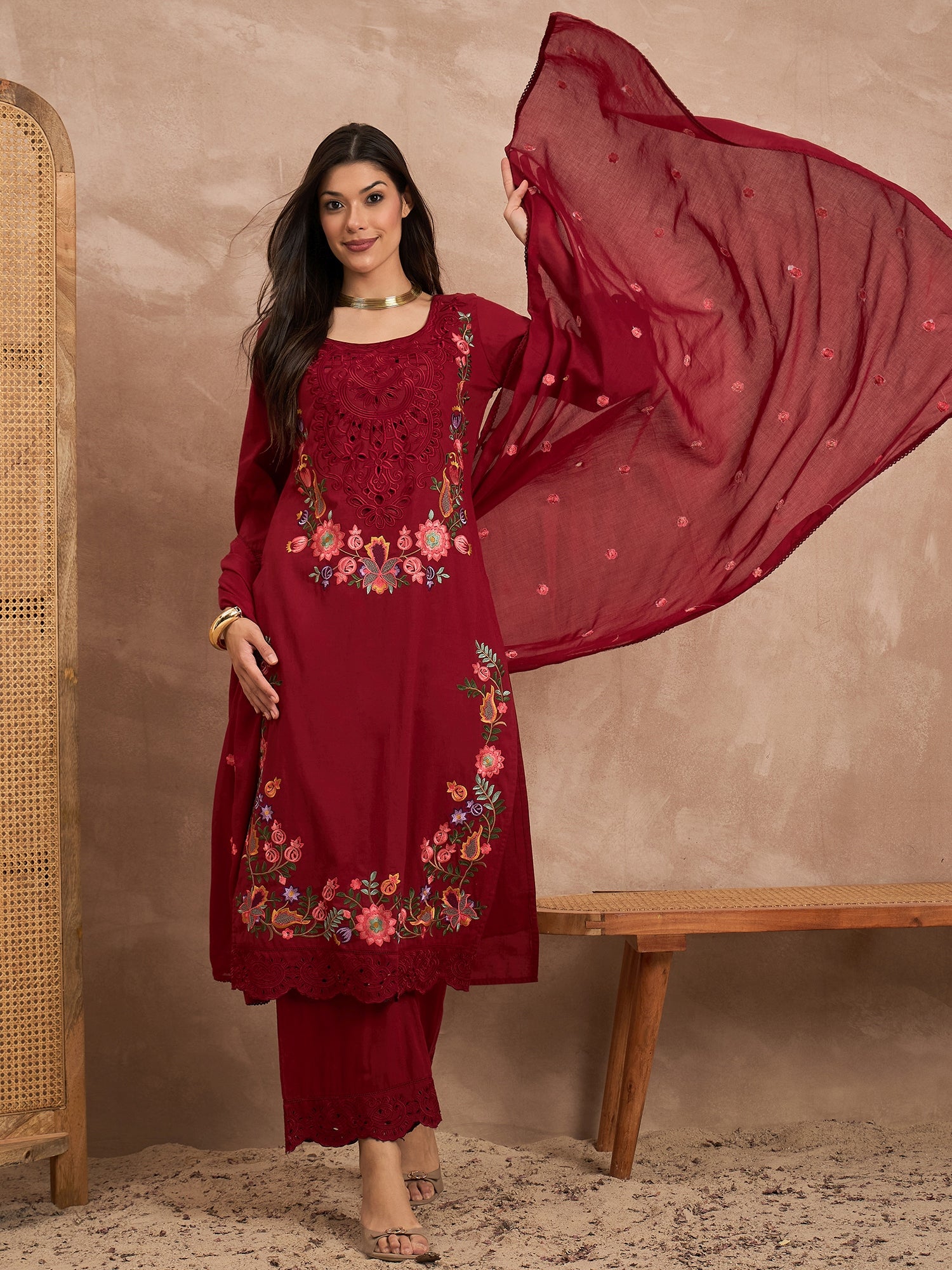 Red embroidered Kurta with Trousers with dupatta