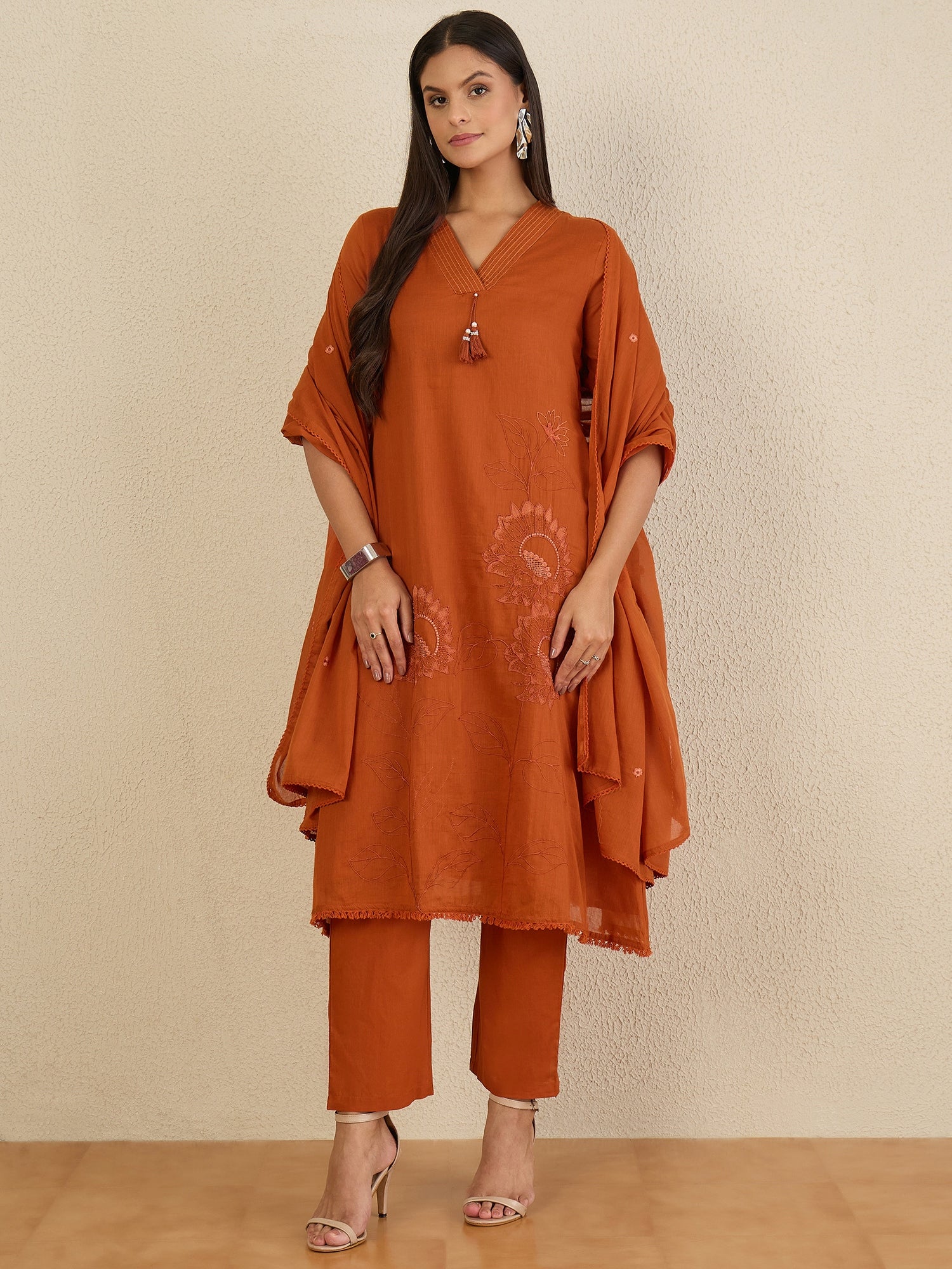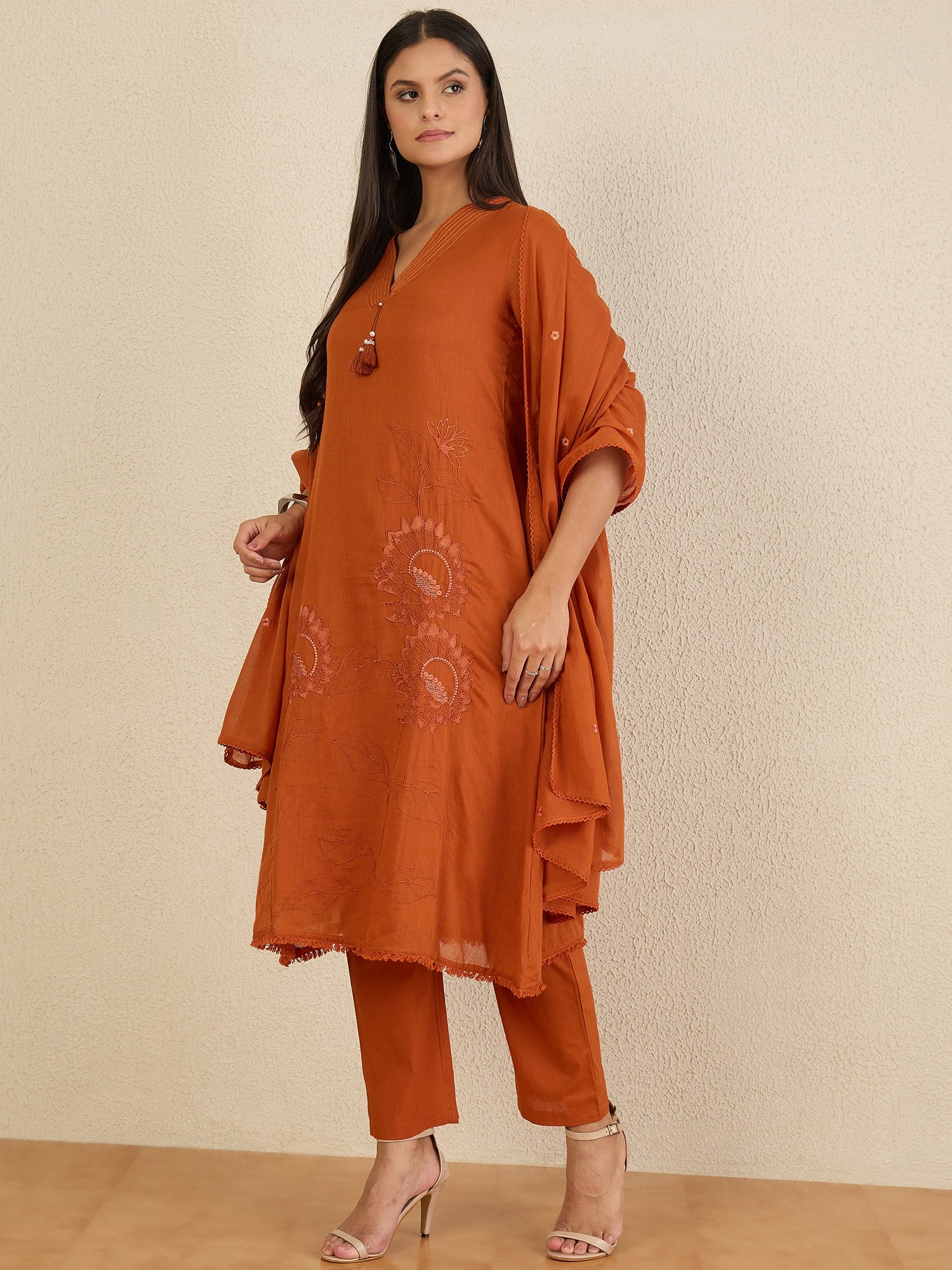 Rust embroidered Kurta with Trousers with dupatta