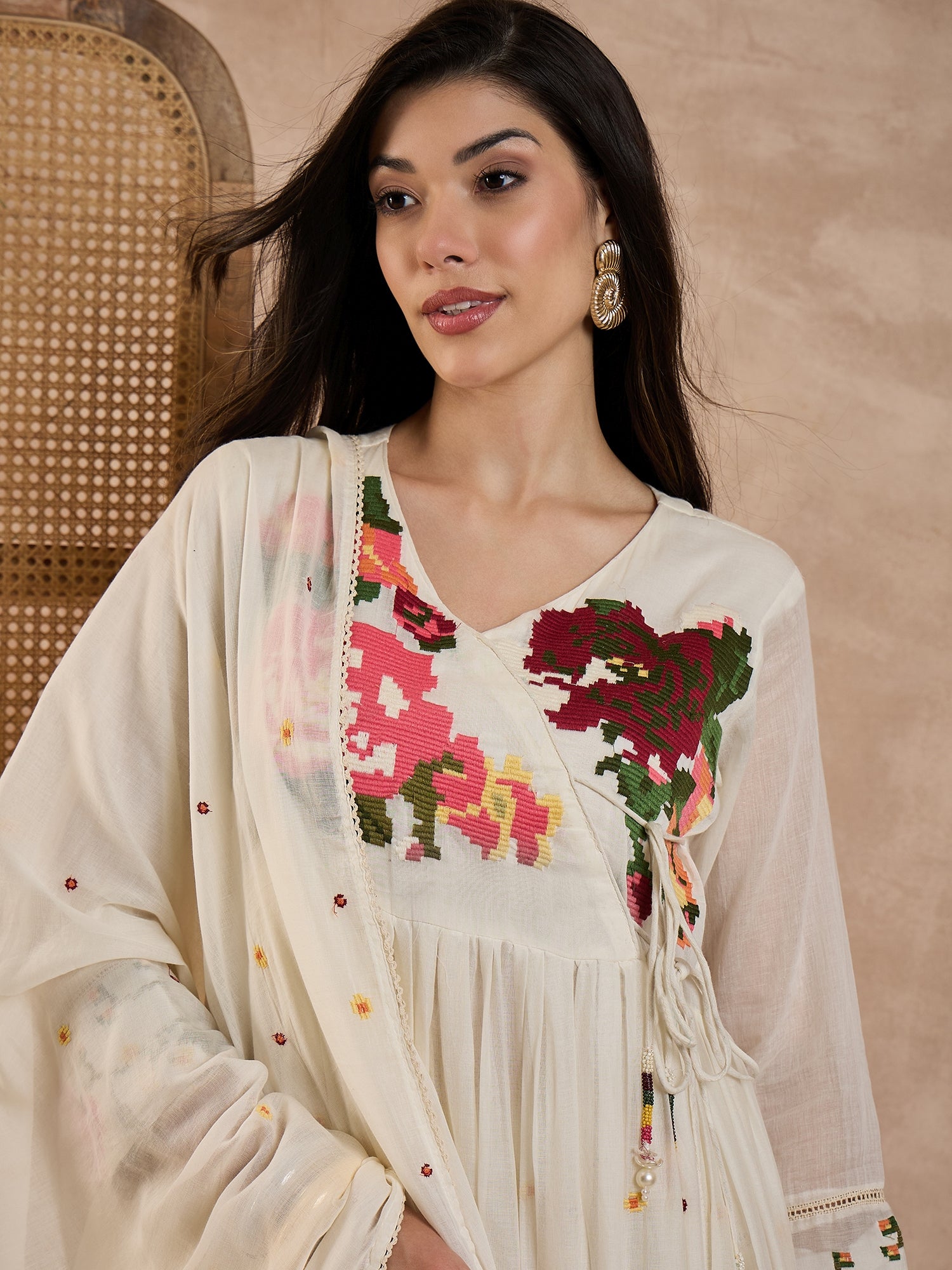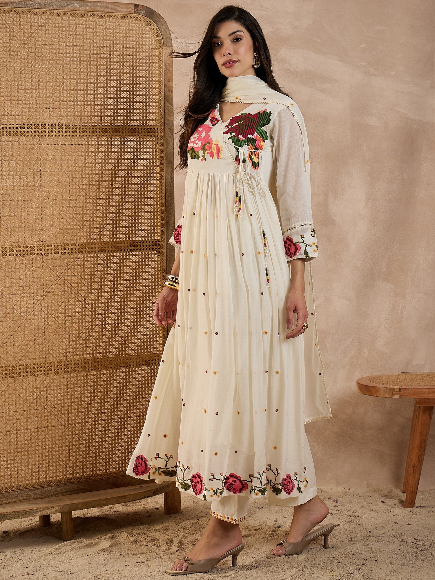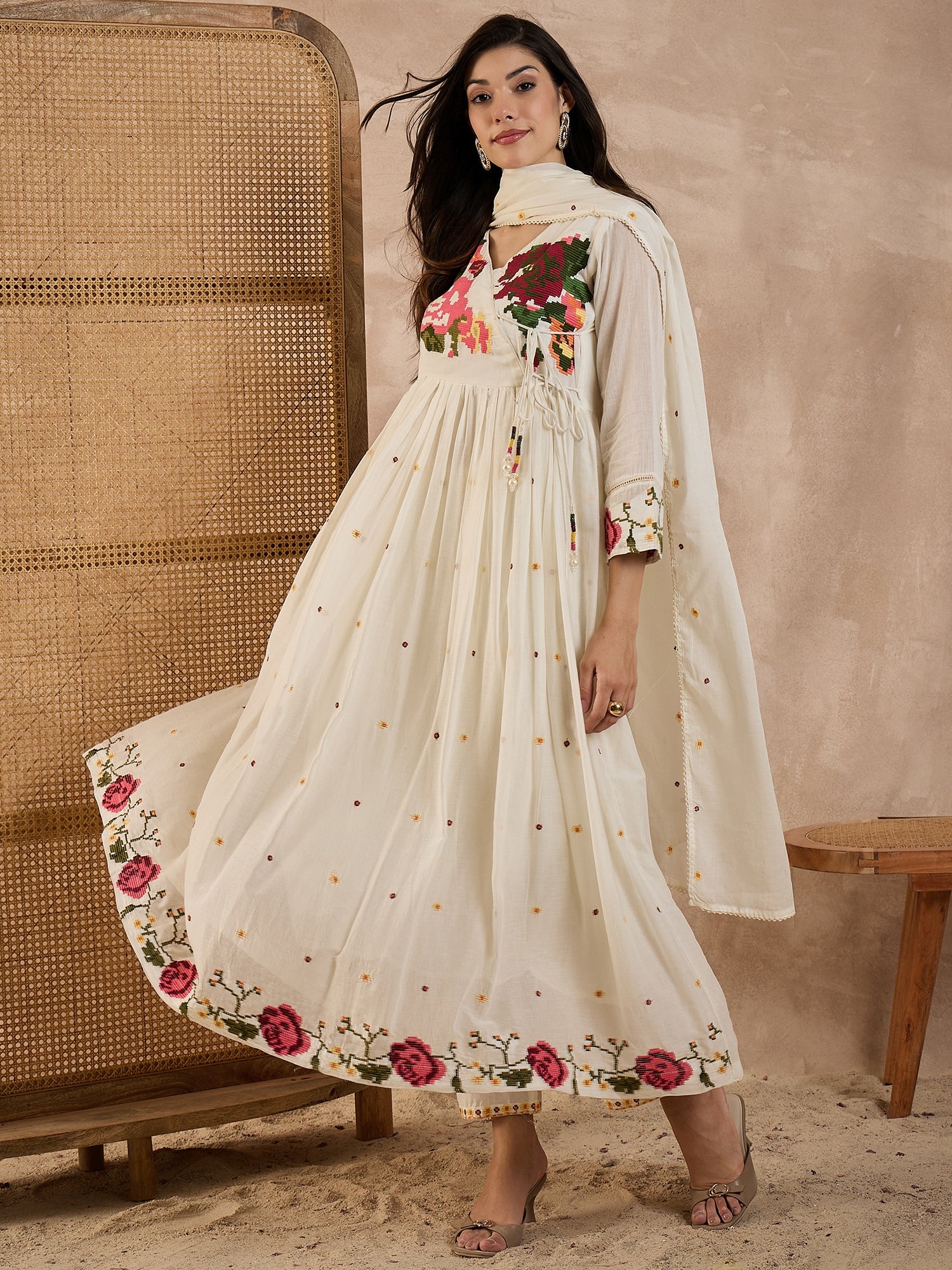WOMEN COTTON VOILE ANARKALI KURTA EMBLISHED WITH 3D TEXTURED EMBROIDERY ON YOKE ALONG WITH TROUSER AND DUPATTA