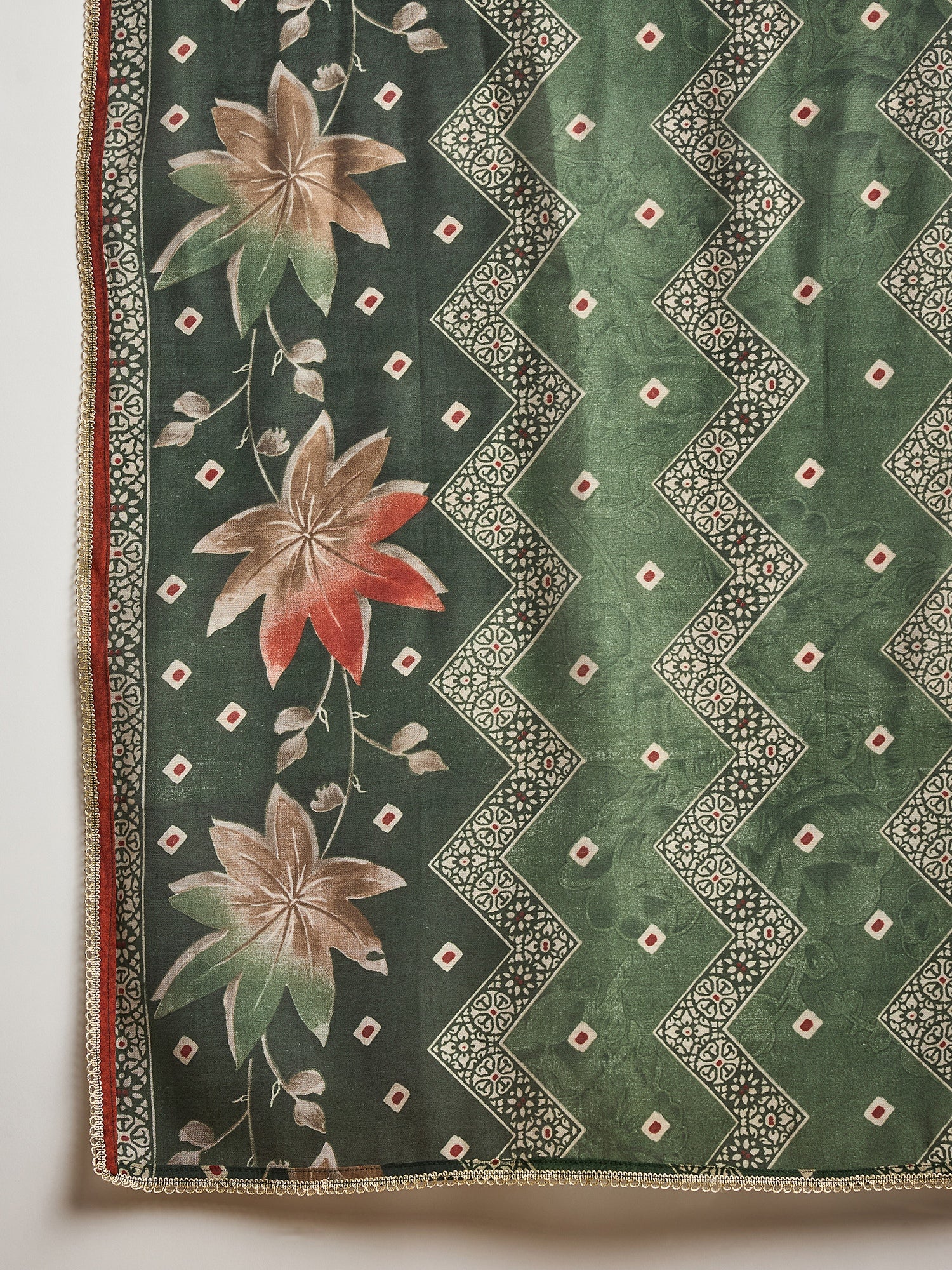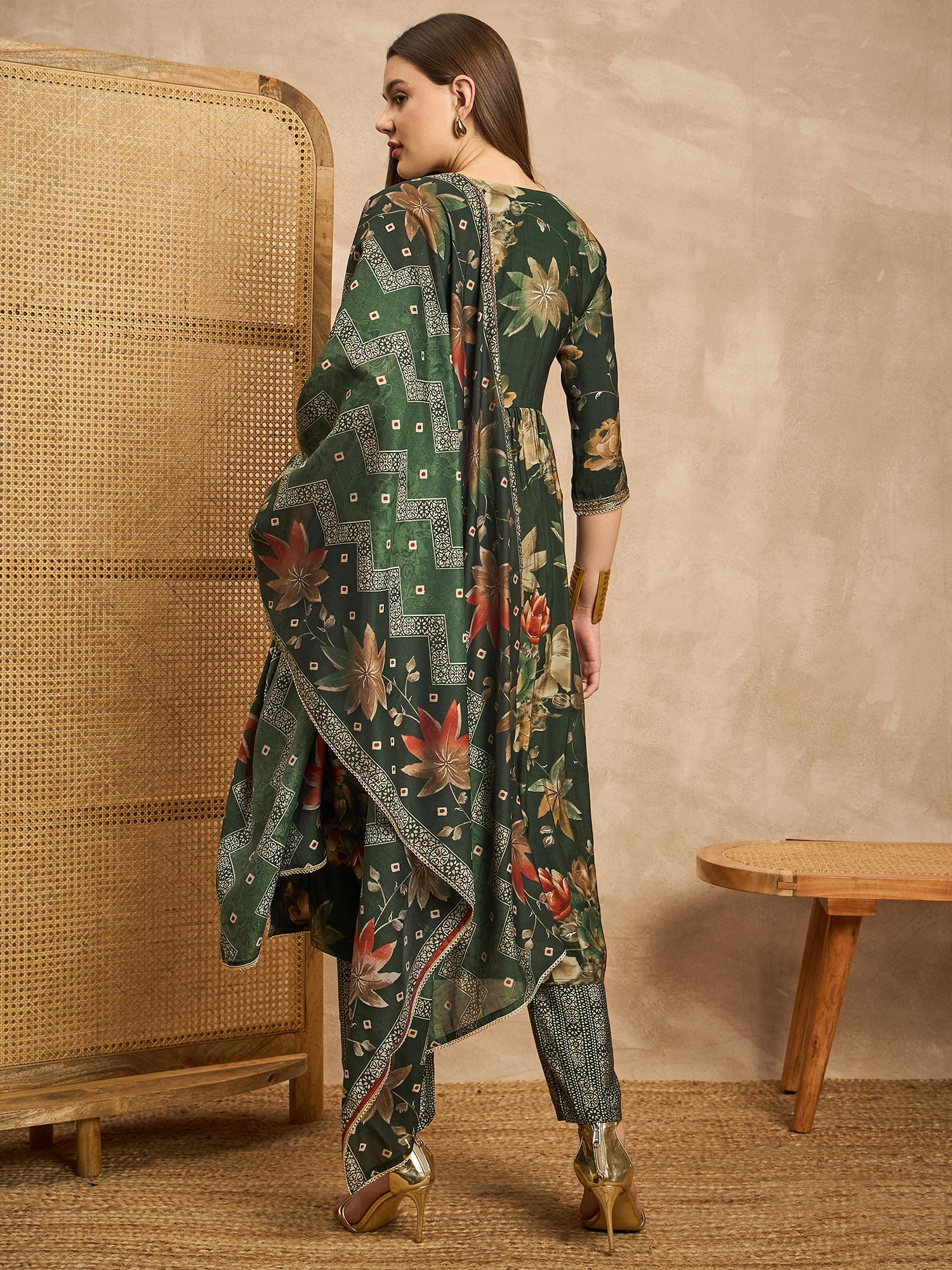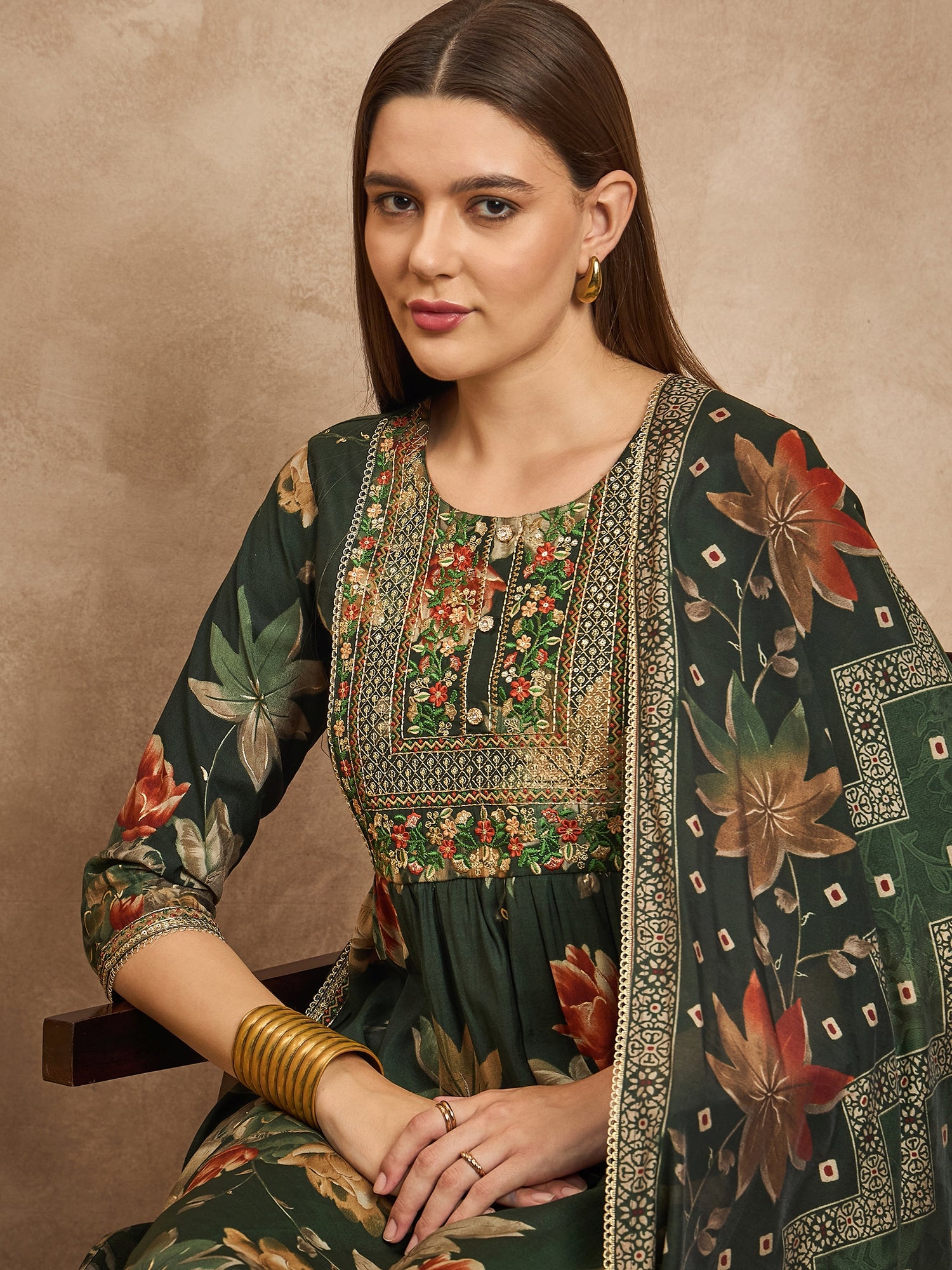 Women Ethnic Motifs Printed Pleated Thread Work Raw Silk Kurta with Trousers & With Dupatta