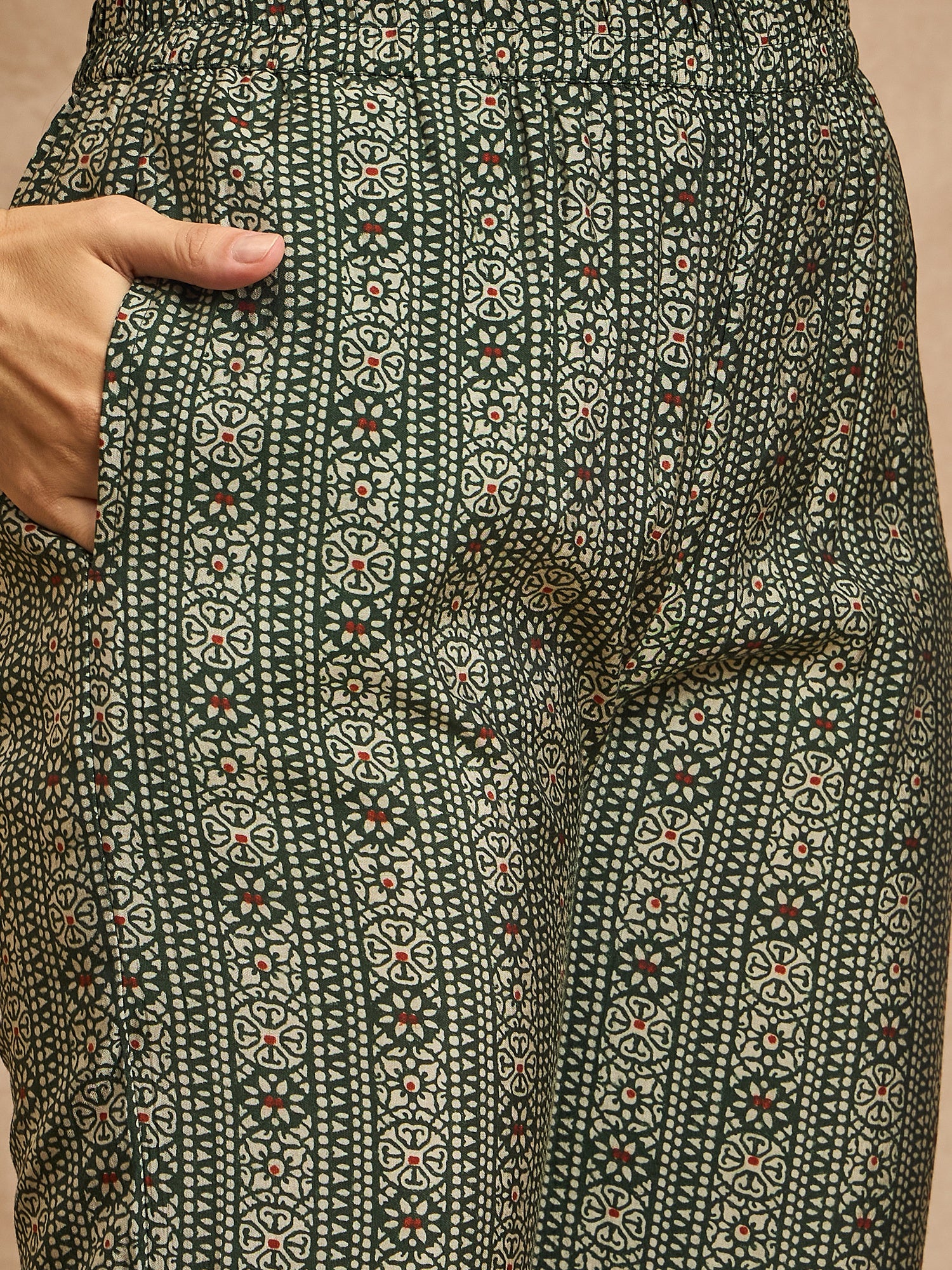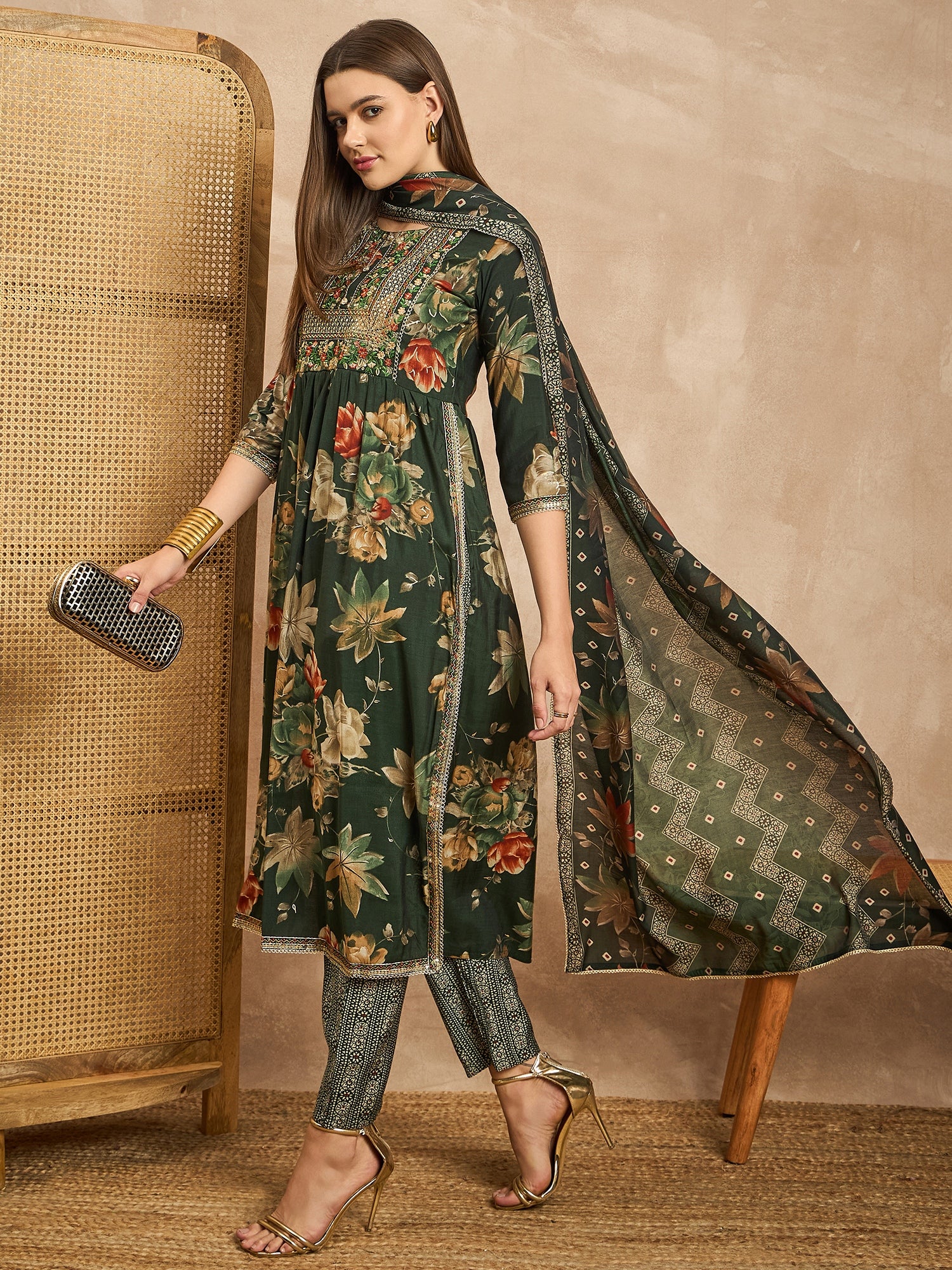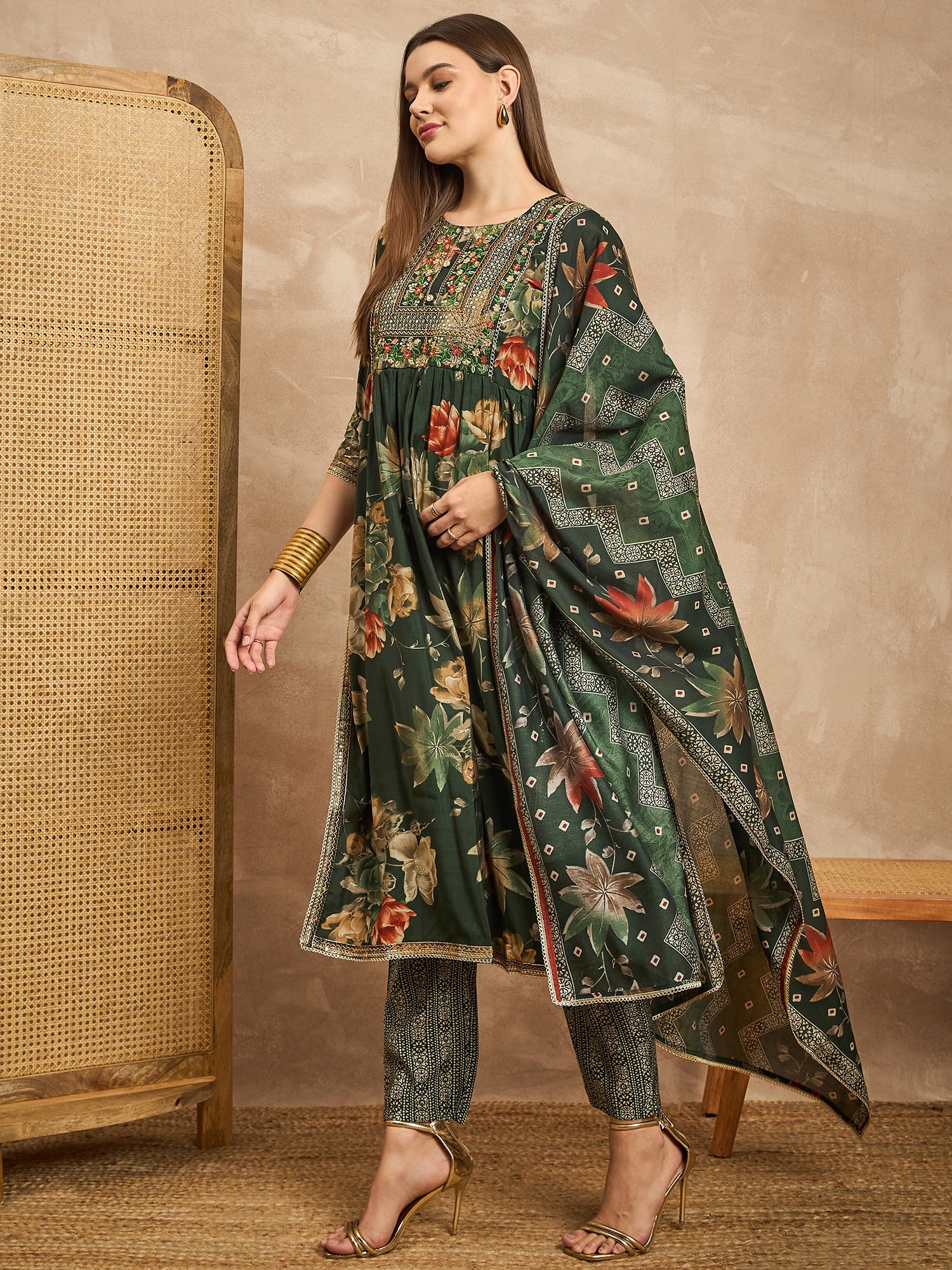 Women Ethnic Motifs Printed Pleated Thread Work Raw Silk Kurta with Trousers & With Dupatta