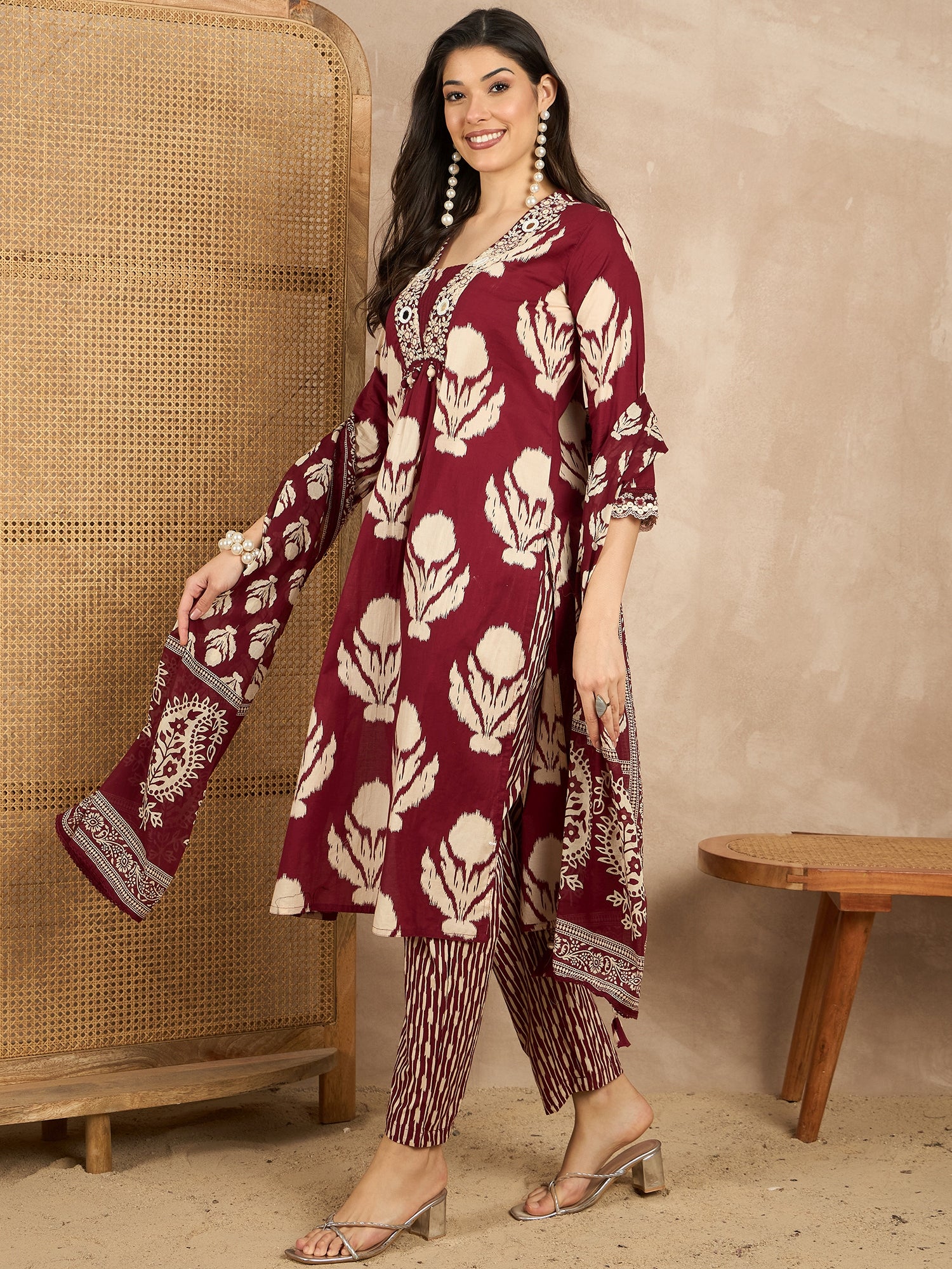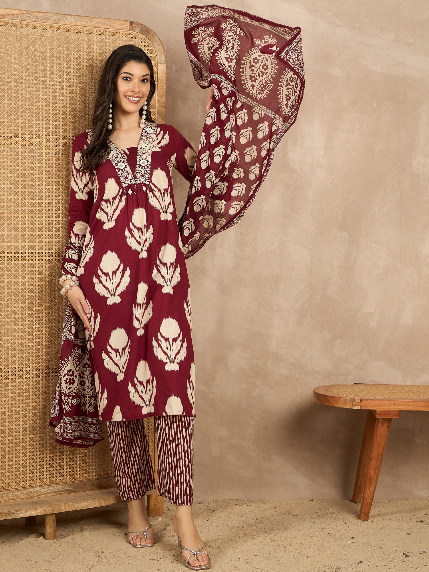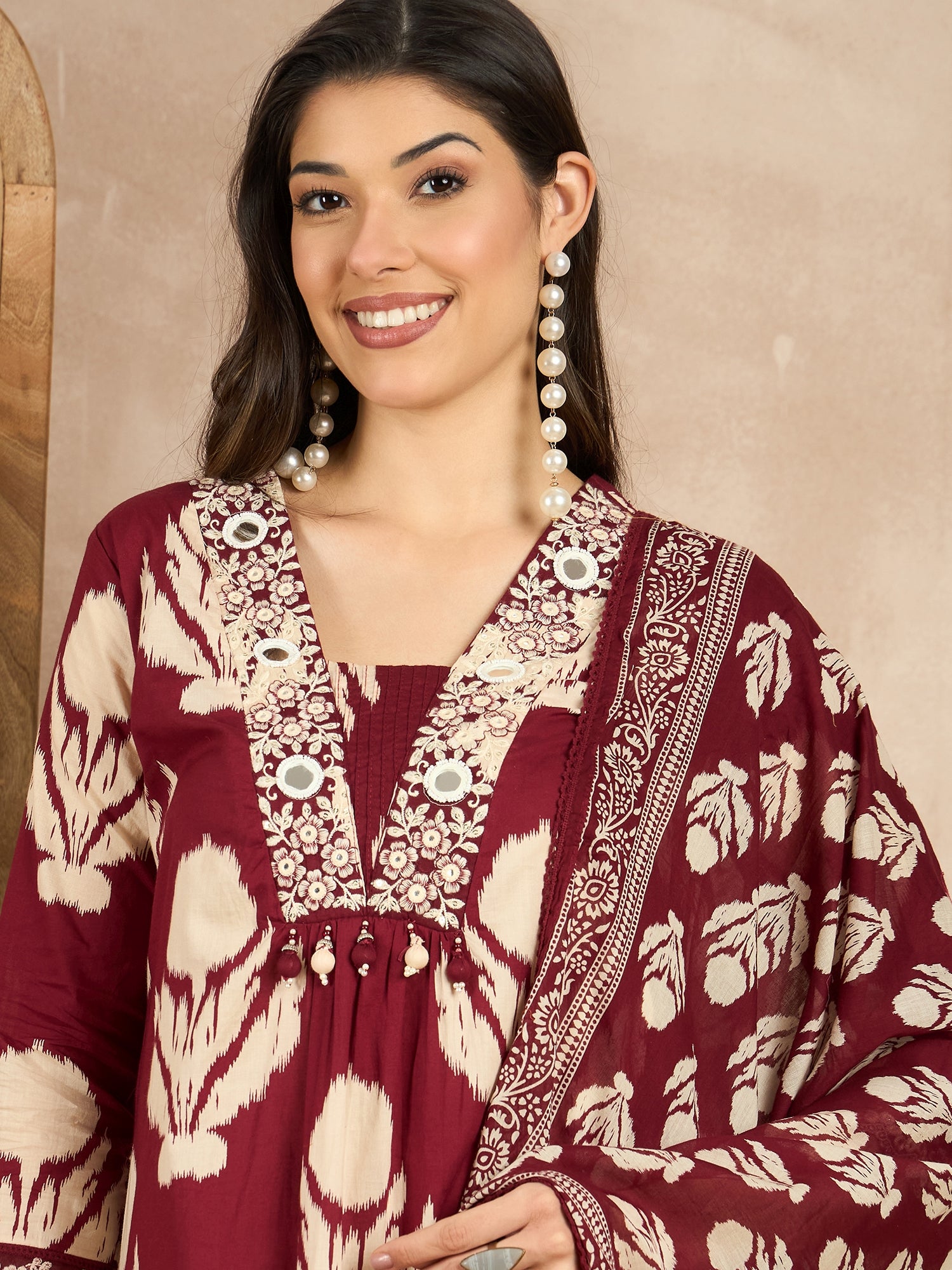 Women Ethnic Motifs Printed Regular Mirror Work Pure Cotton Kurta with Trousers & With Dupatta
