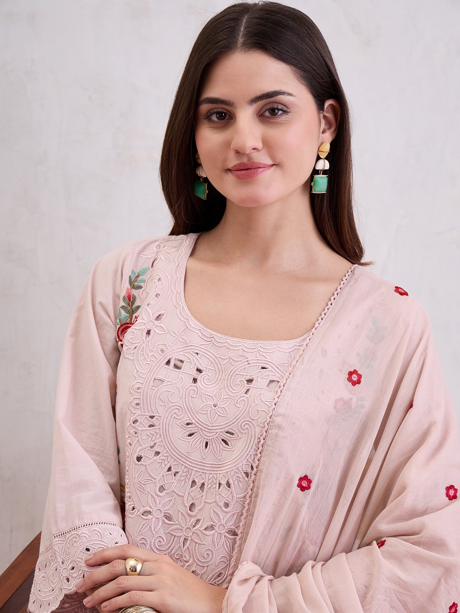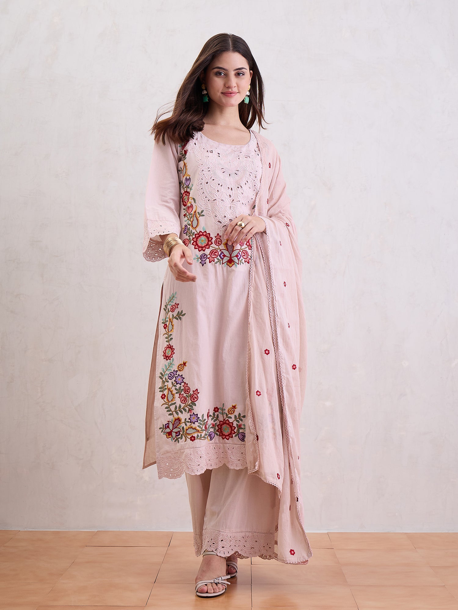 Women Floral Embroidered Cotton Kurta with Trousers & Dupatta