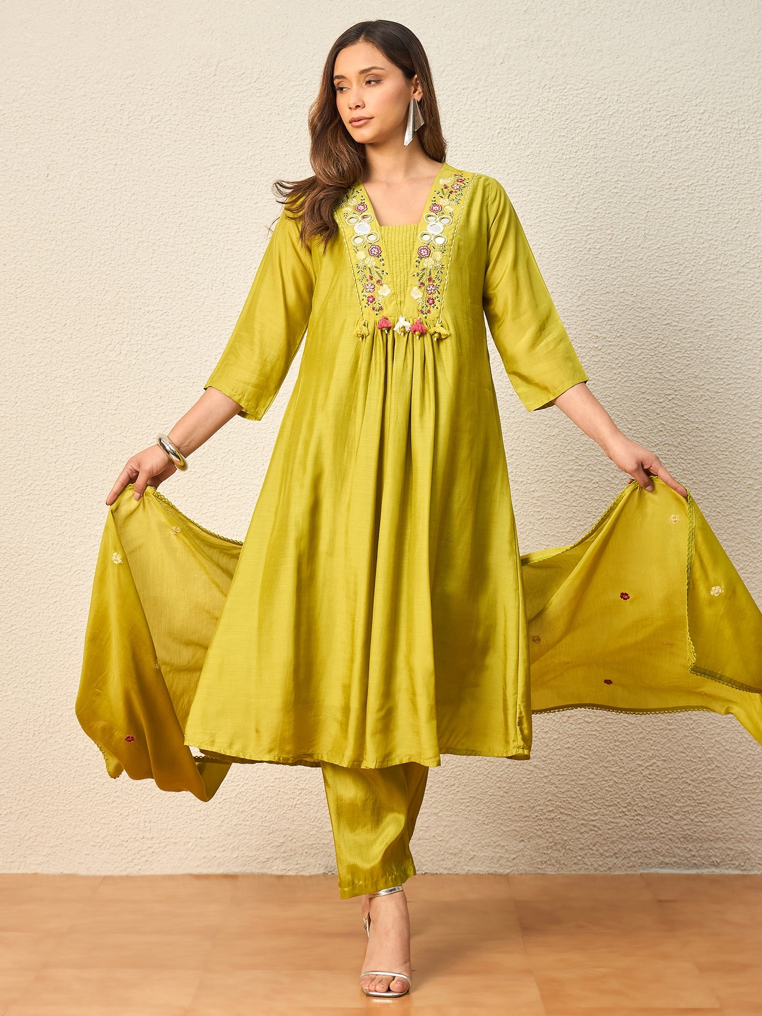 Women Floral Embroidered Empire Mirror Work Raw Silk Kurta with Trousers & With Dupatta
