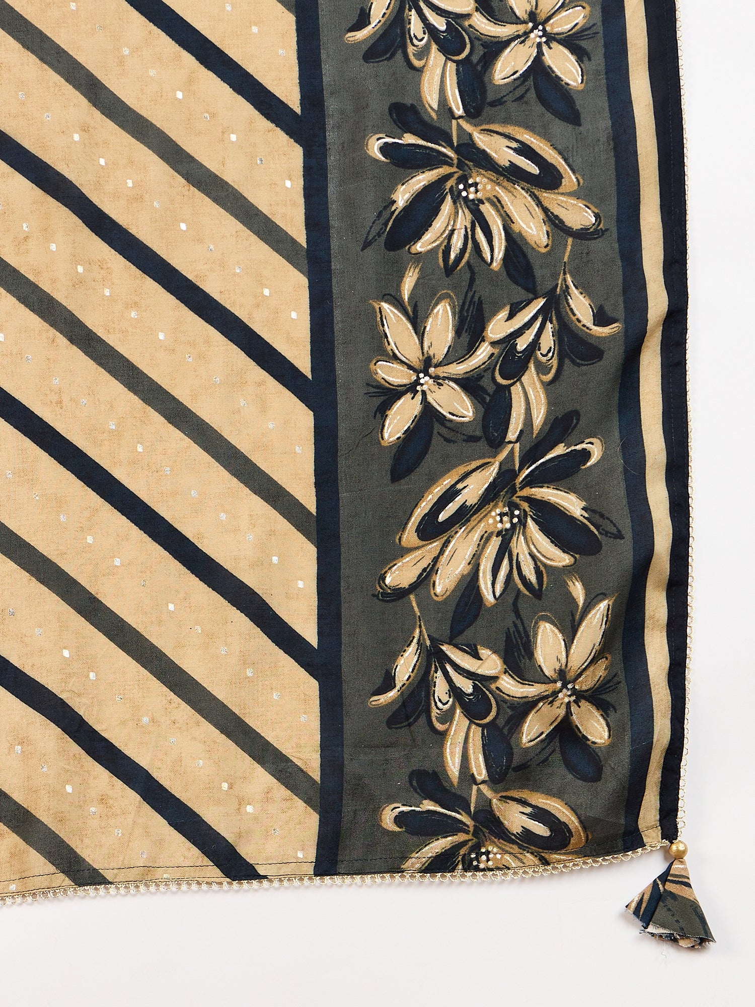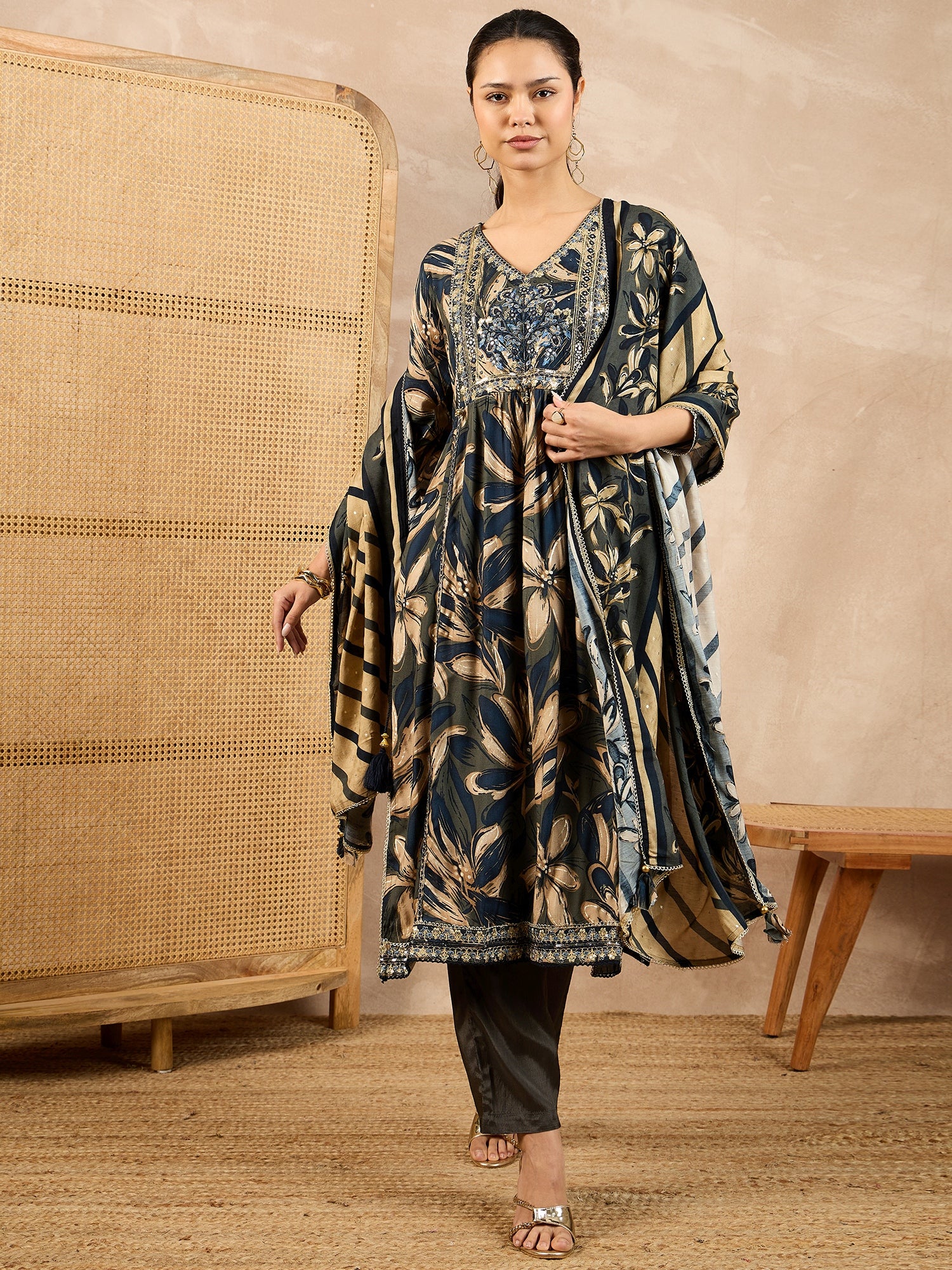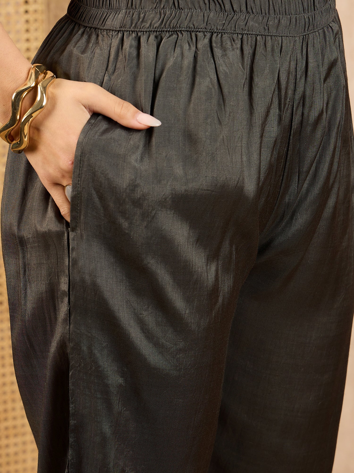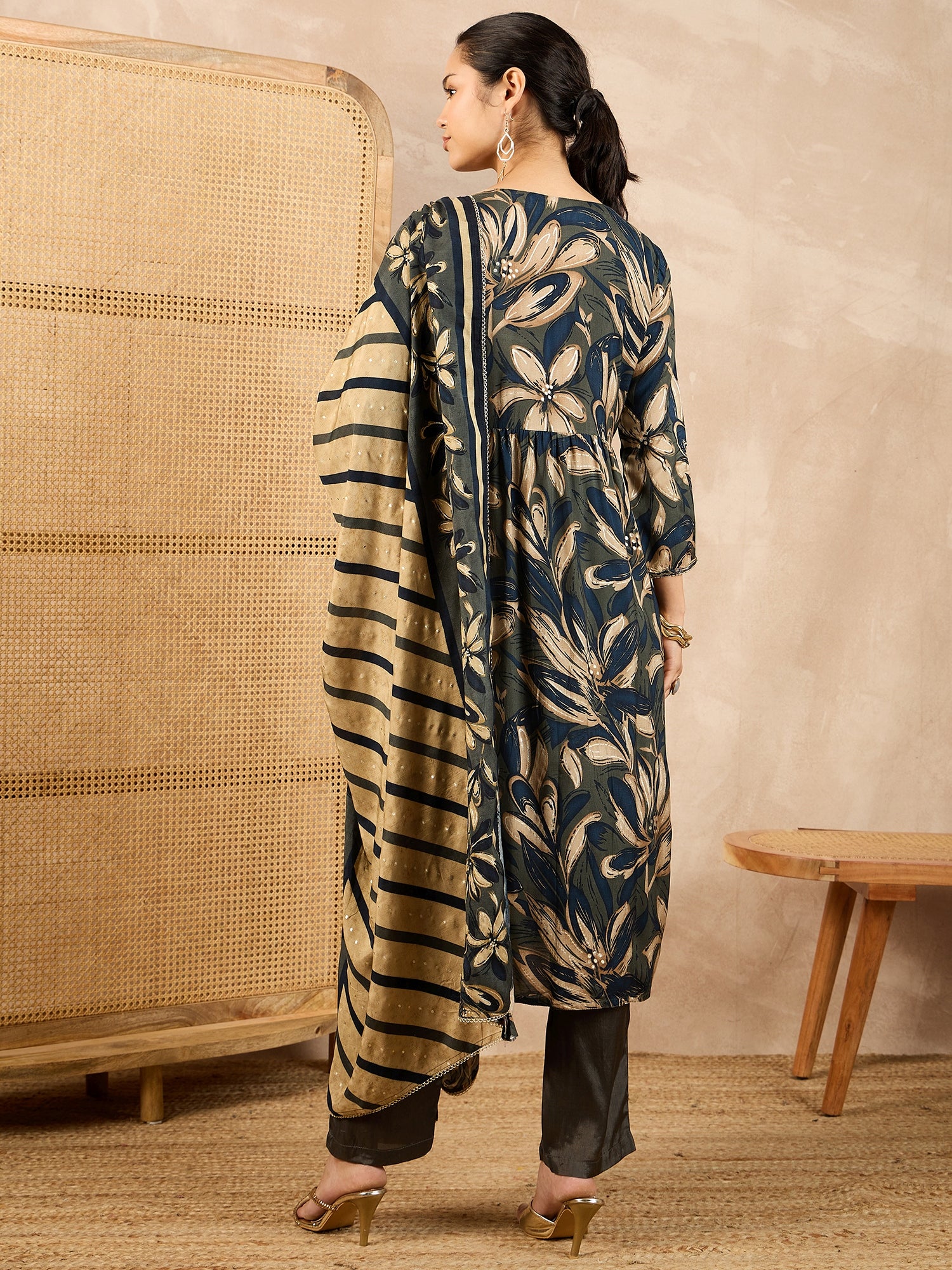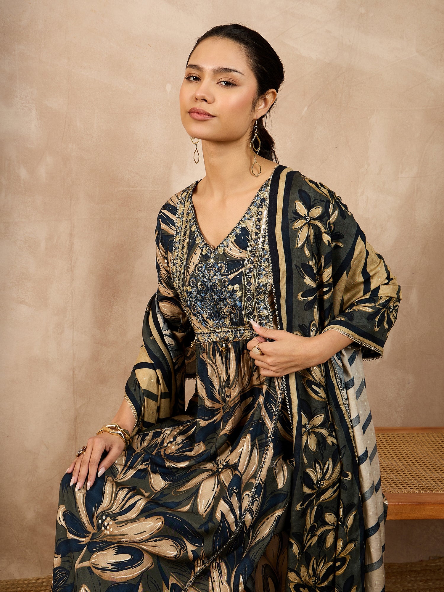 Women Floral Embroidered High Slit Beads and Stones Raw Silk Kurta with Trousers & With Dupatta