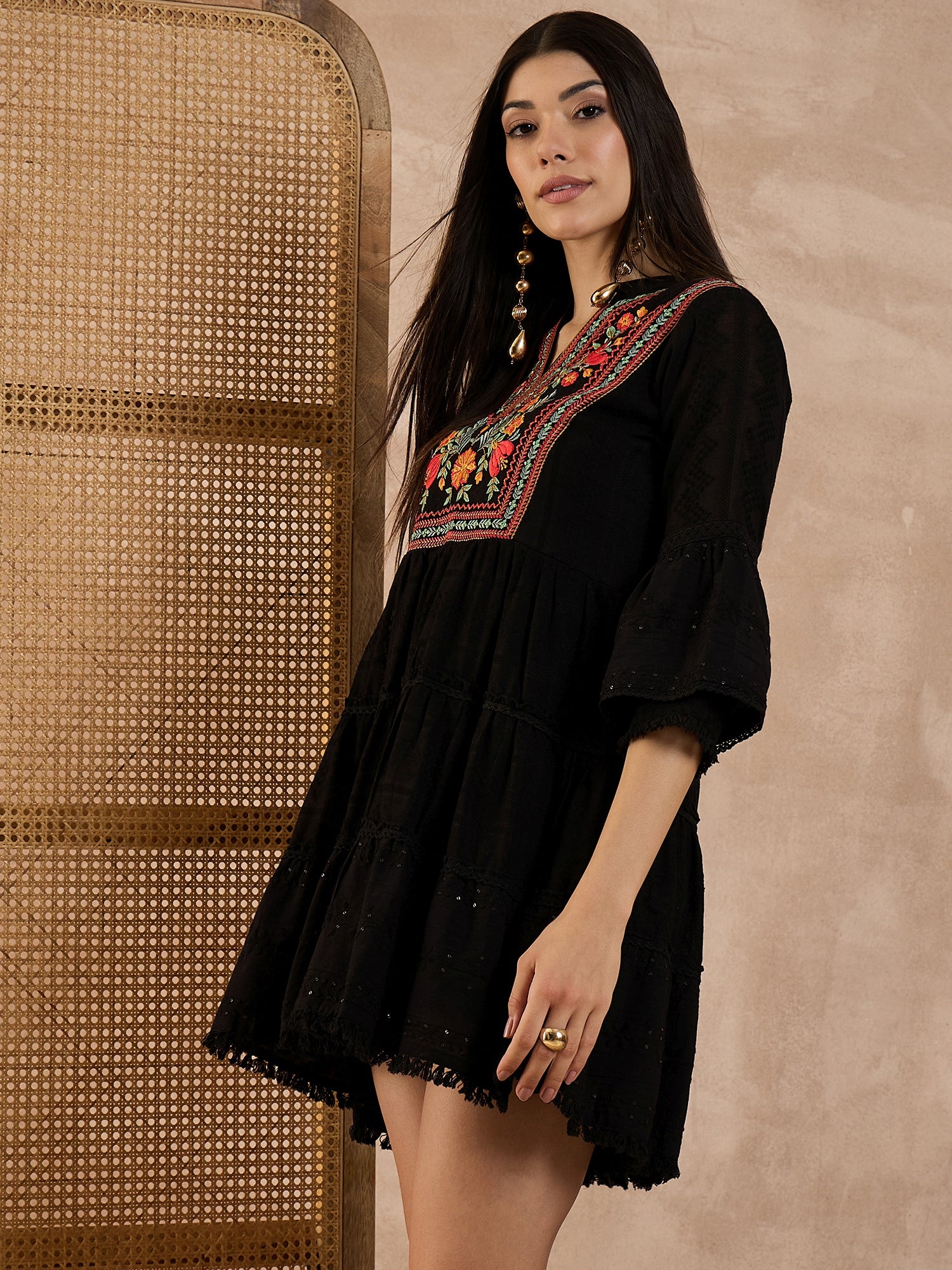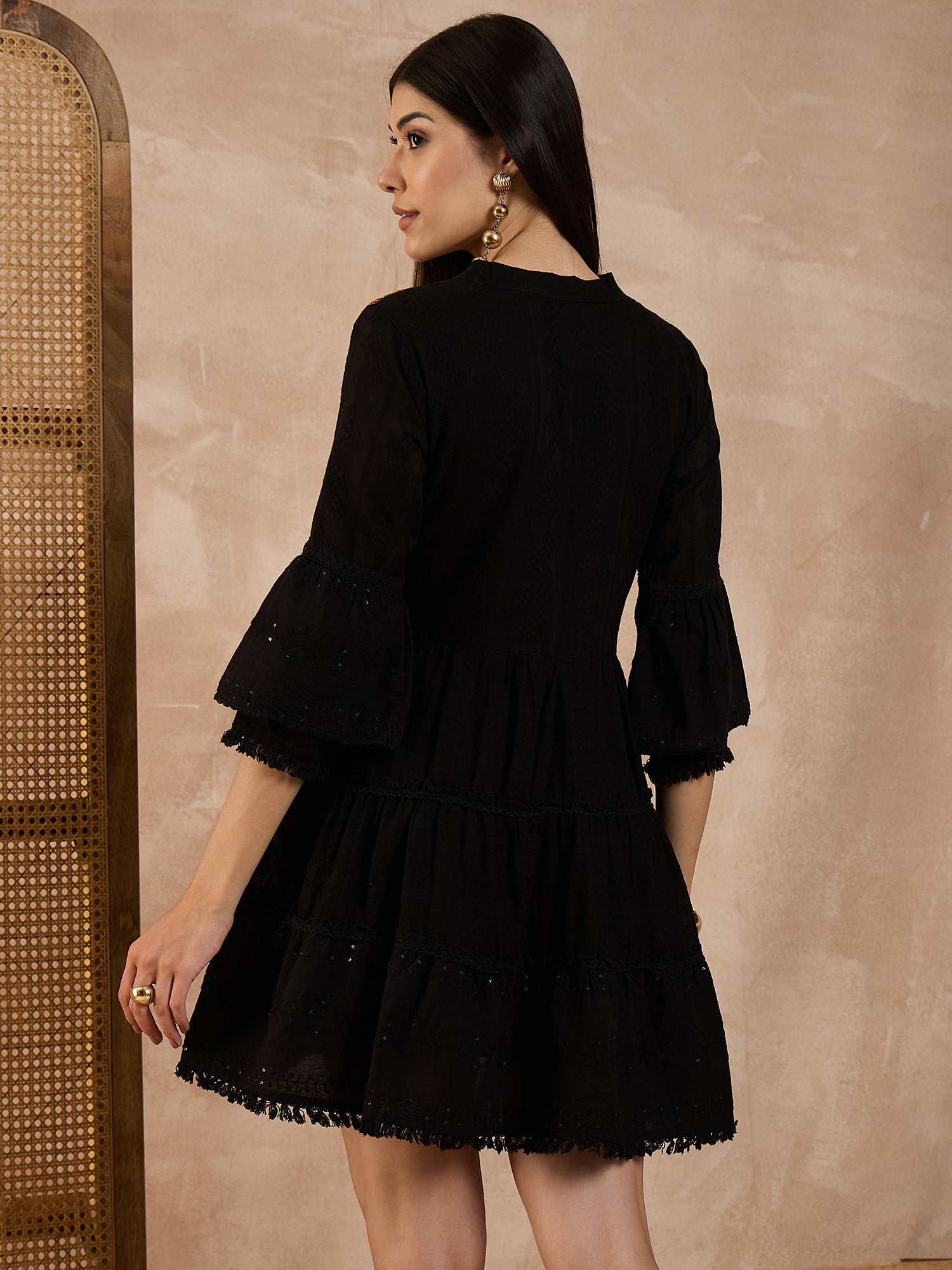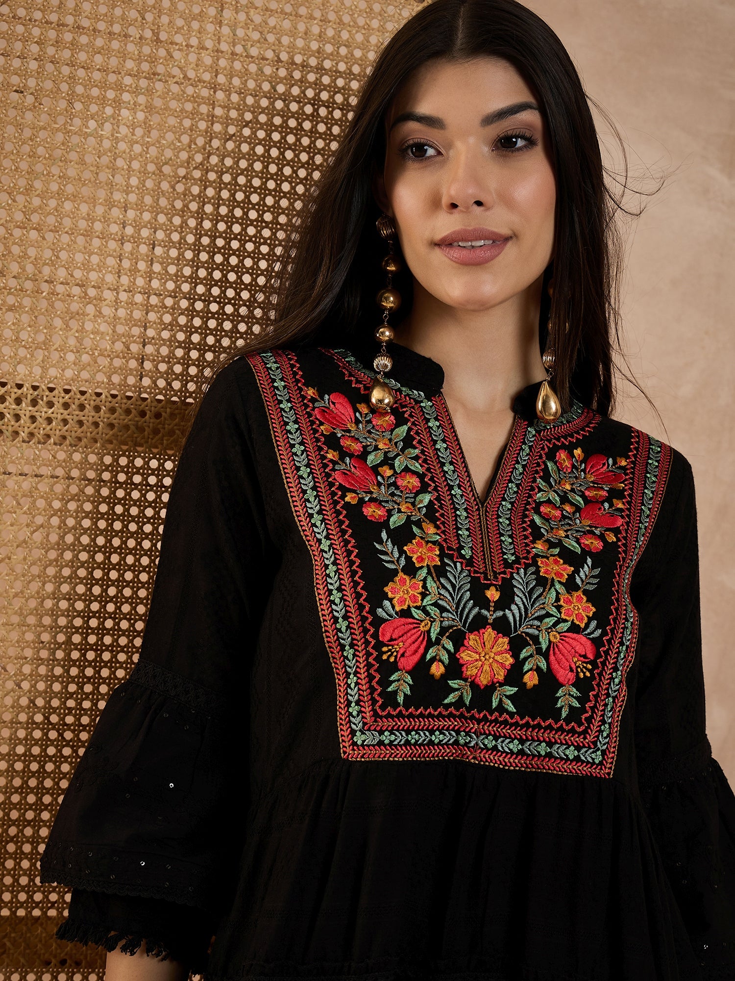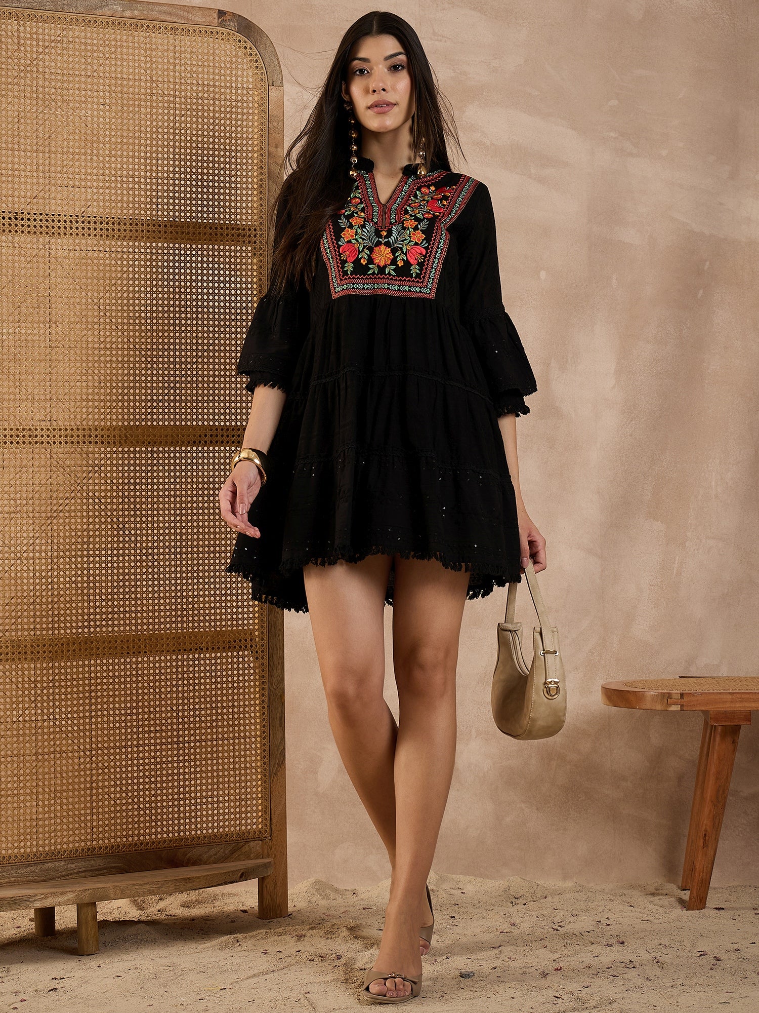 Women Floral Embroidered Mandarin Collar Organic Cotton Fit & Flare Mini Dobby Dress