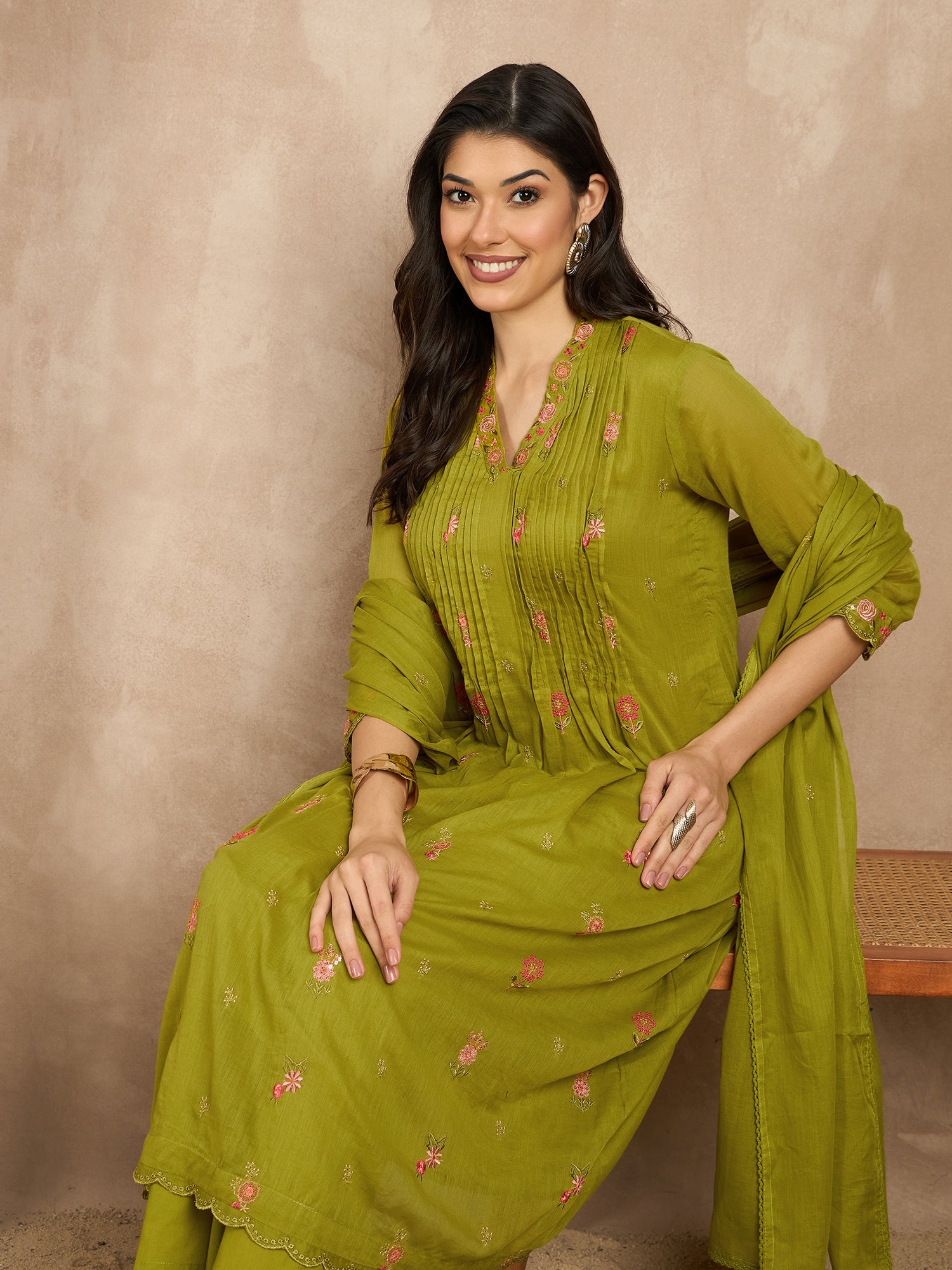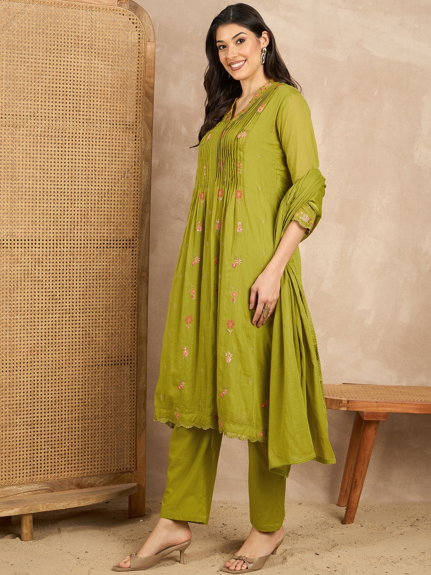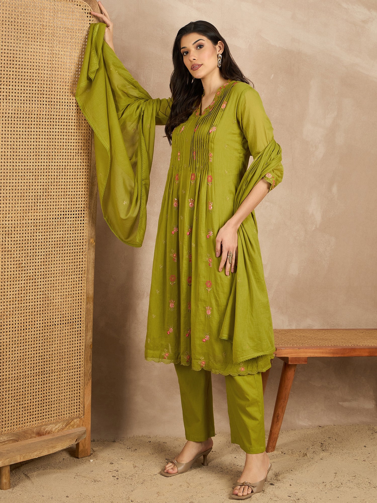 Women Floral Embroidered Pleated Thread Work Kurta with Trousers & With Dupatta