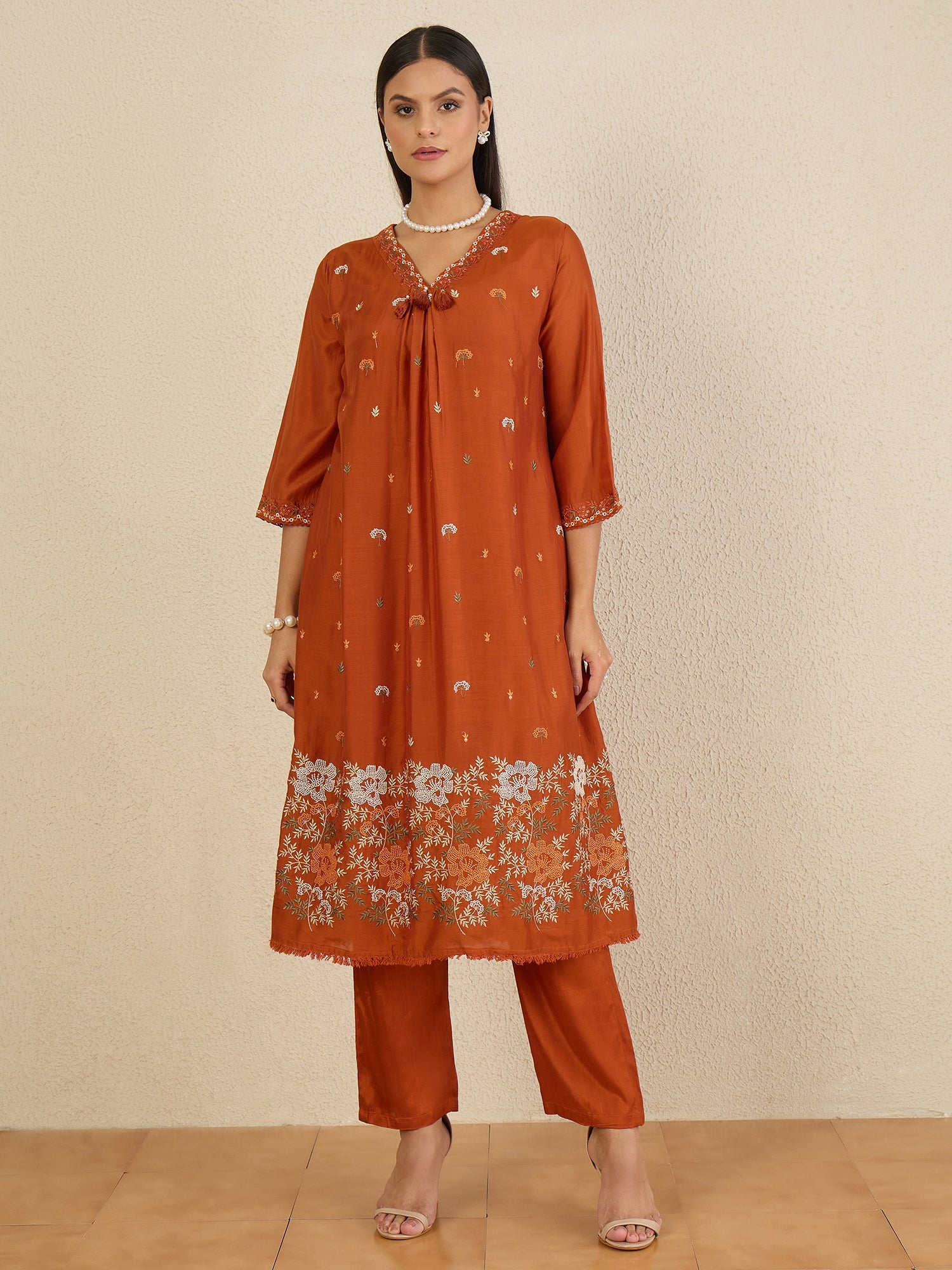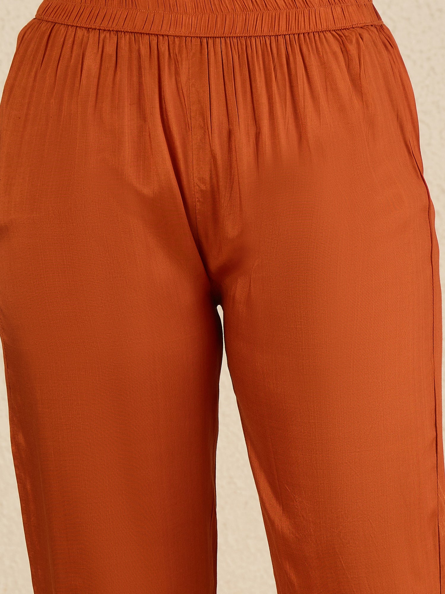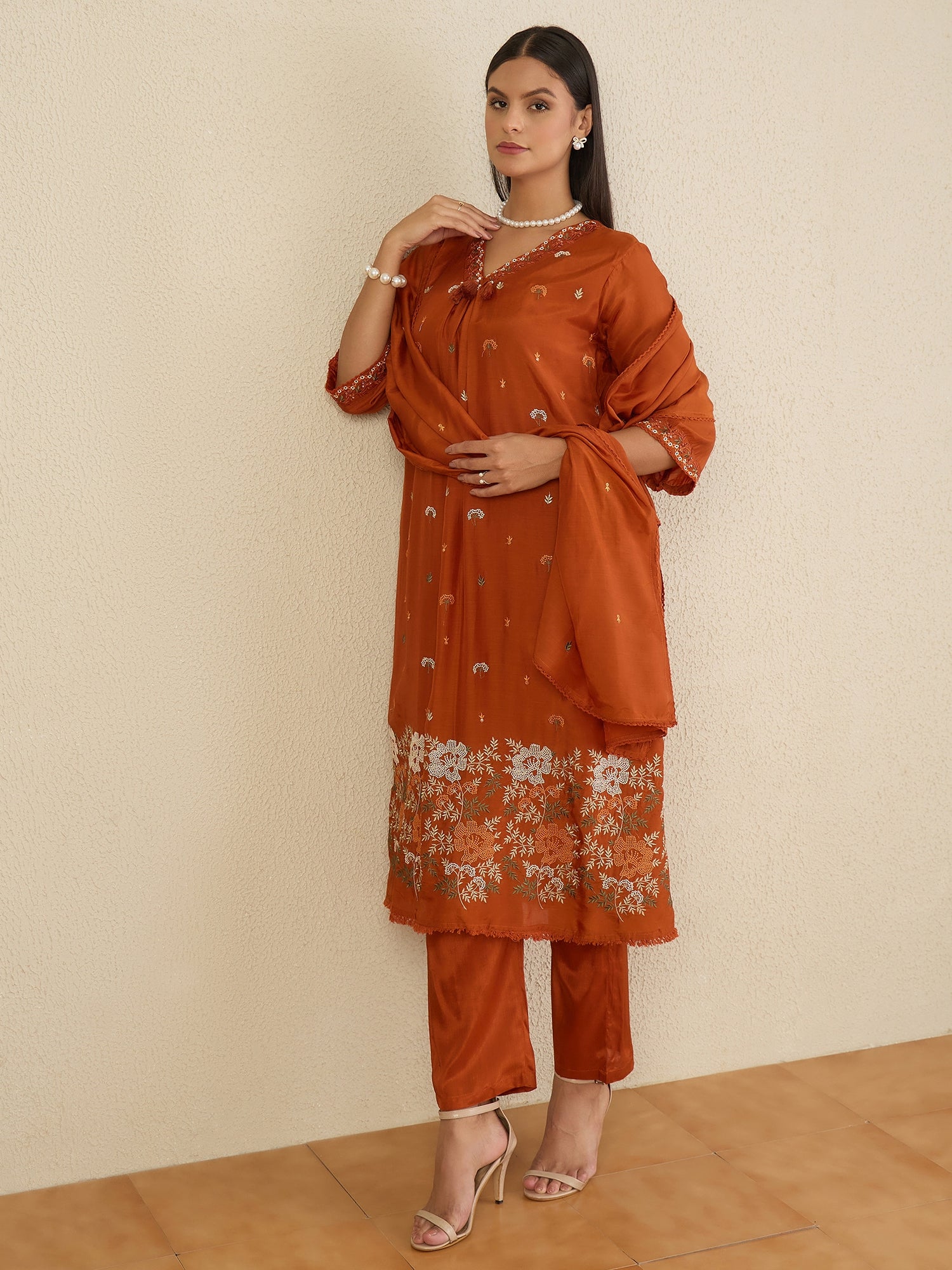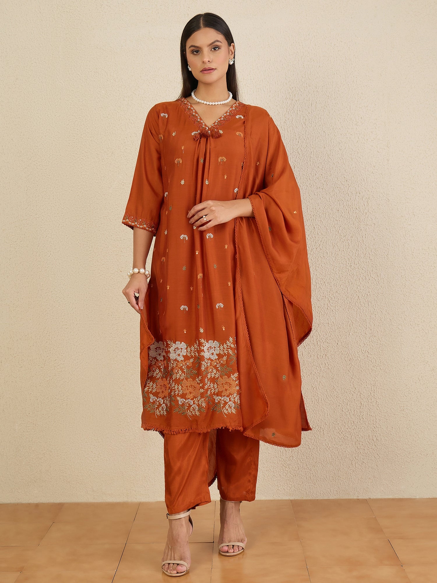 Rust embroidered Kurta with Trousers with dupatta