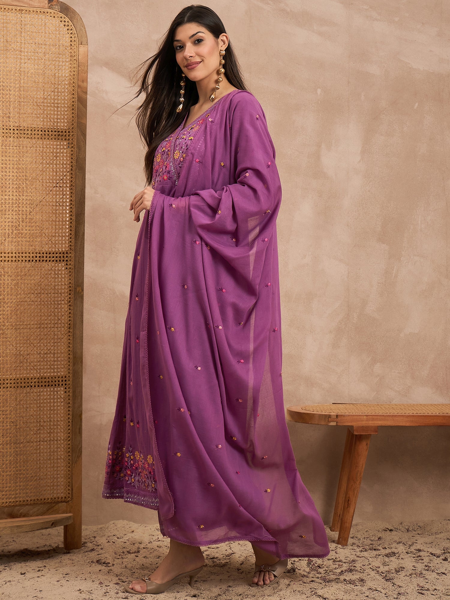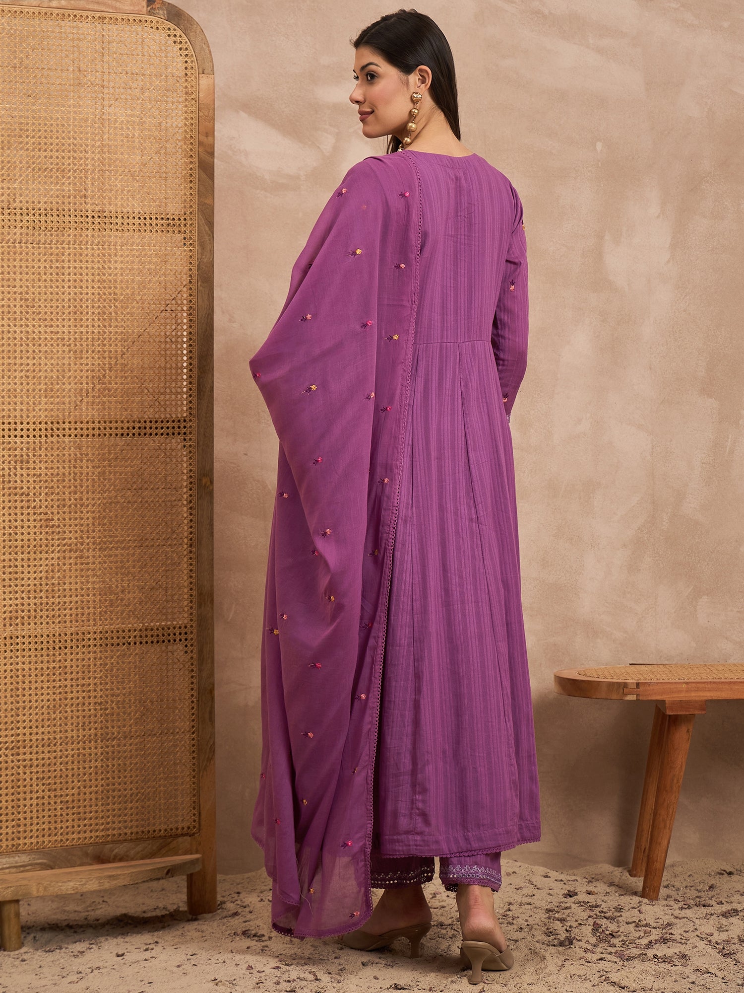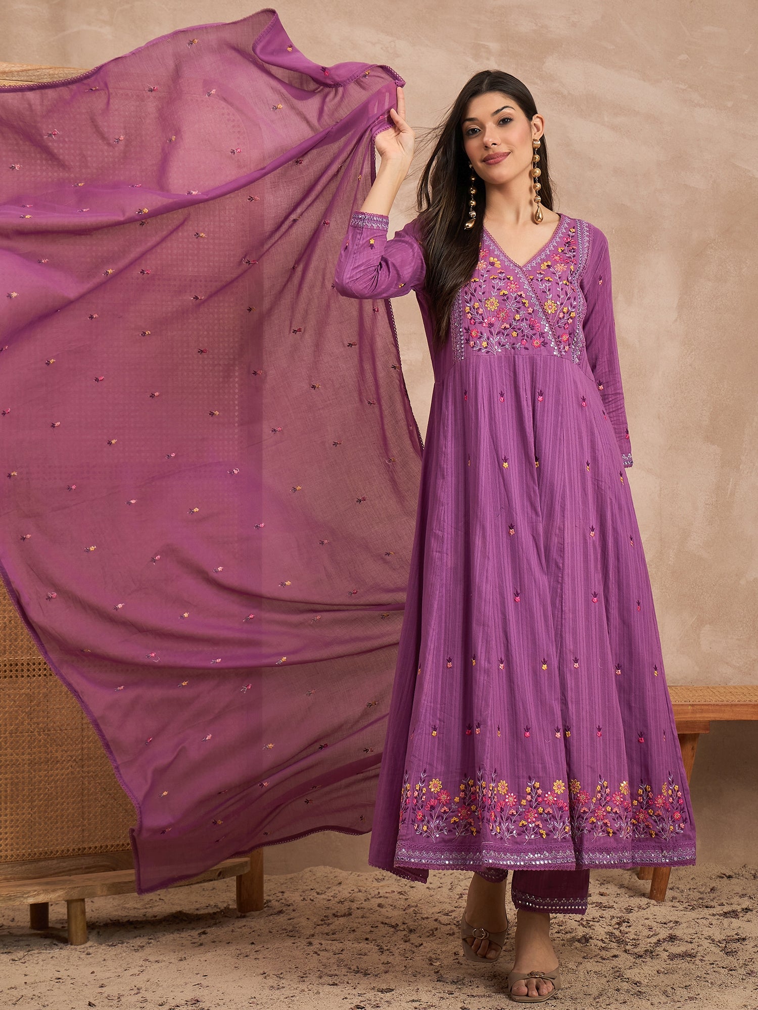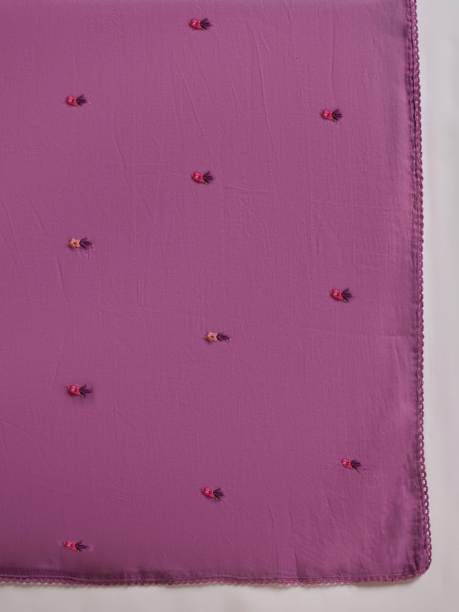 Lavender, silver-toned & yellow embroidered Kurta with Trousers with dupatta