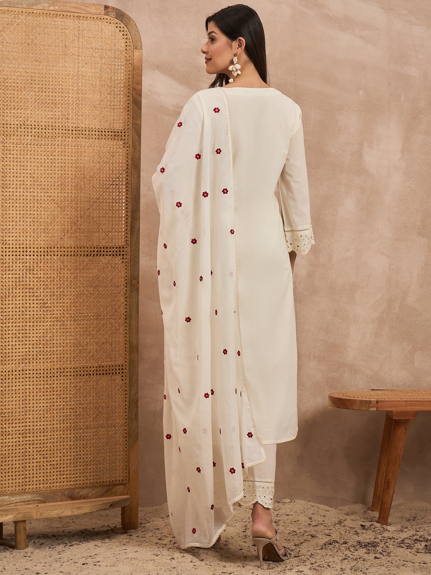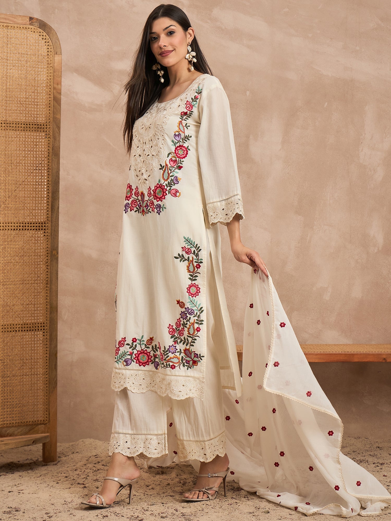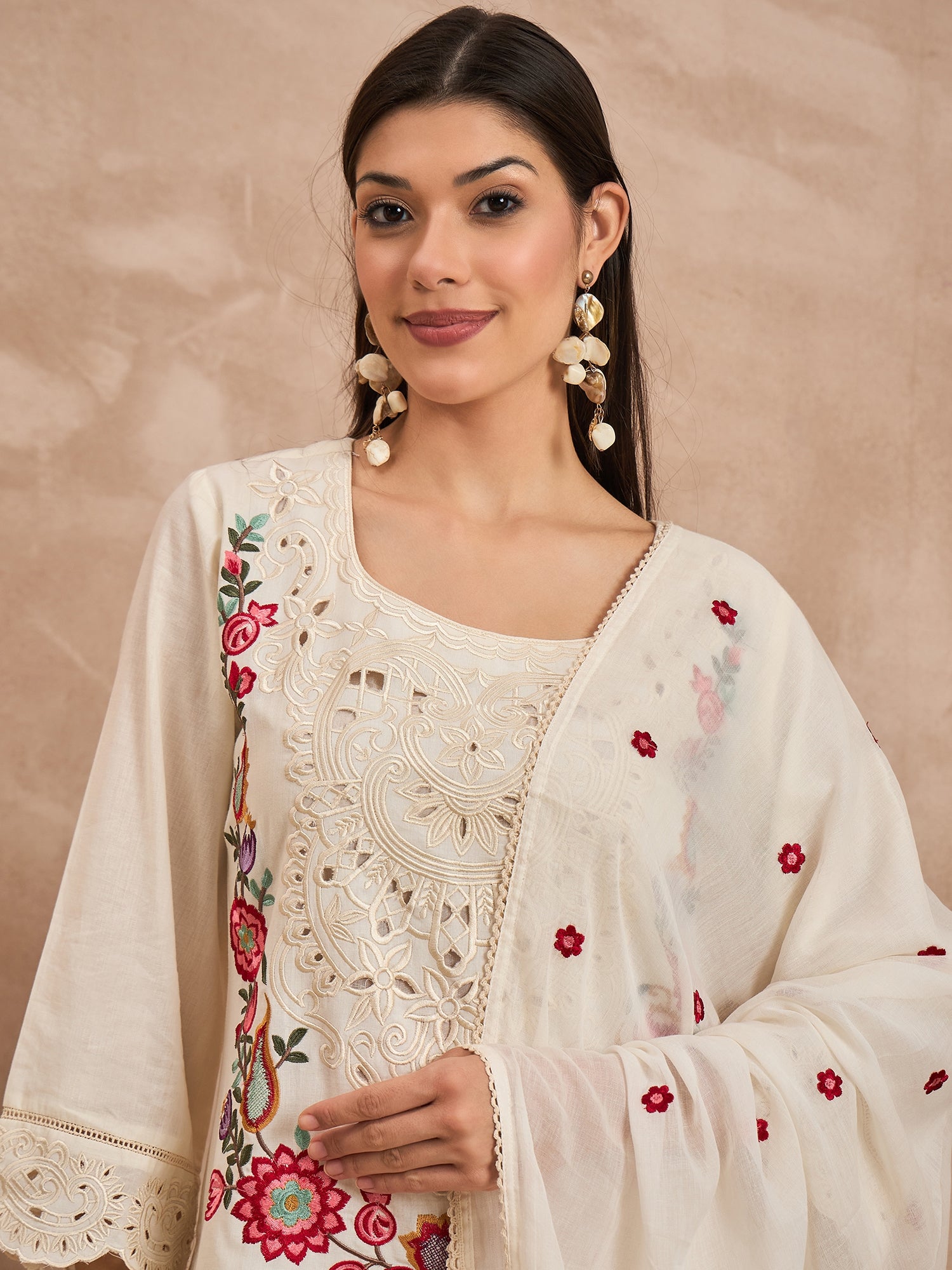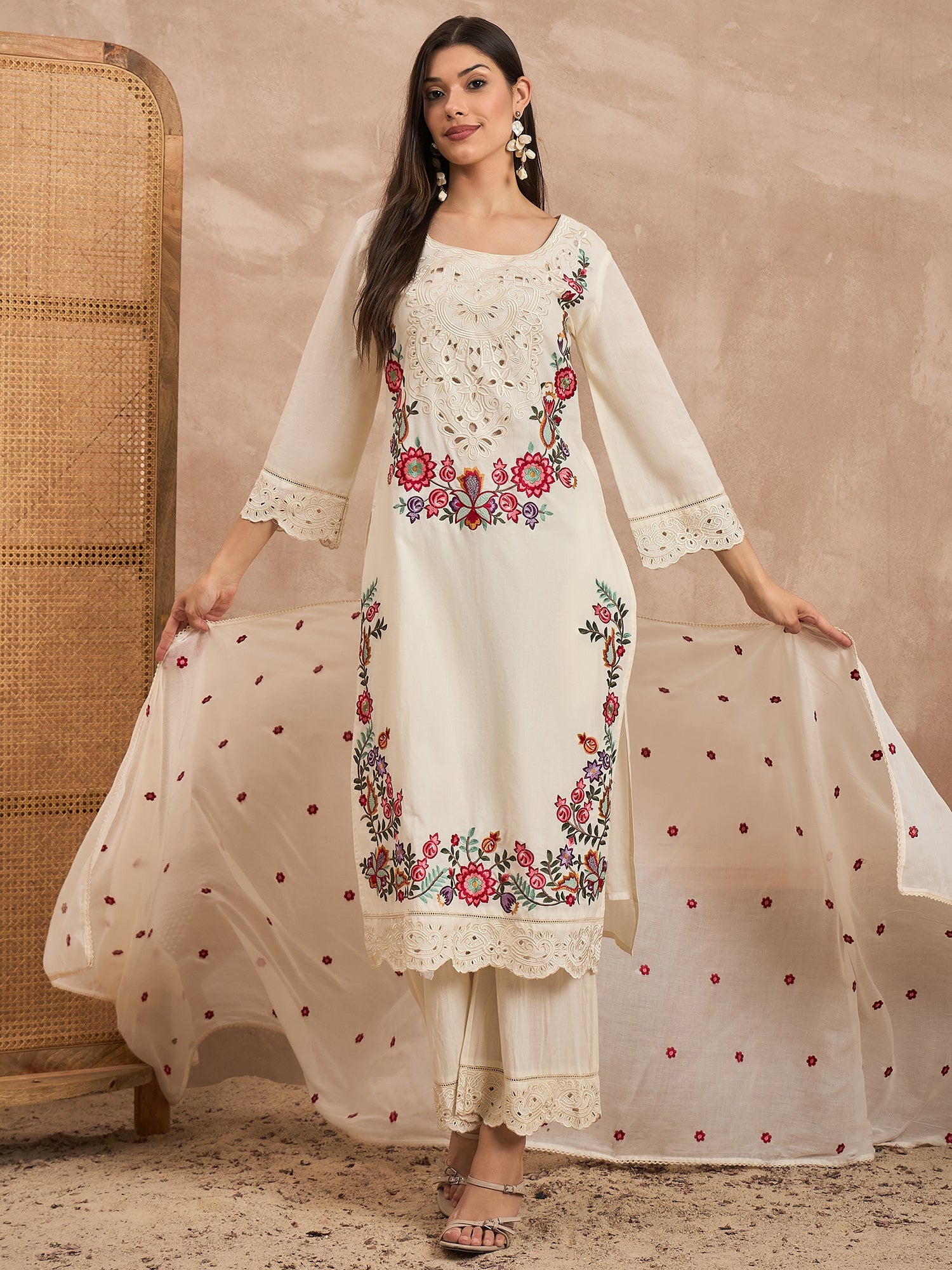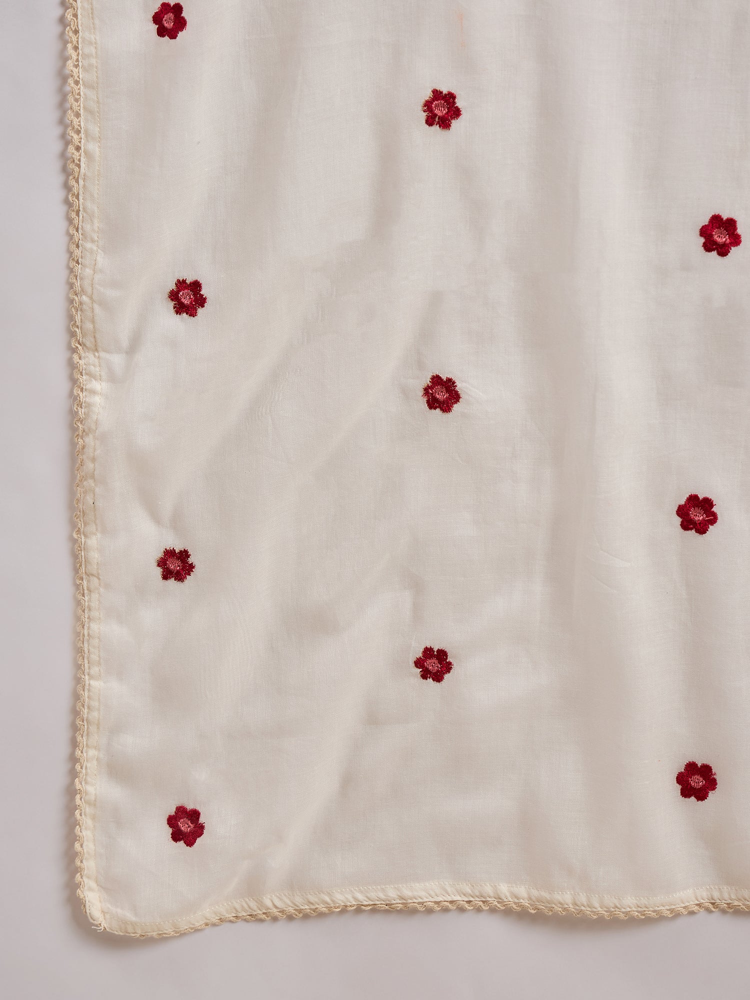 White, red & green embroidered Kurta with Trousers with dupatta