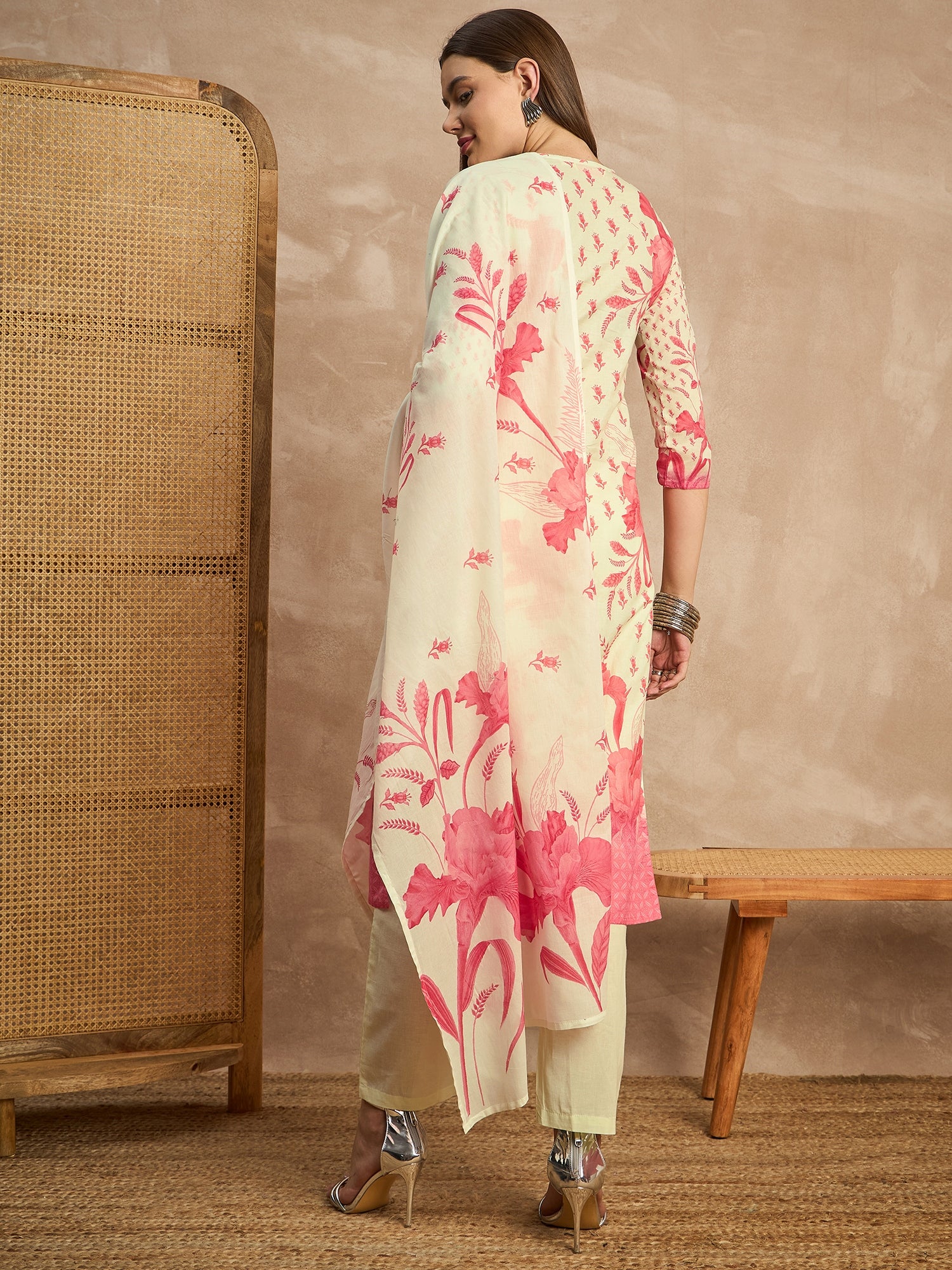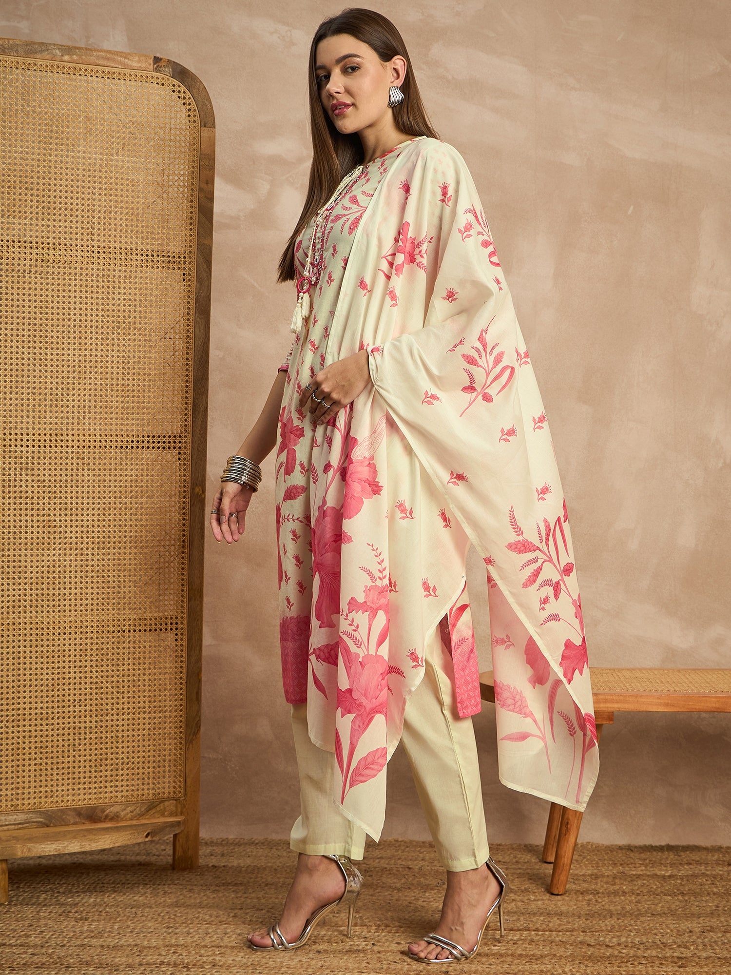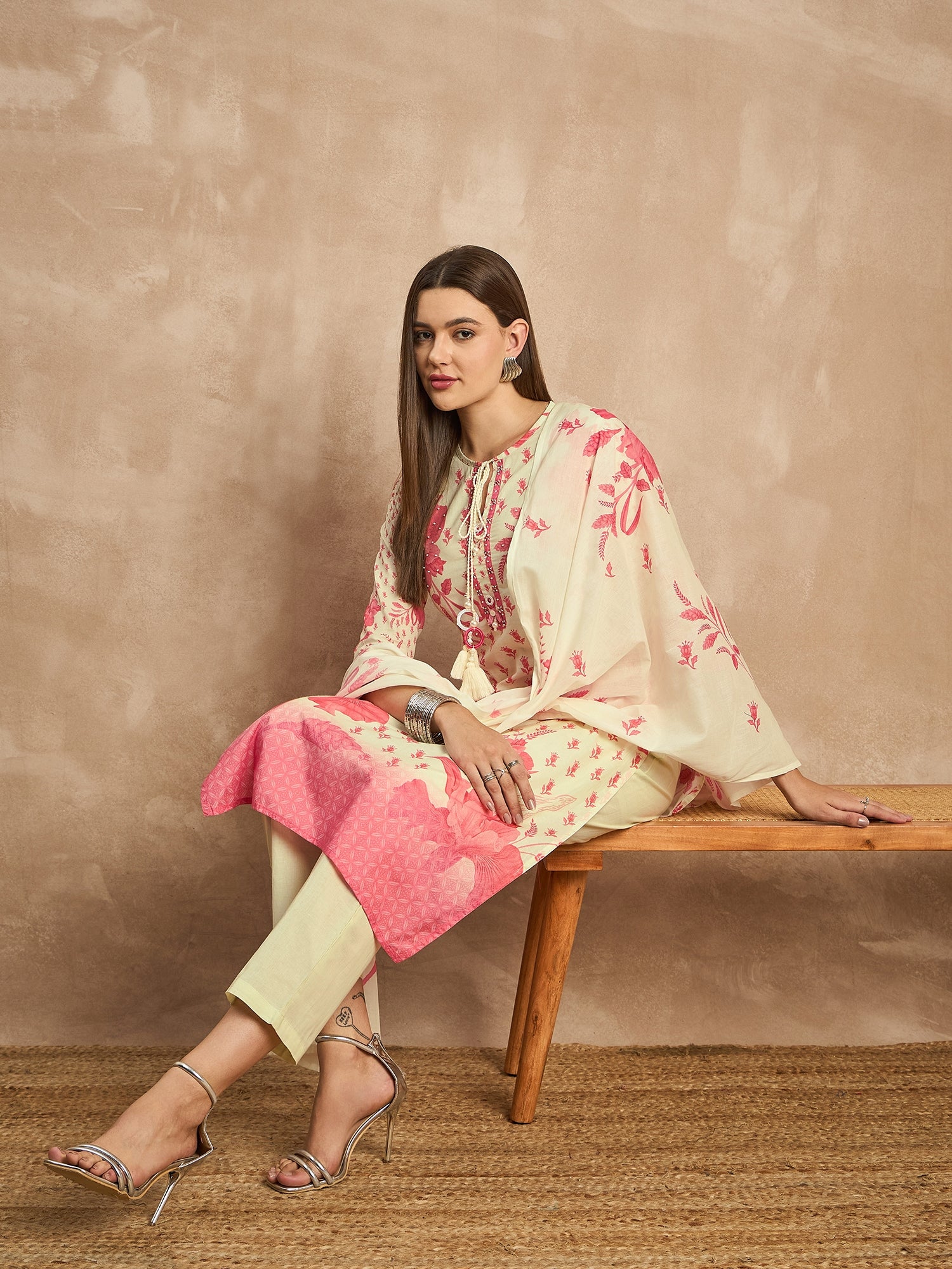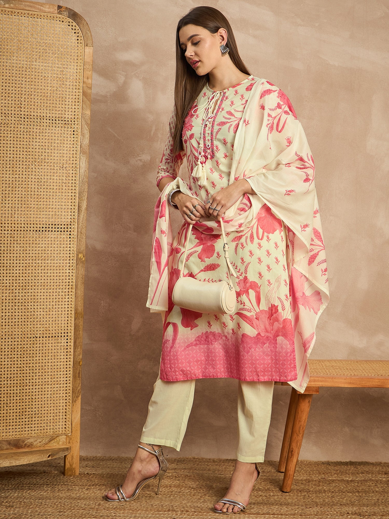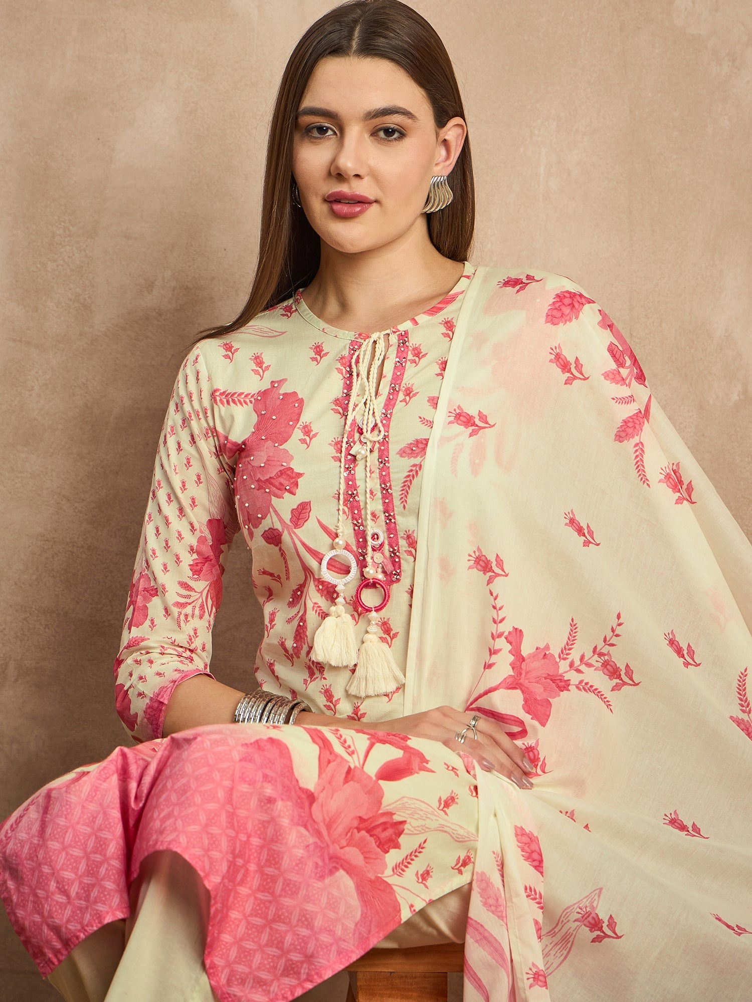 Women Floral Printed Beads and Stones Pure Cotton Kurta with Trousers & Dupatta