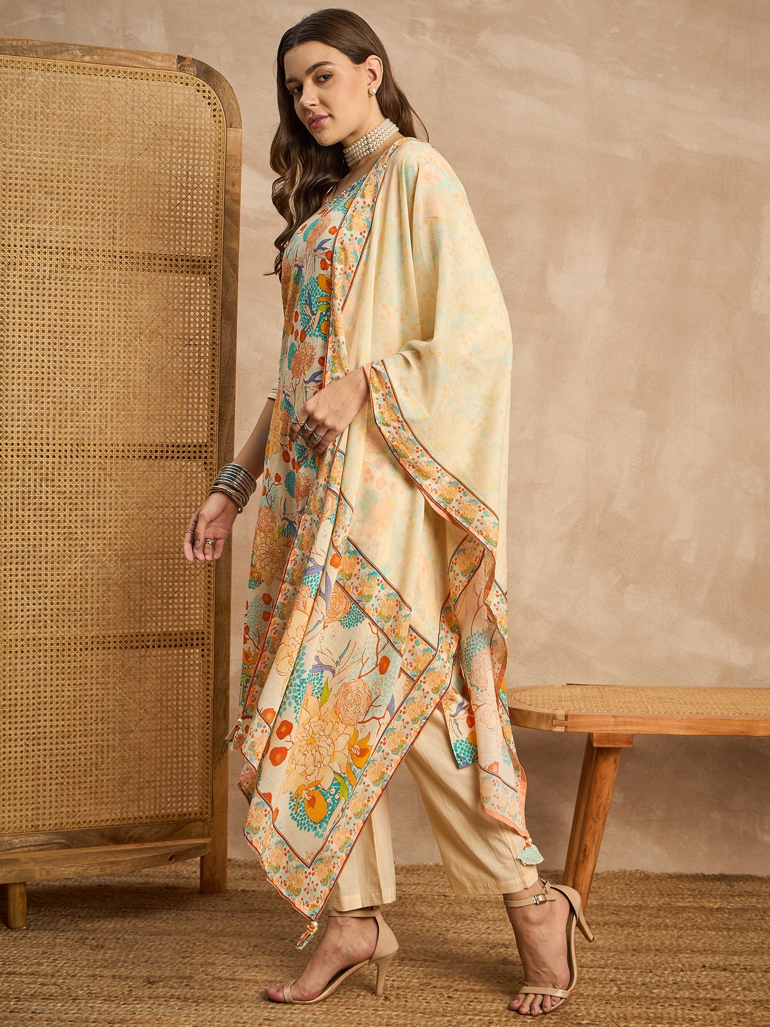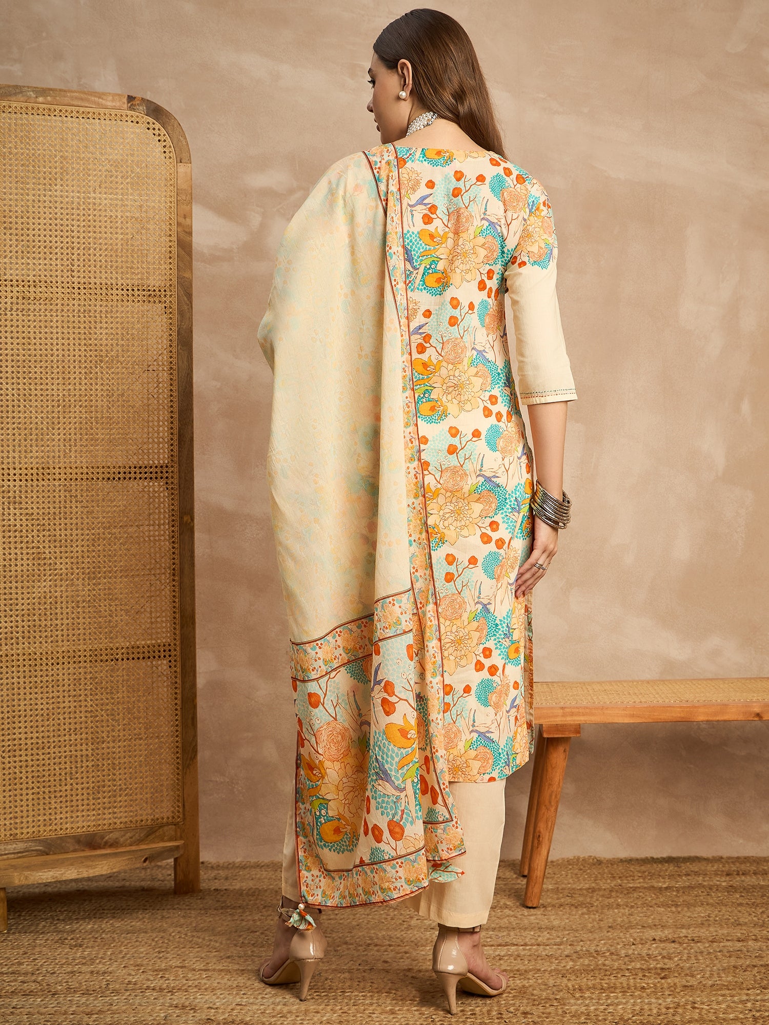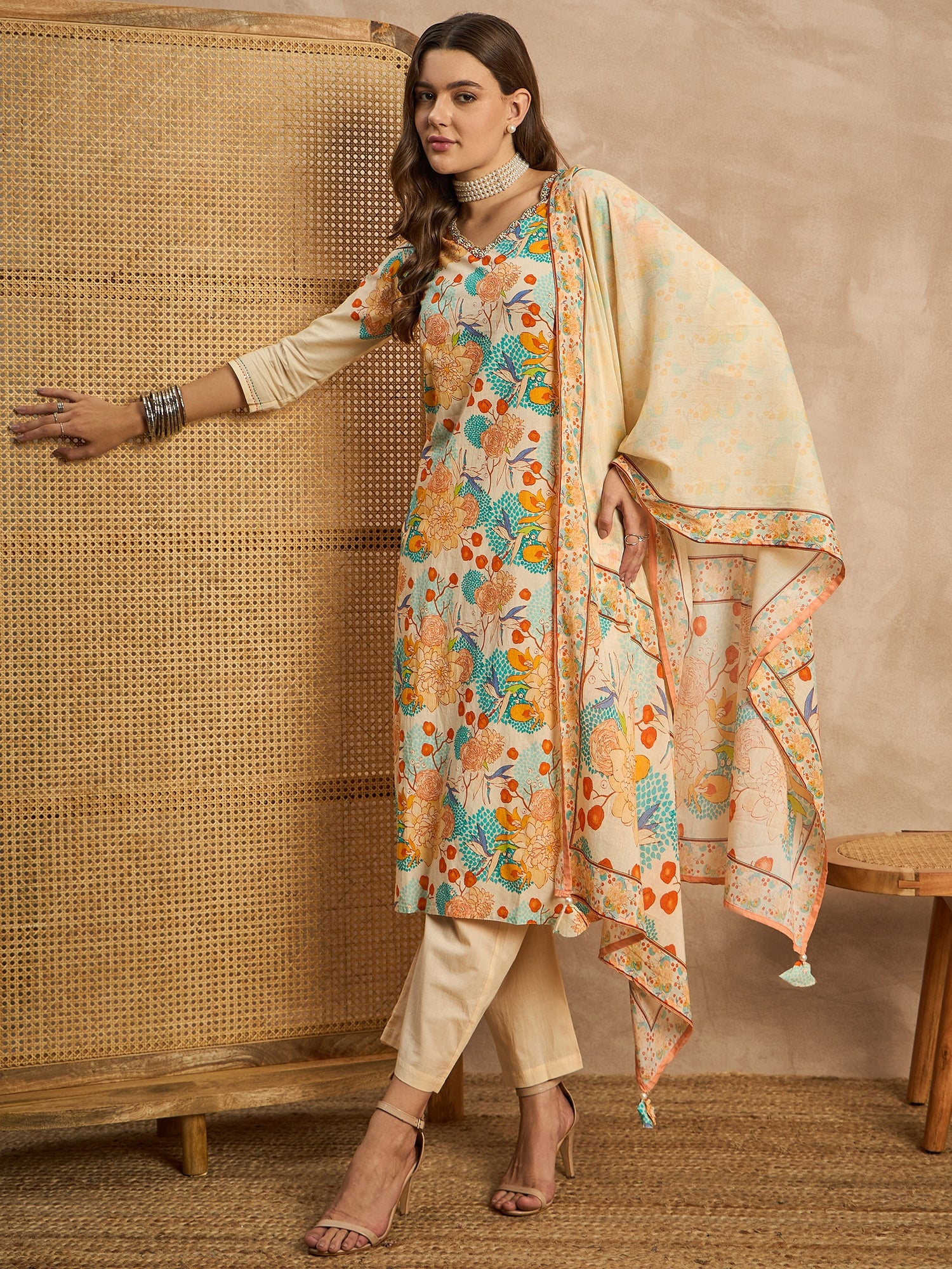 Cream-coloured, Blue & Orange printed Kurta with Trousers with dupatta