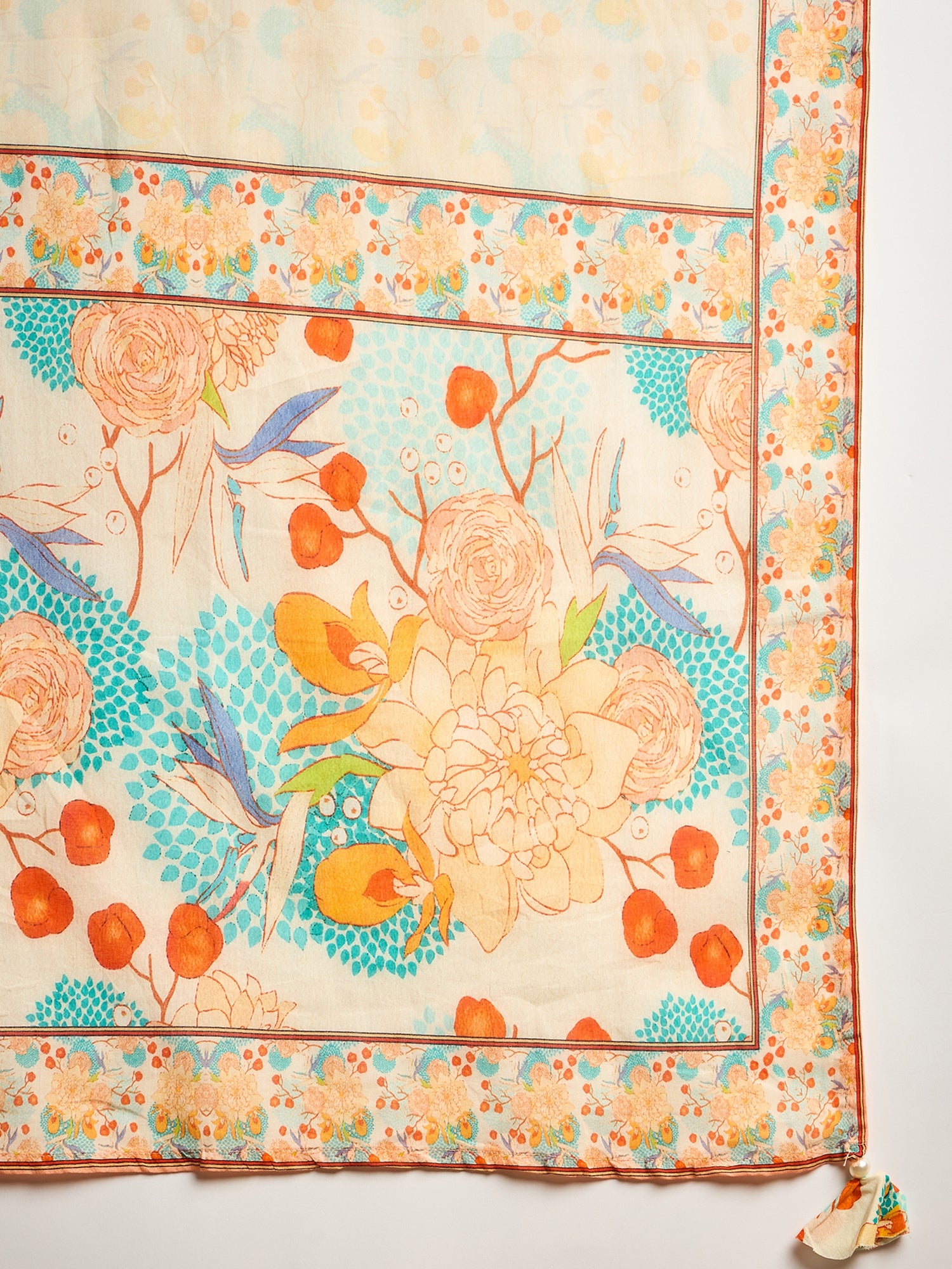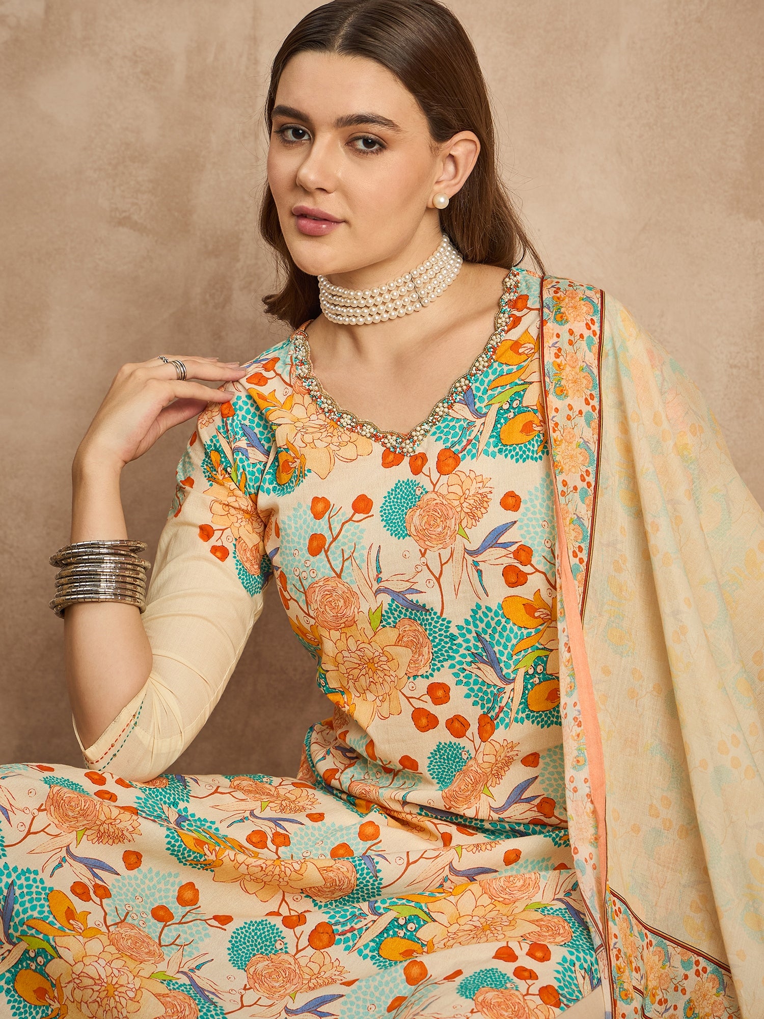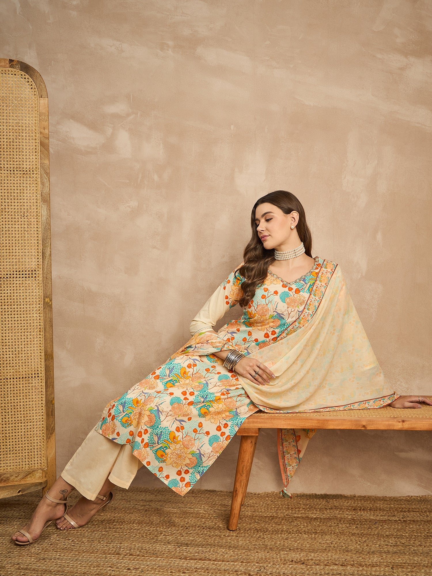 Cream-coloured, Blue & Orange printed Kurta with Trousers with dupatta
