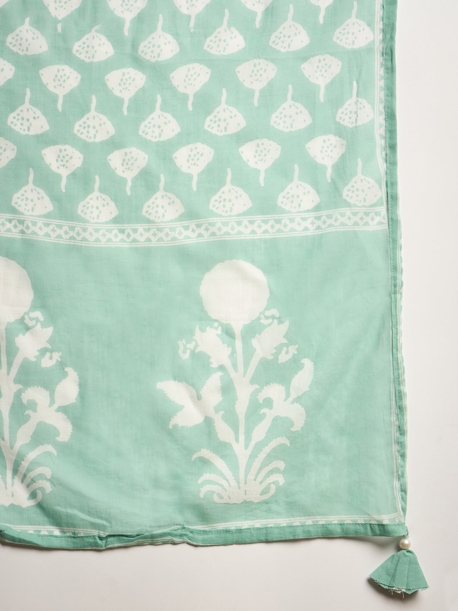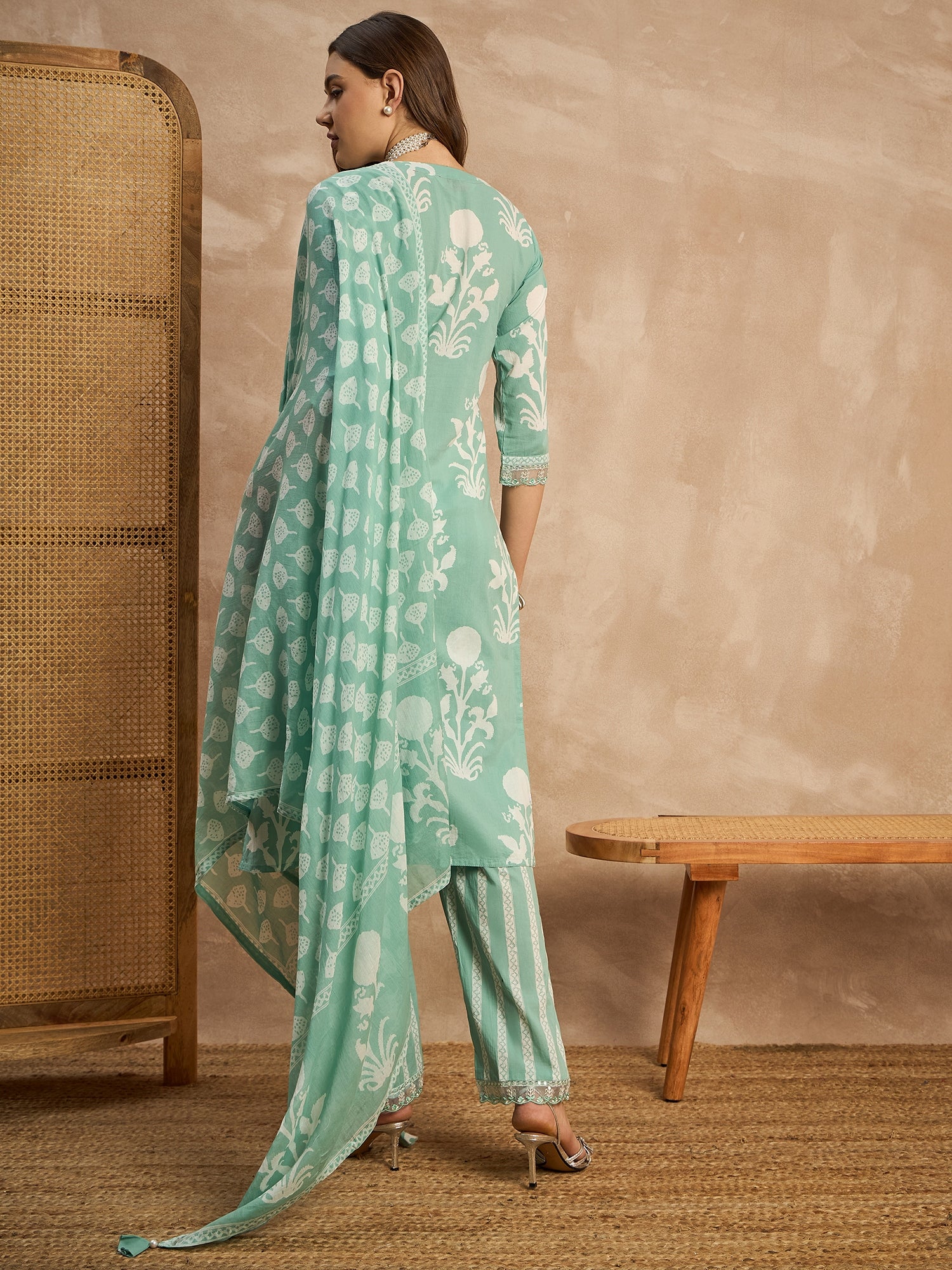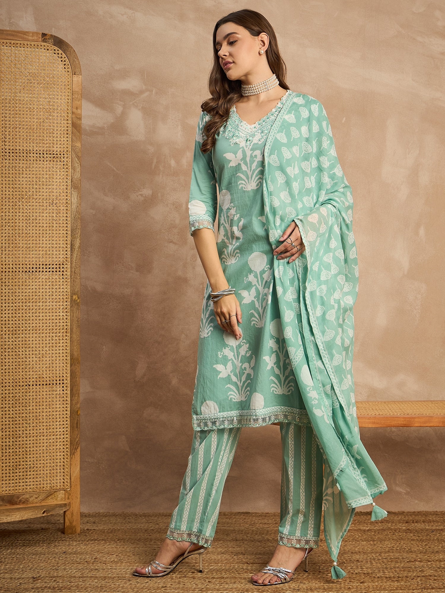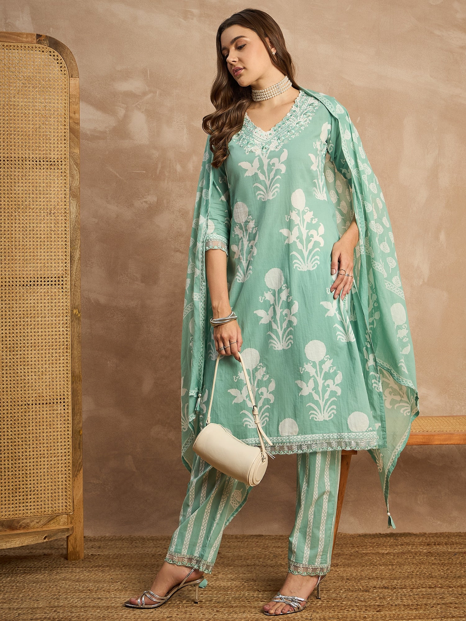 Women Floral Printed Beads and Stones Pure Cotton Kurta with Trousers & Dupatta