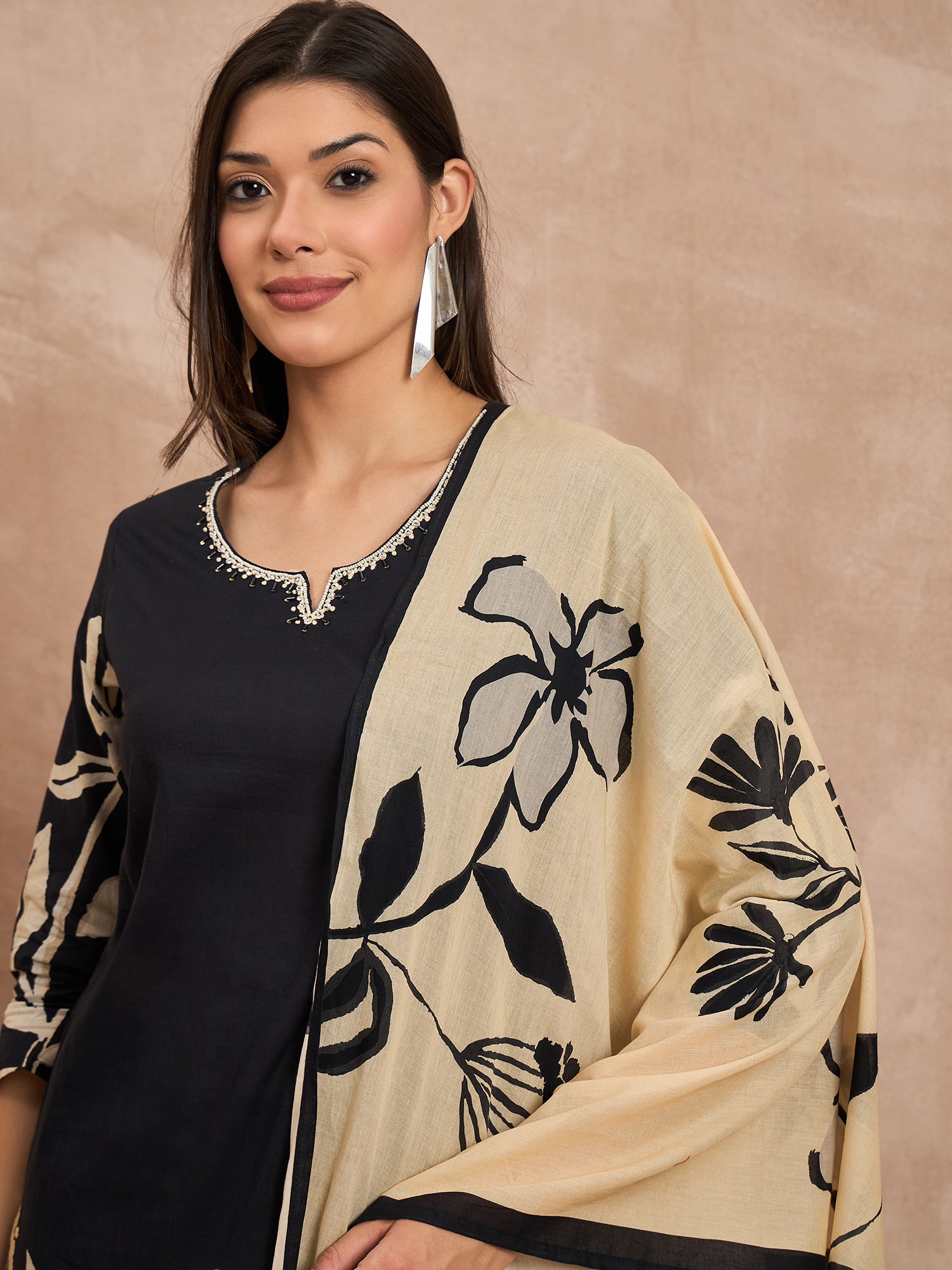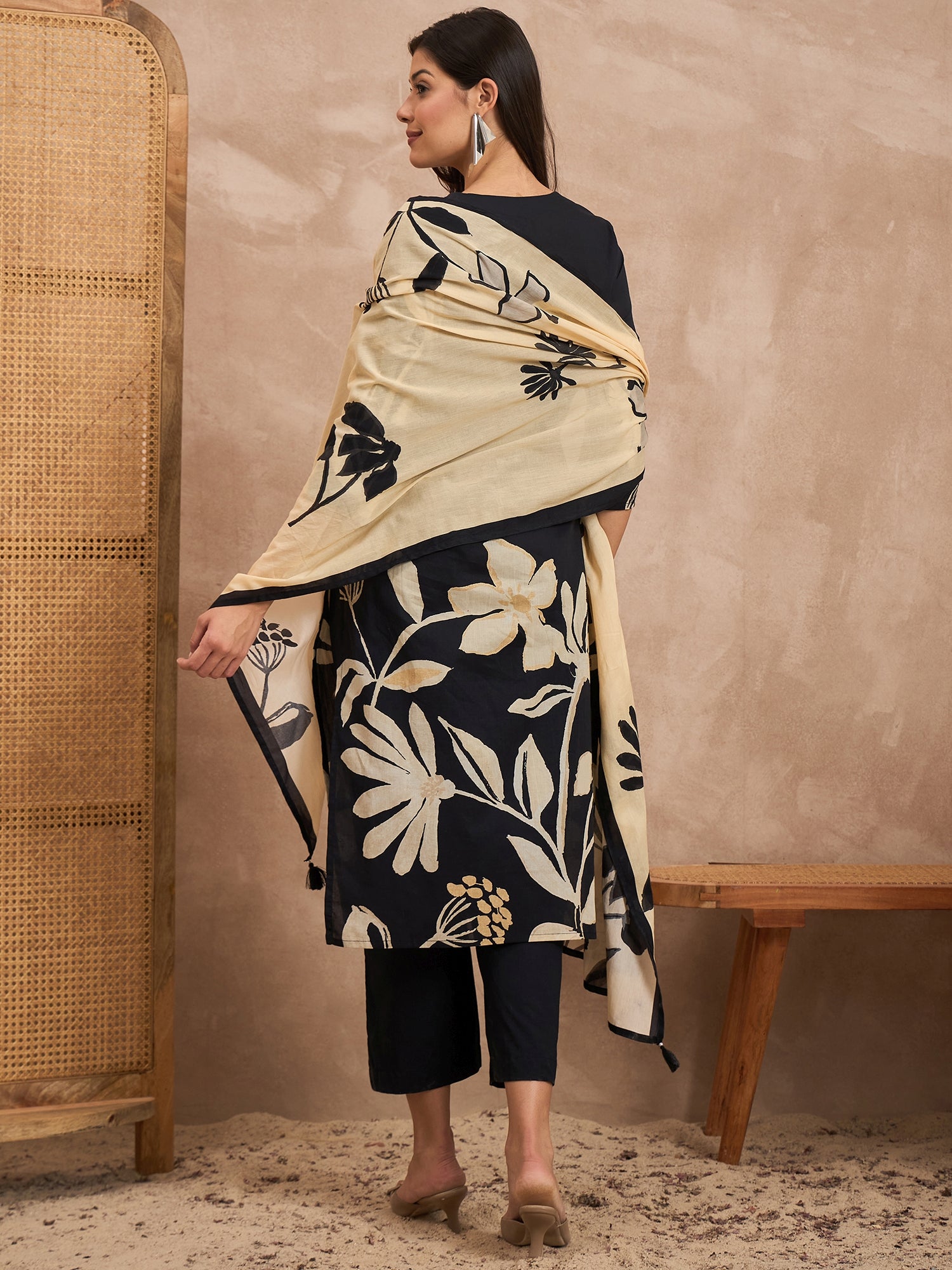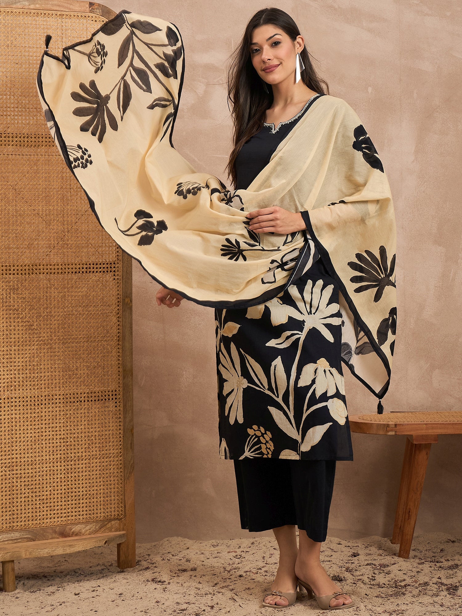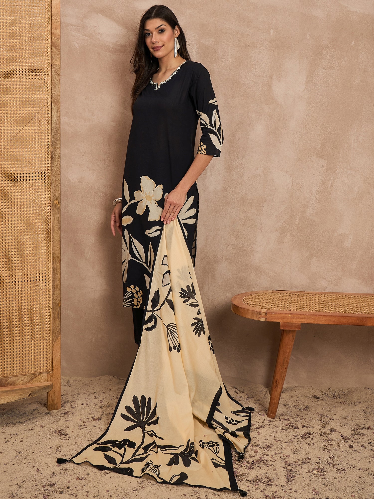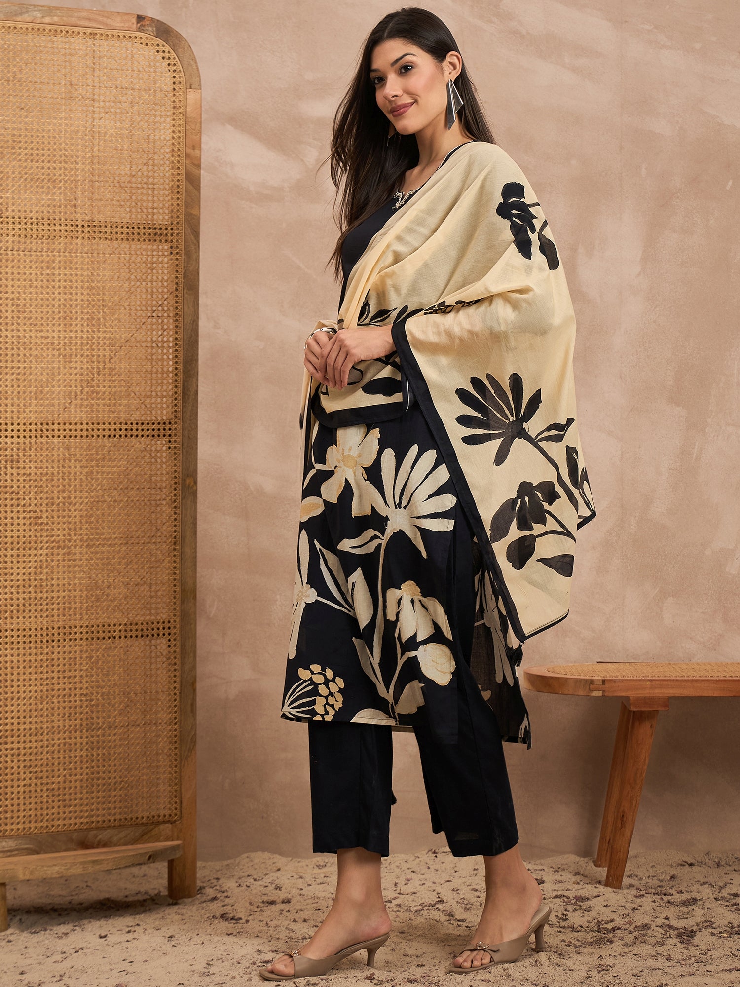 Black & Beige Printed Kurta with Trousers & Dupatta
