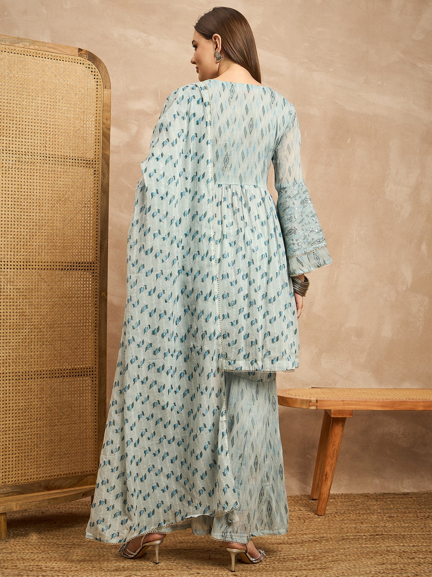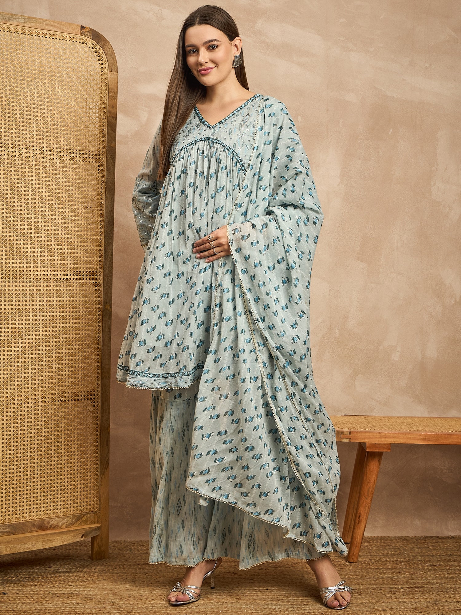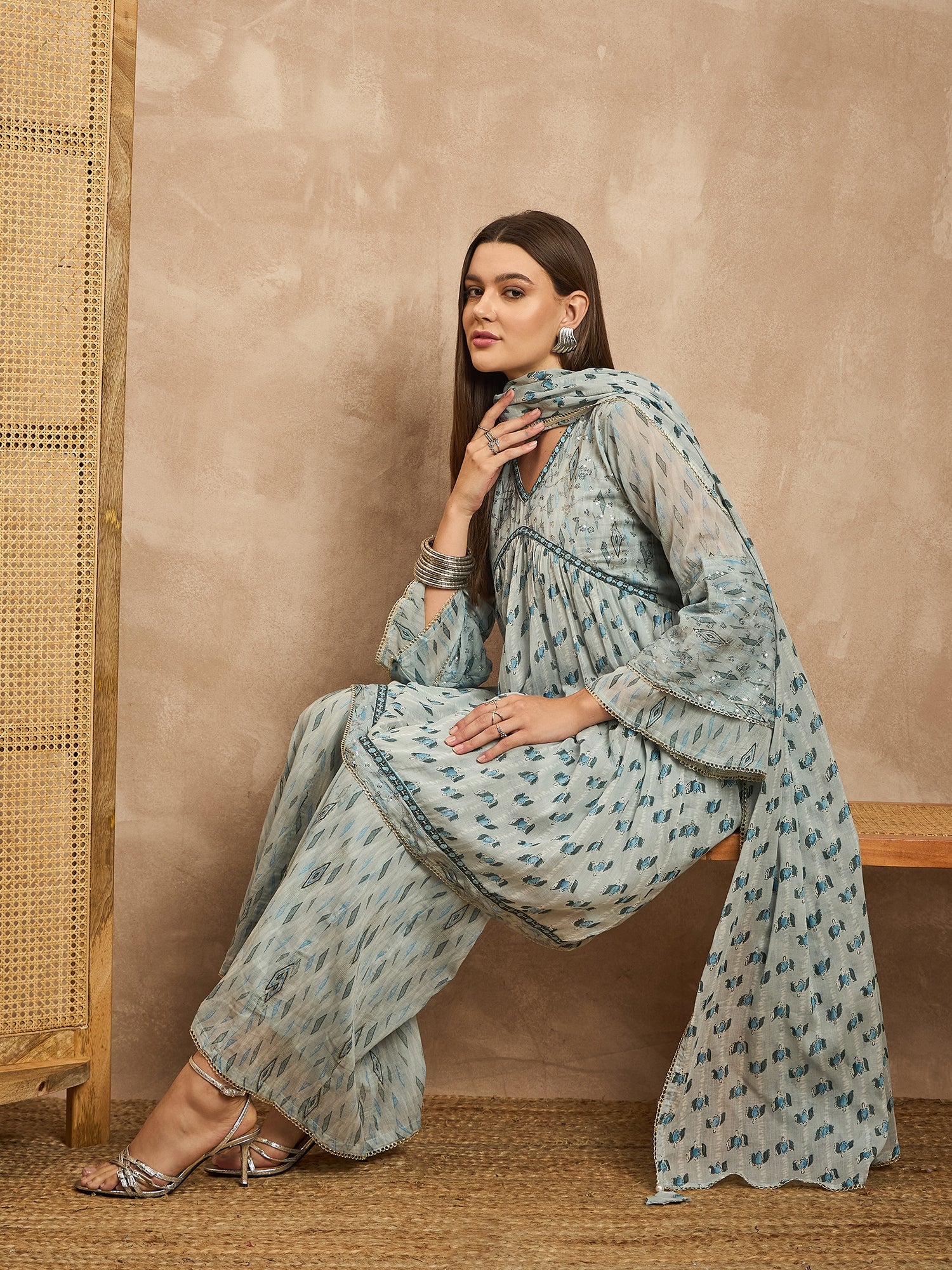 Women Floral Printed Empire Beads and Stones Kurta with Sharara & With Dupatta