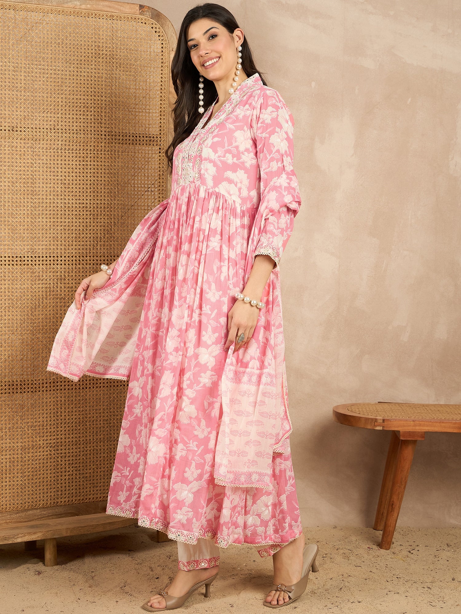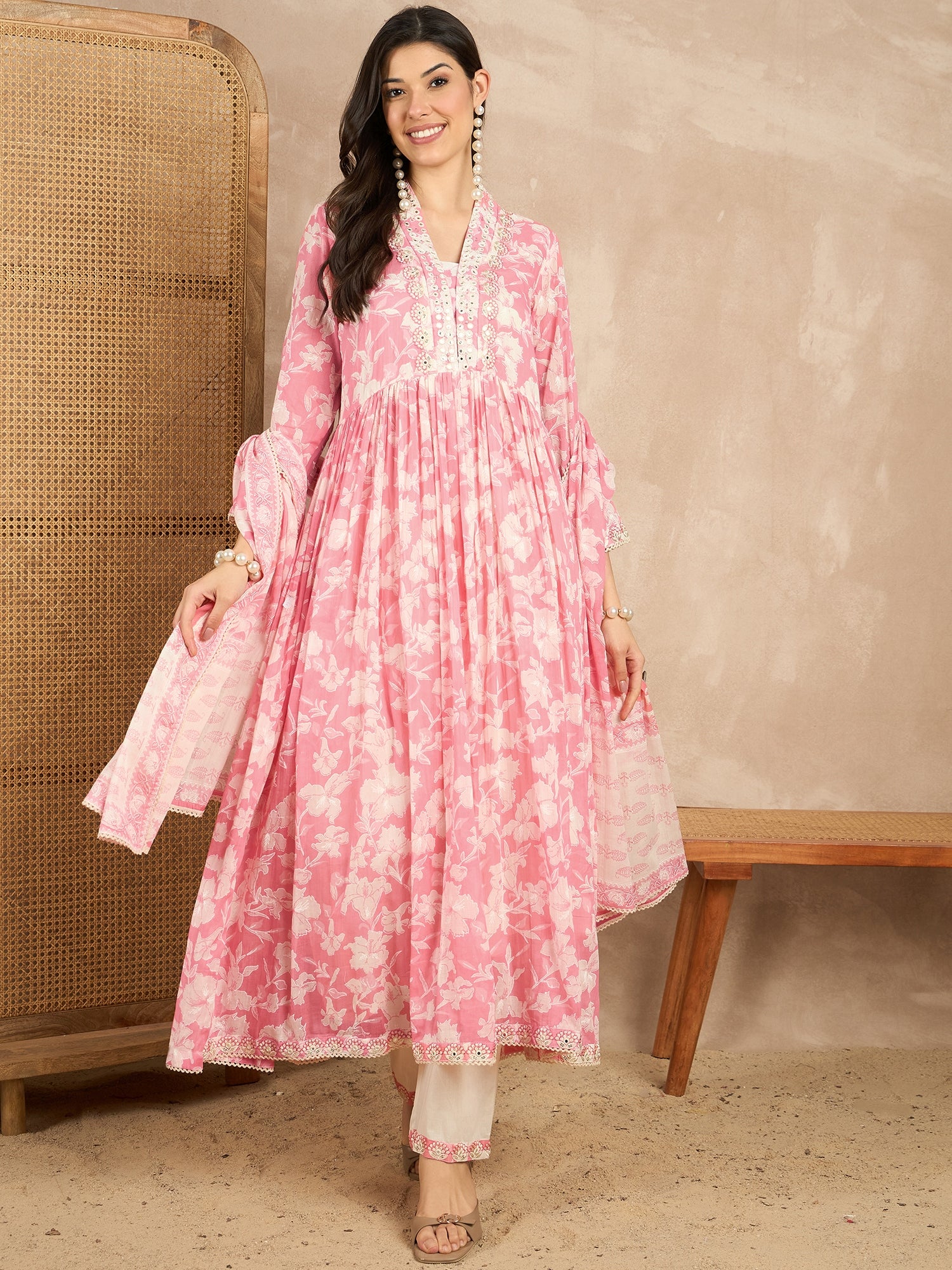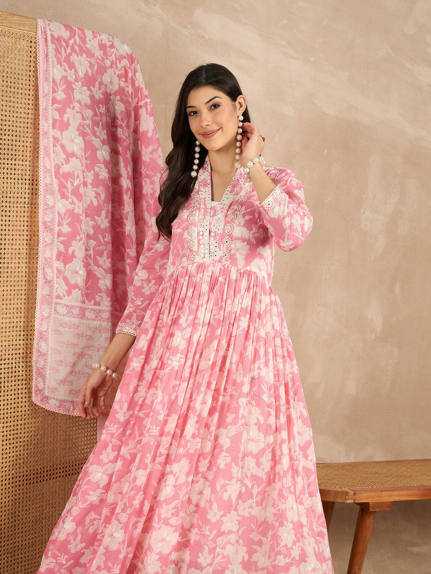 Women Floral Printed Pleated Mirror Work Kurta with Trousers & With Dupatta