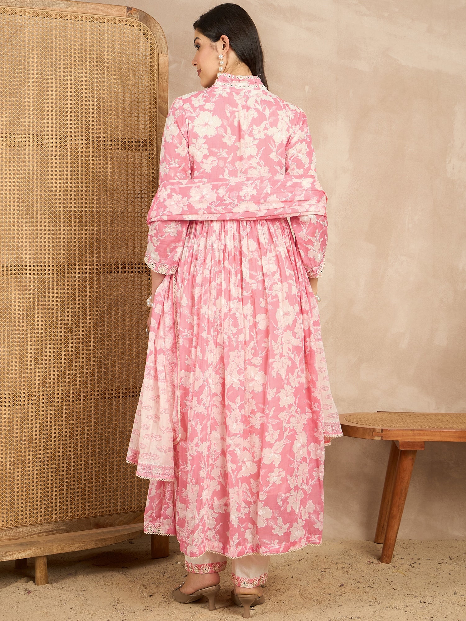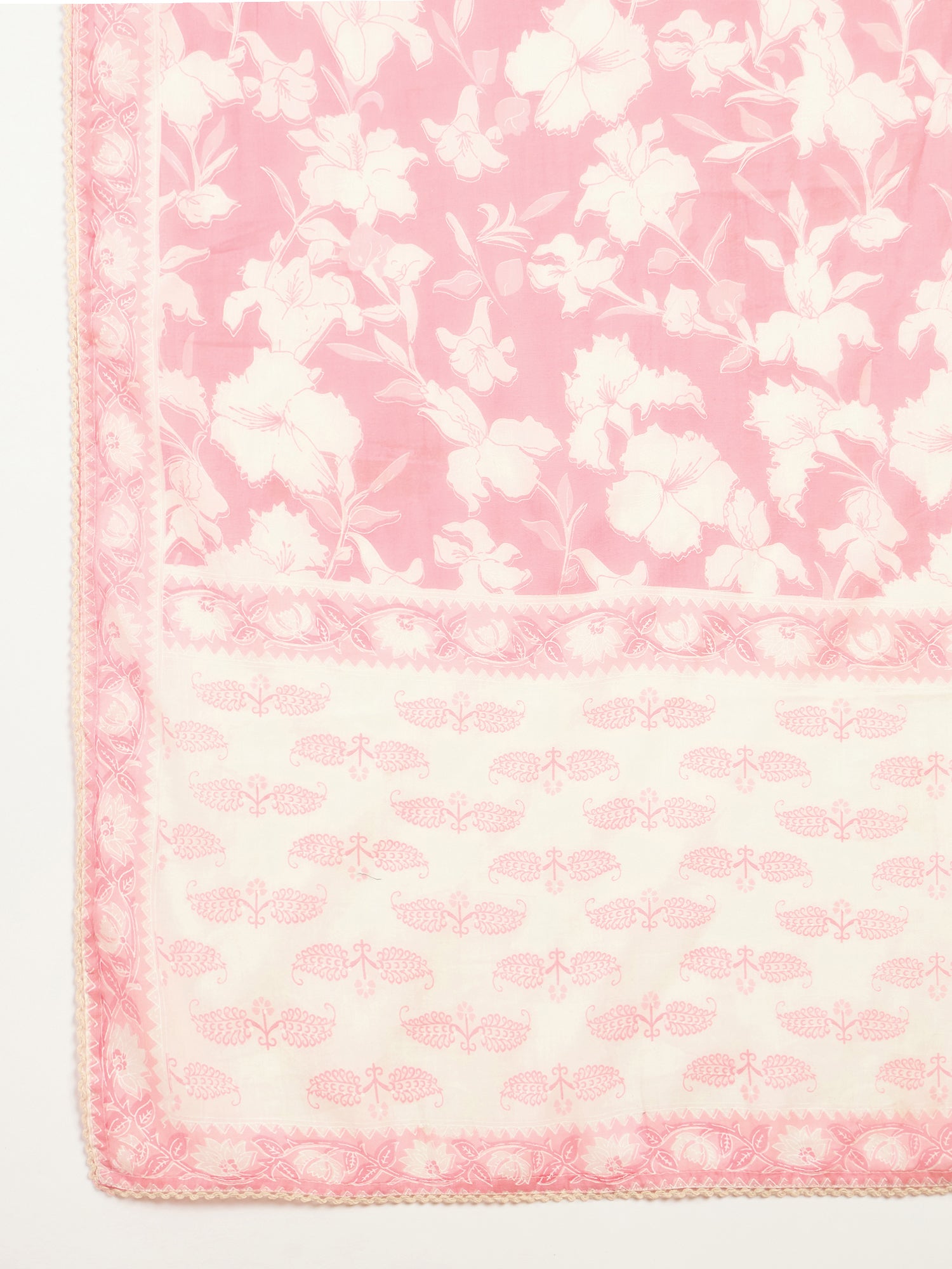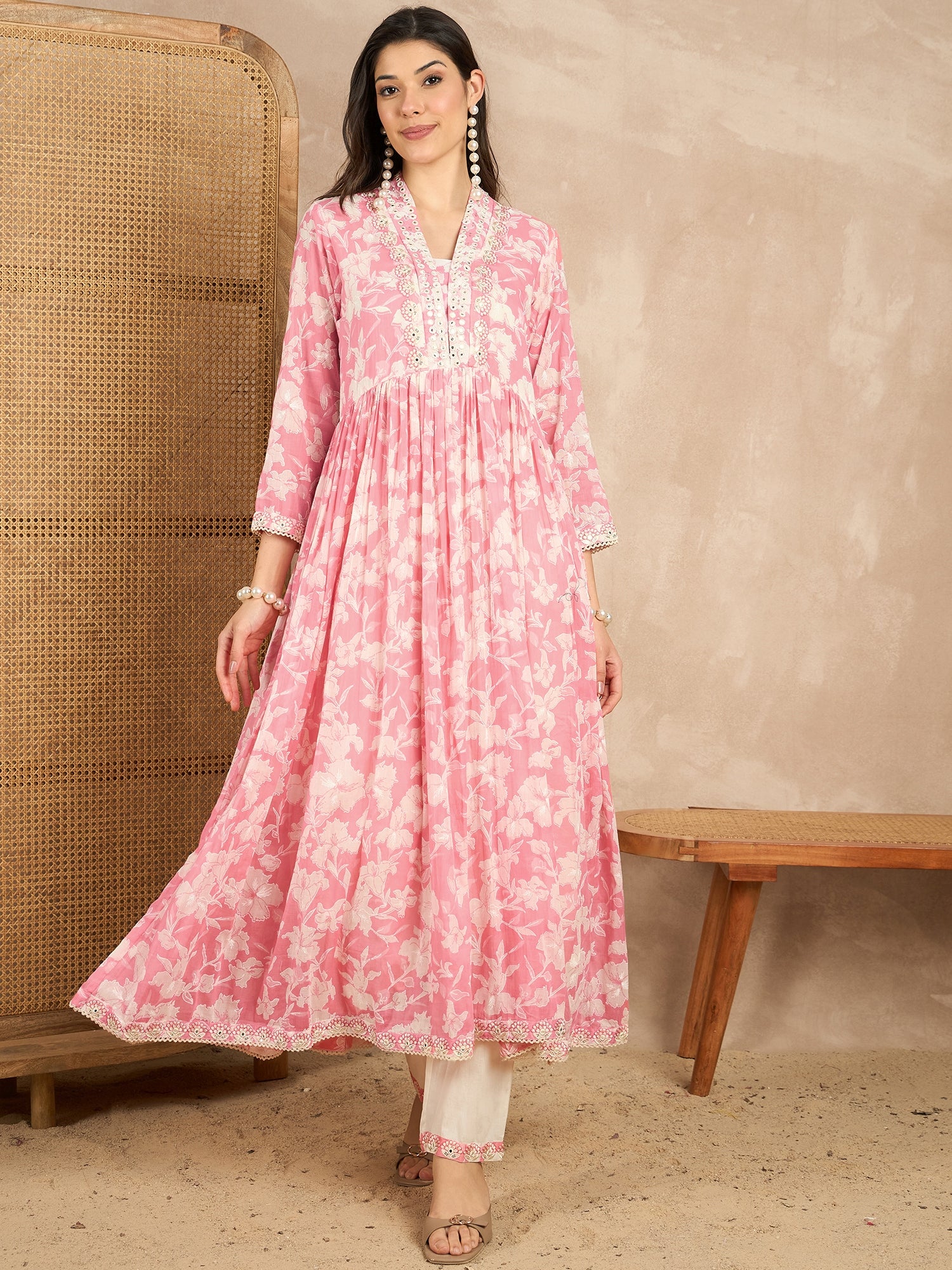 Women Floral Printed Pleated Mirror Work Kurta with Trousers & With Dupatta