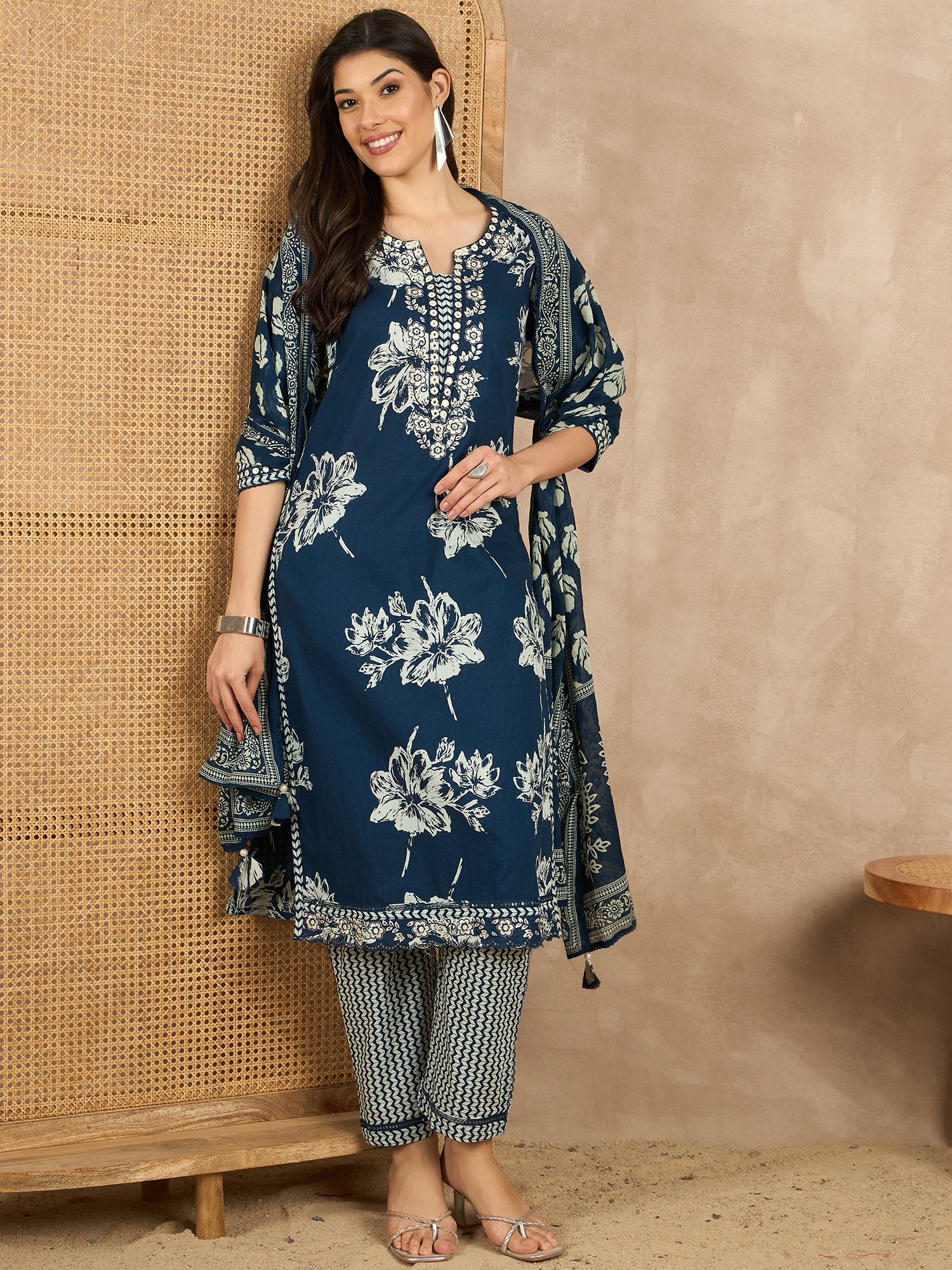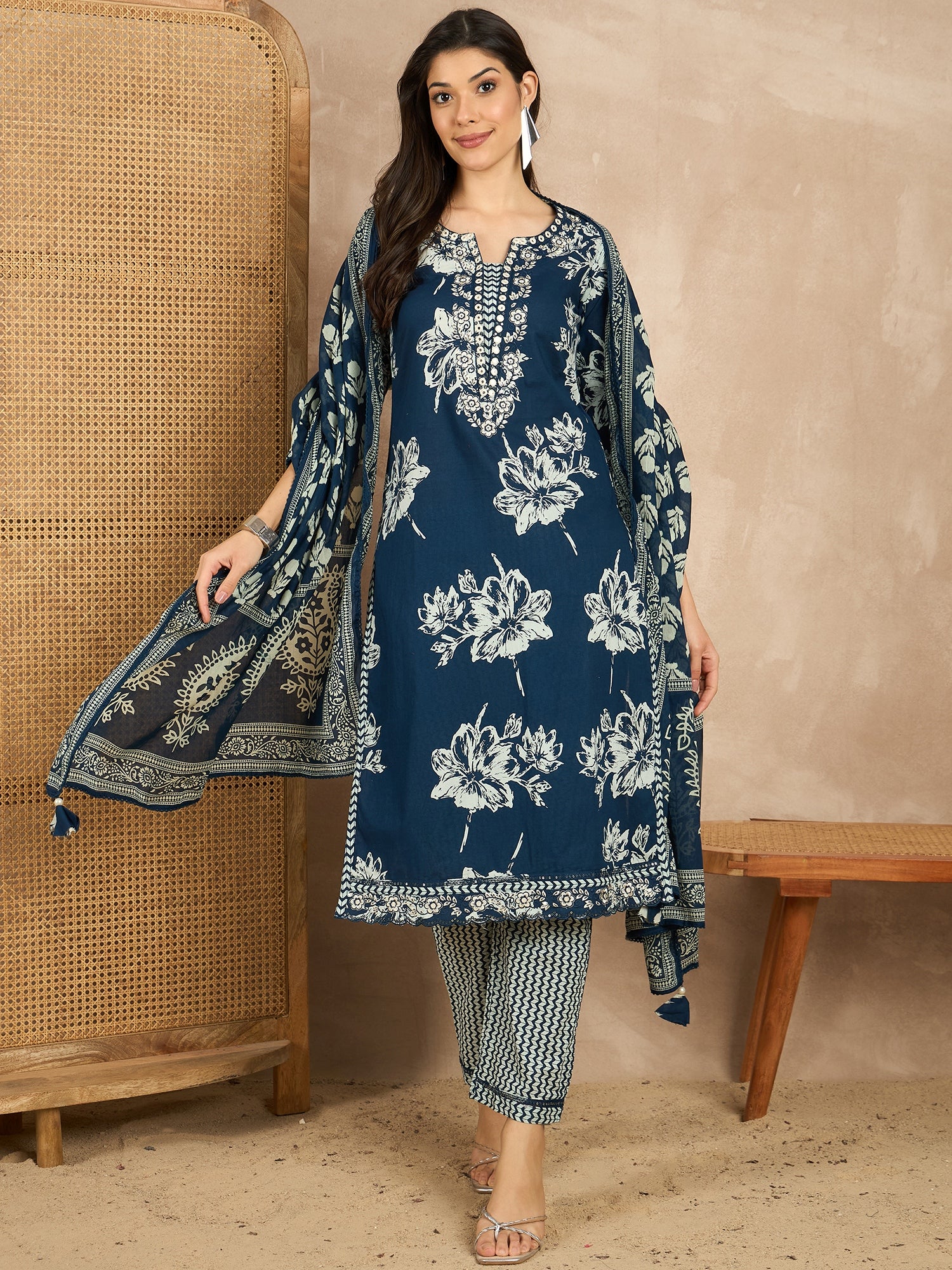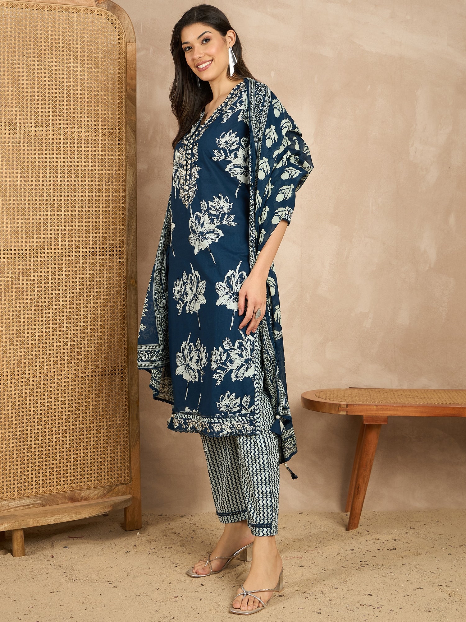 Navy blue printed Kurta with Trousers with dupatta