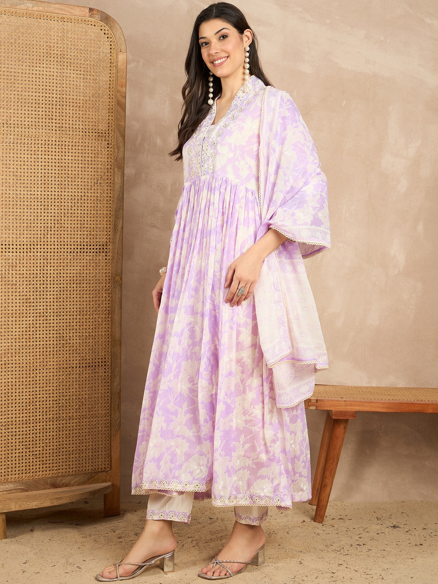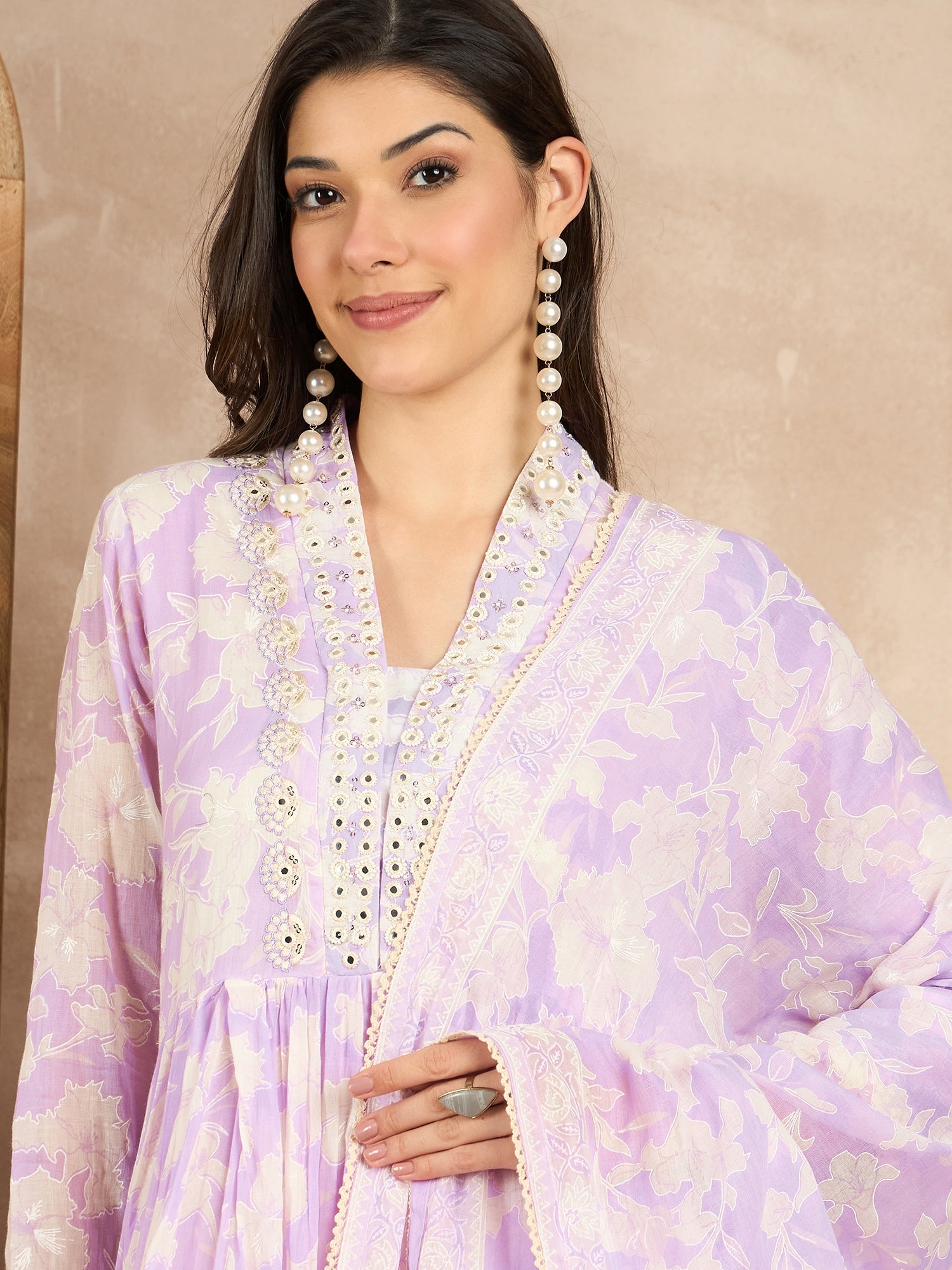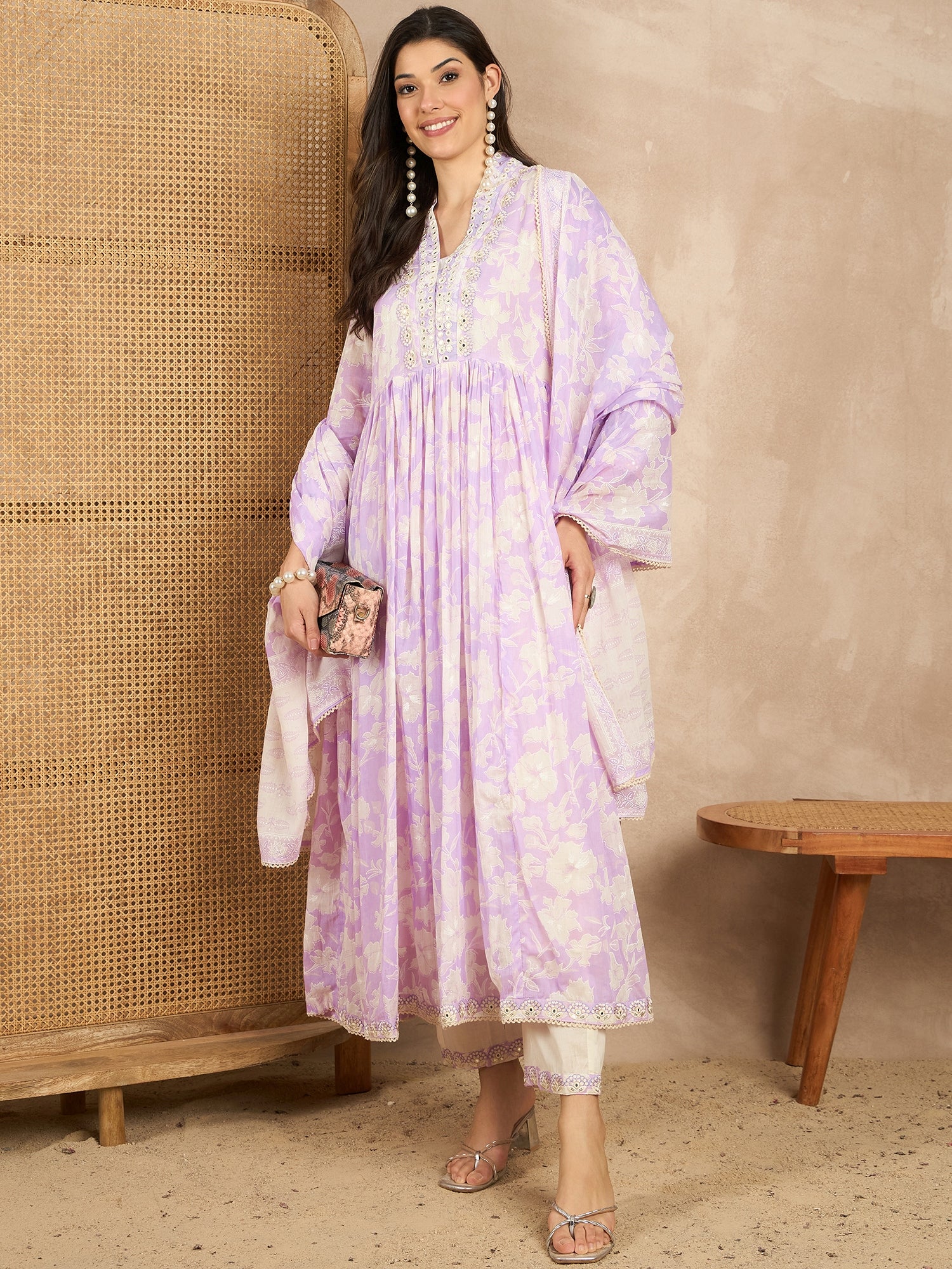 Women Printed Pleated Mirror Work Kurta with Trousers & With Dupatta